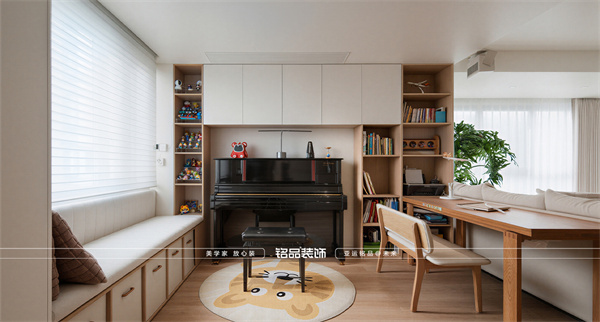 書房結(jié)合儲物:利用墻面系統(tǒng)將書房與收納功能無縫銜接,保持視覺整潔的同時,提供靈活的工作與儲物場景。
