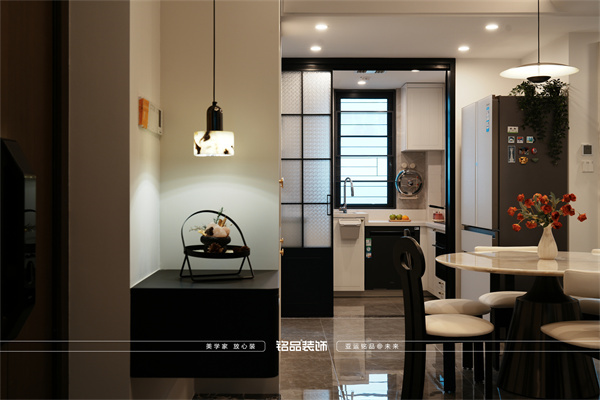 材質(zhì)與光影互動:將廚房移門改造為三聯(lián)動海棠玻璃移門,其獨特的朦朧質(zhì)感既區(qū)隔空間,又引入靈動光影,成為公共區(qū)域的一處藝術裝置。