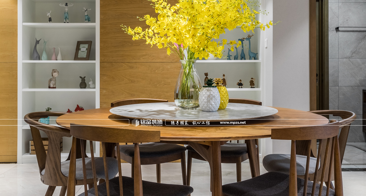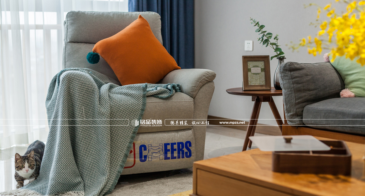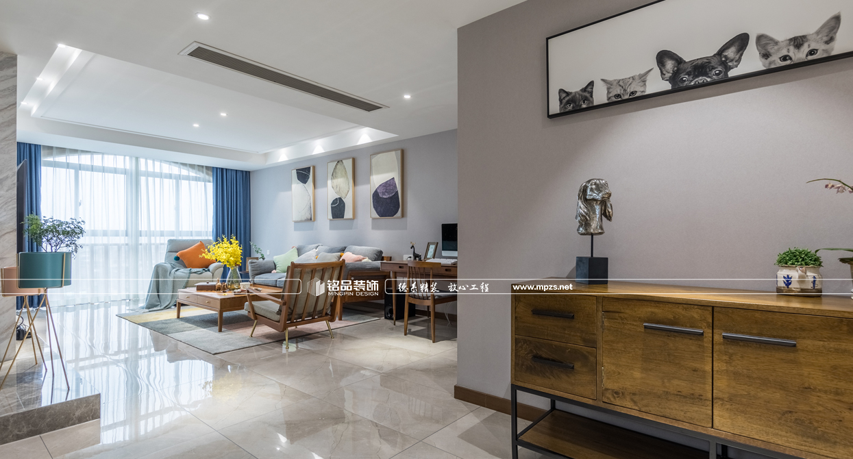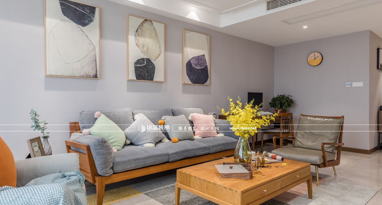 通過材質(zhì)的運(yùn)用,把空間進(jìn)行合理的劃分,完美呈現(xiàn)出北歐風(fēng)格的靈魂。延續(xù)硬裝設(shè)計(jì)與材質(zhì)上奠定的雅致,在沉穩(wěn)的空間基調(diào)上,植入生動的軟裝表現(xiàn)手法。以步步帶入的層疊關(guān)系逐步渲染出整個空間的格調(diào)與品質(zhì)??蛷d大面積大灰白石材背景的利用,增加了空間的層次感,墻面掛裝飾畫使墻面看起來不會過于蒼白,更加生動豐富,優(yōu)雅又有藝術(shù)氣息,提升格調(diào),讓空間中的重點(diǎn)之處富有活力,固定式的石材地臺取代傳統(tǒng)的電視柜給人以簡約大氣感覺,整個空間以灰調(diào)做底配上原木系家具,使整個房子生動而富有情感,讓身心放松自在。