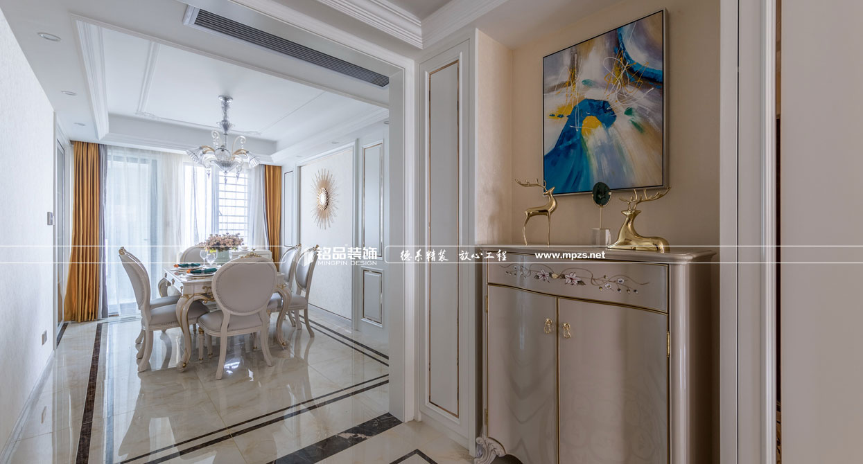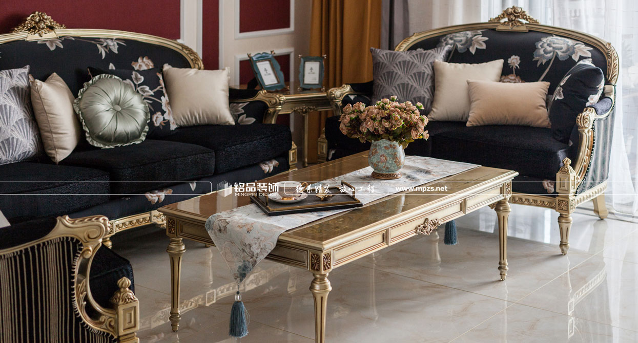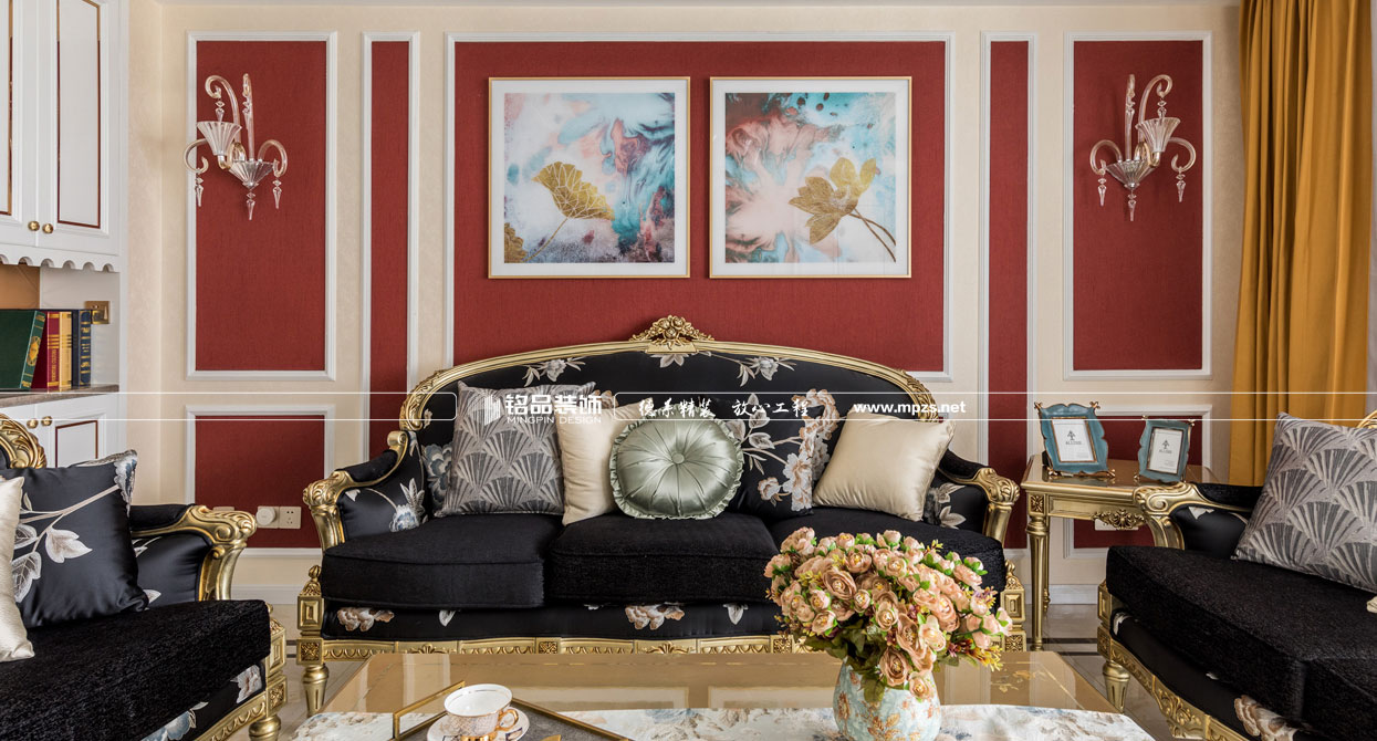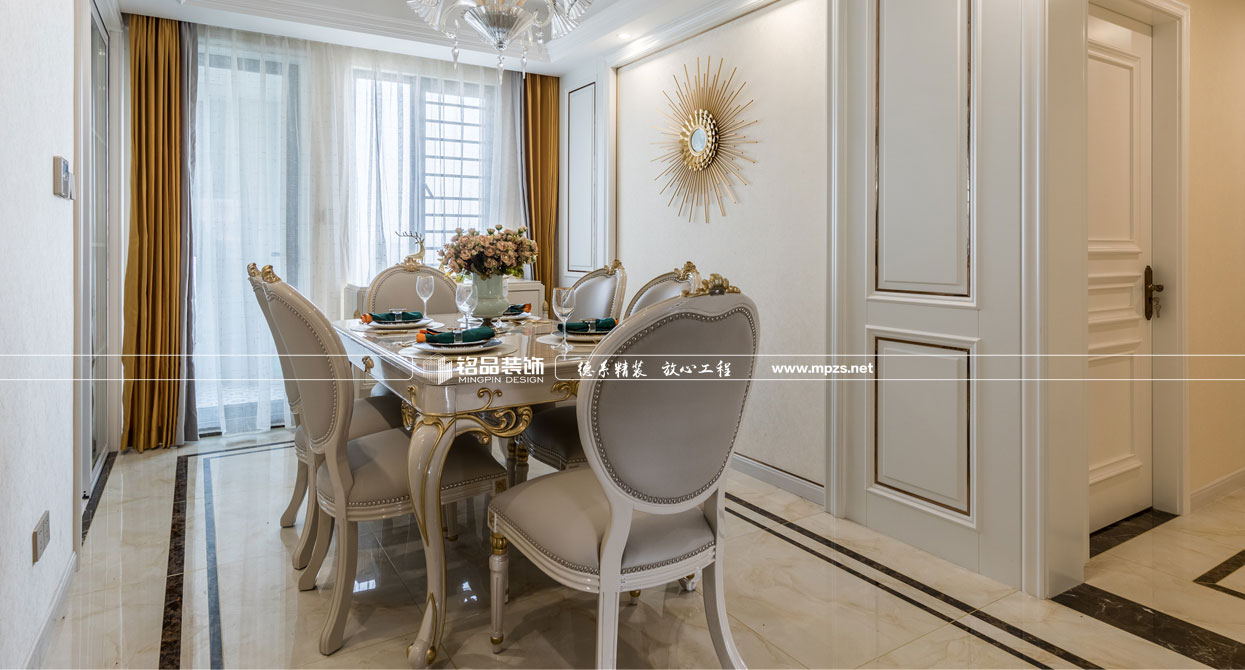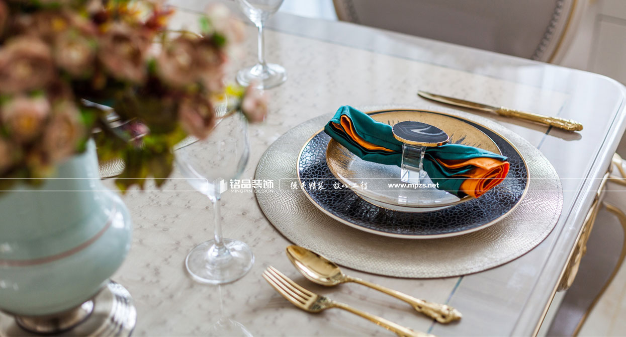 同樣的復(fù)古情調(diào),不一樣的味道??蛷d色調(diào)以米黃色為基底,玫瑰金的線條點綴,整面流線造型的沙發(fā)背景墻,給雅靜的空間帶來生機(jī)。餐廳,運用頂上雕花線與金屬欠條護(hù)墻裝飾空間,線條的運用像一條完美的分割線,發(fā)掘了整個空間細(xì)膩華麗的風(fēng)采