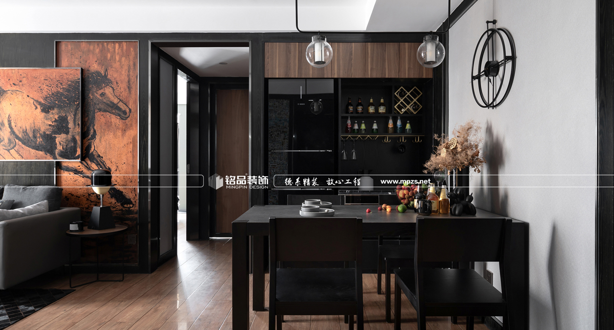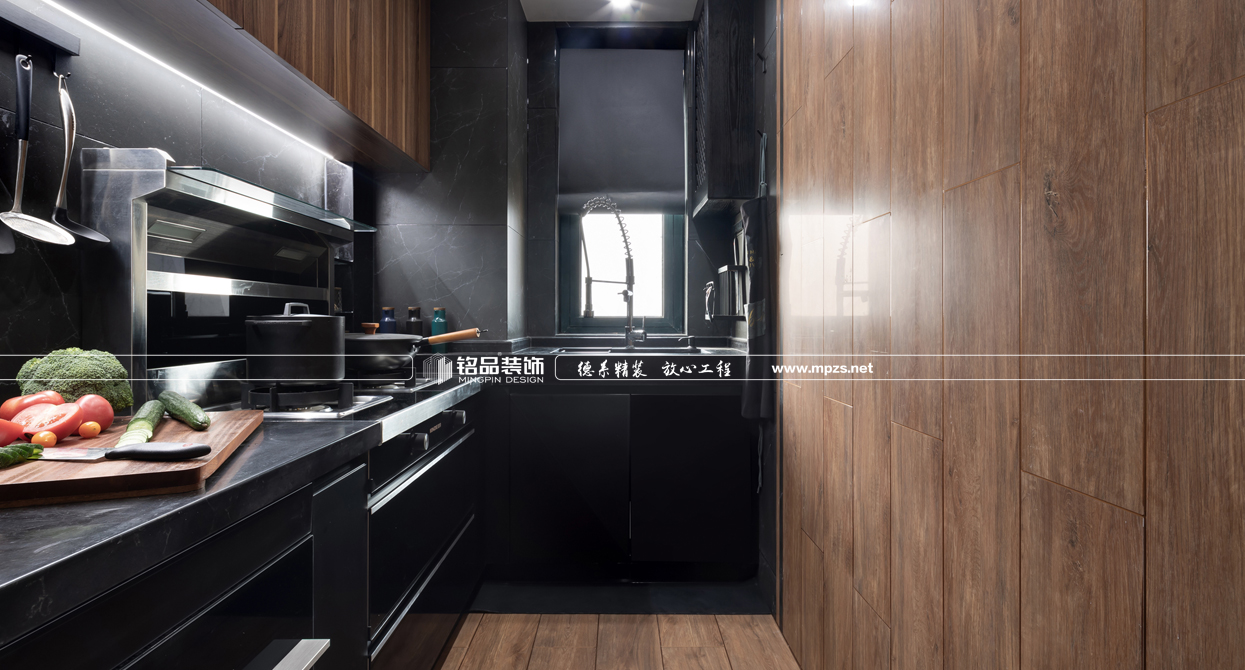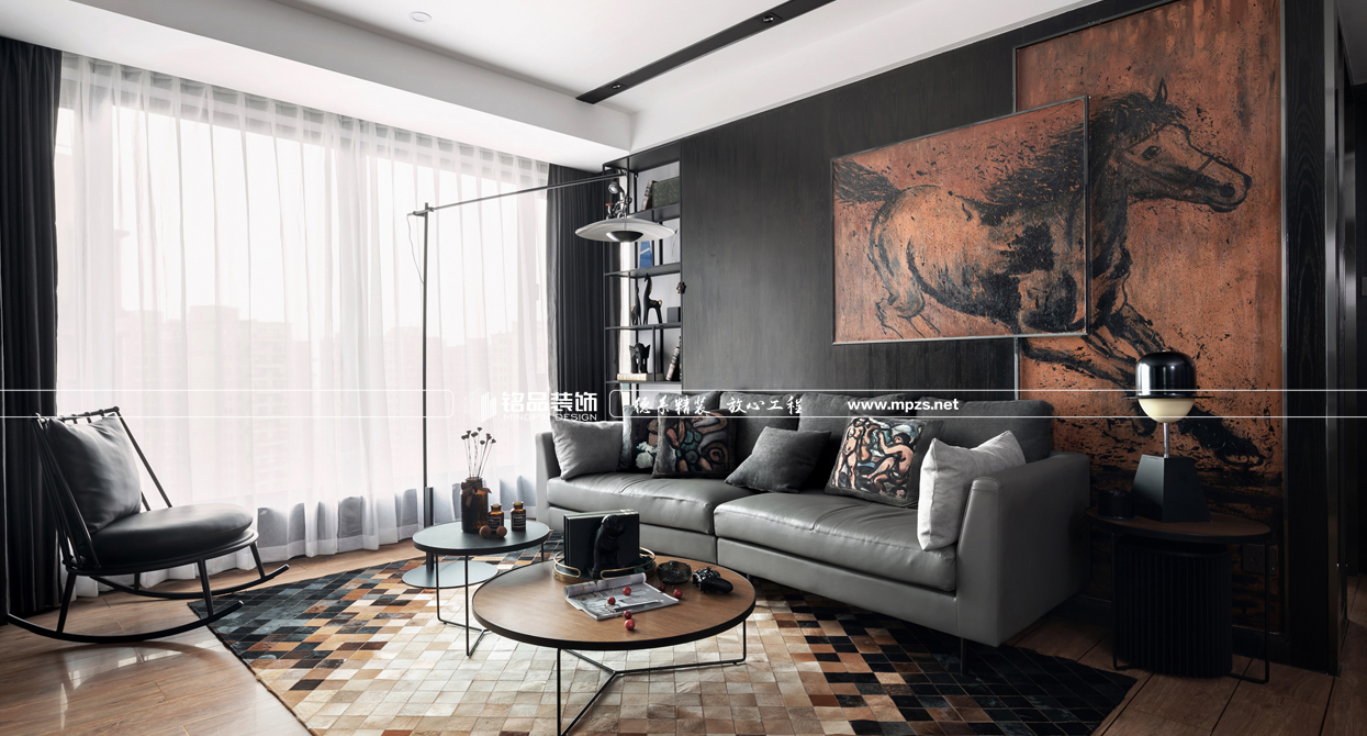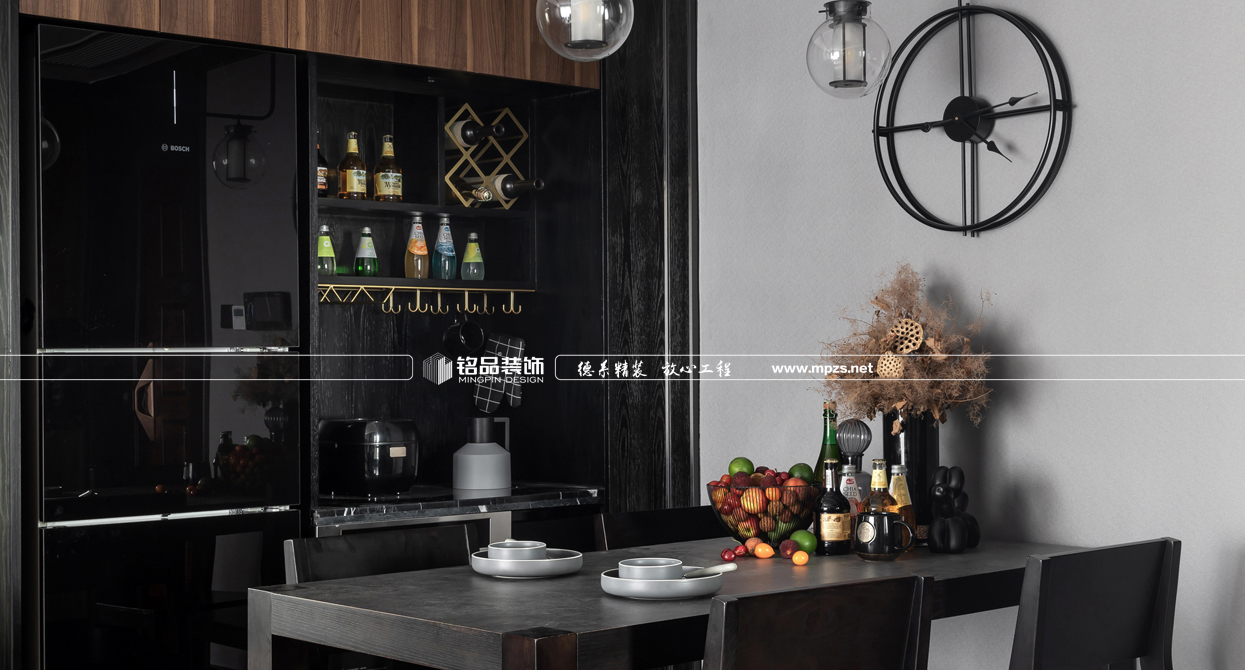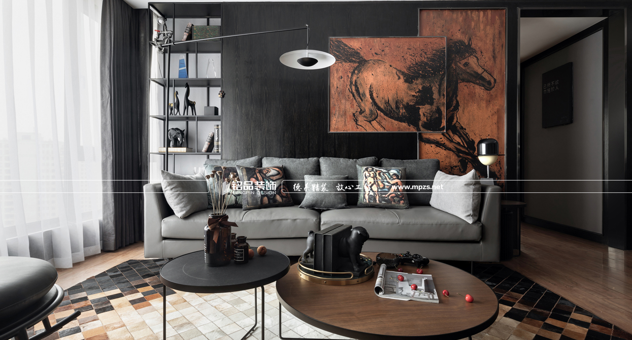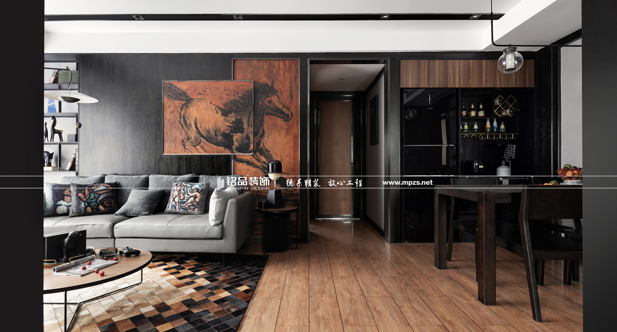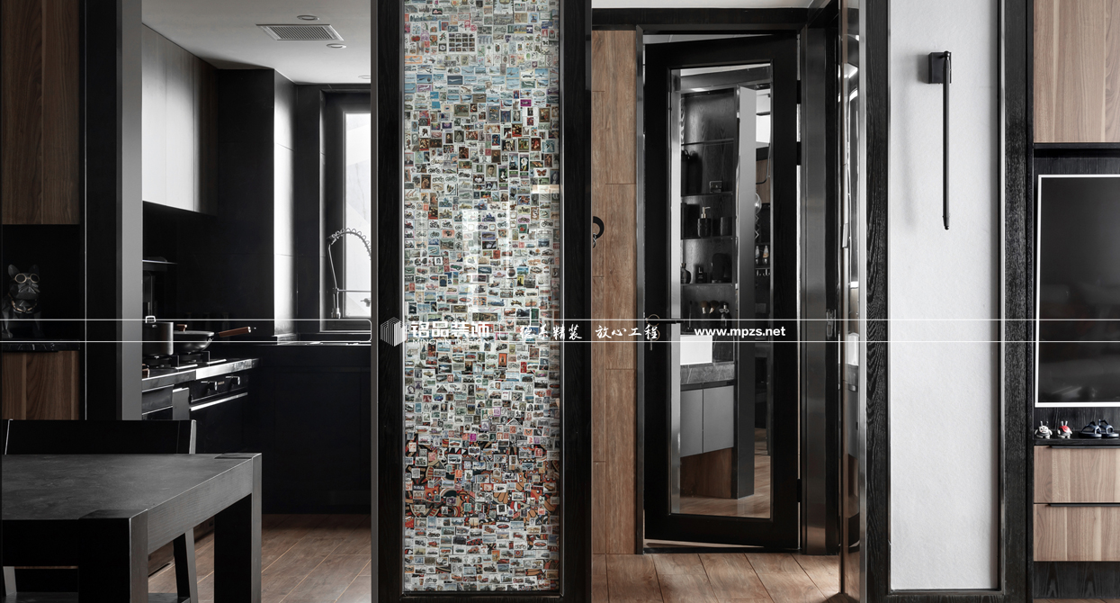 黑色的露紋面板+胡桃木的門板+黑色不銹鋼,廚房門邊的郵票墻是設(shè)計(jì)師花了7個(gè)小時(shí)一張張貼上去的,客廳沙發(fā)背后的墻繪也是設(shè)計(jì)師畫了一個(gè)多月的創(chuàng)作,