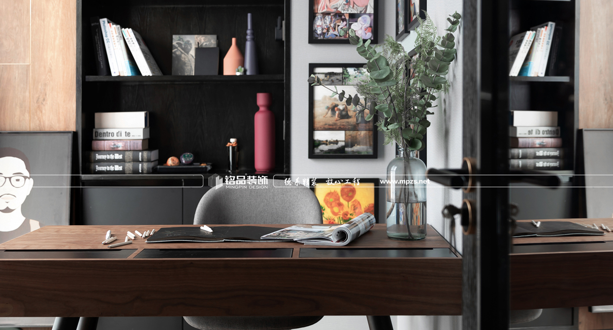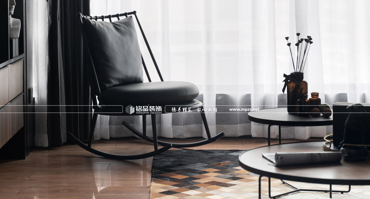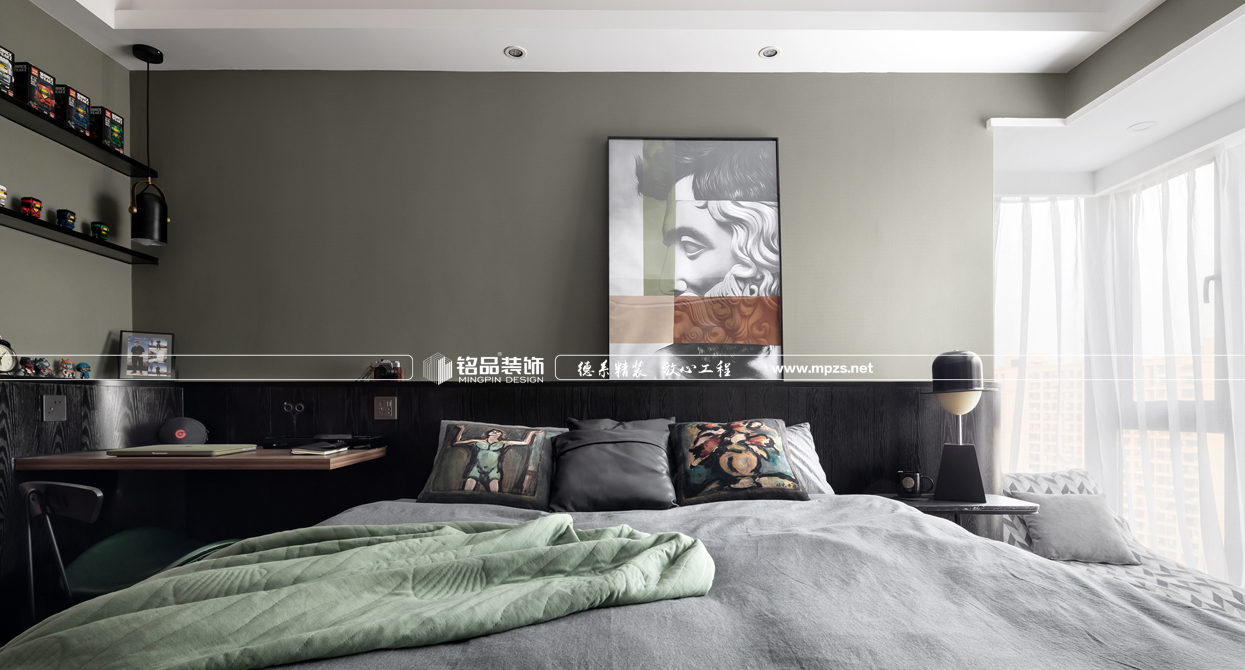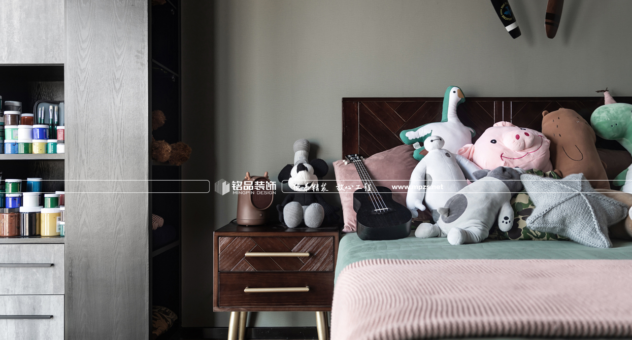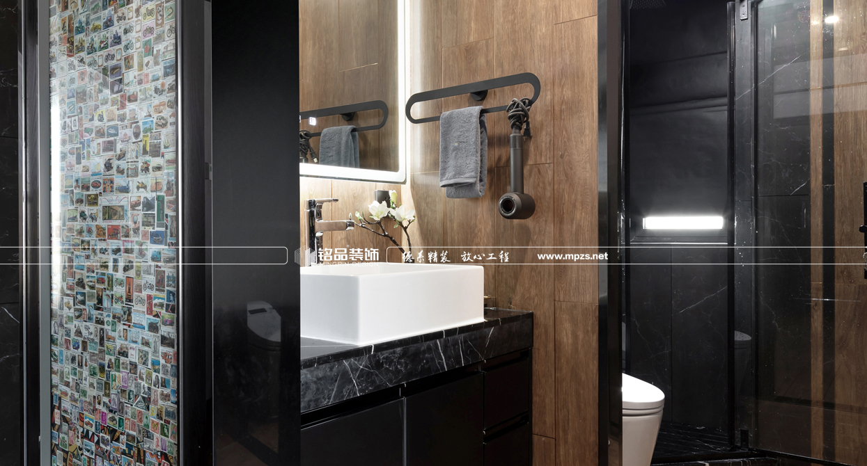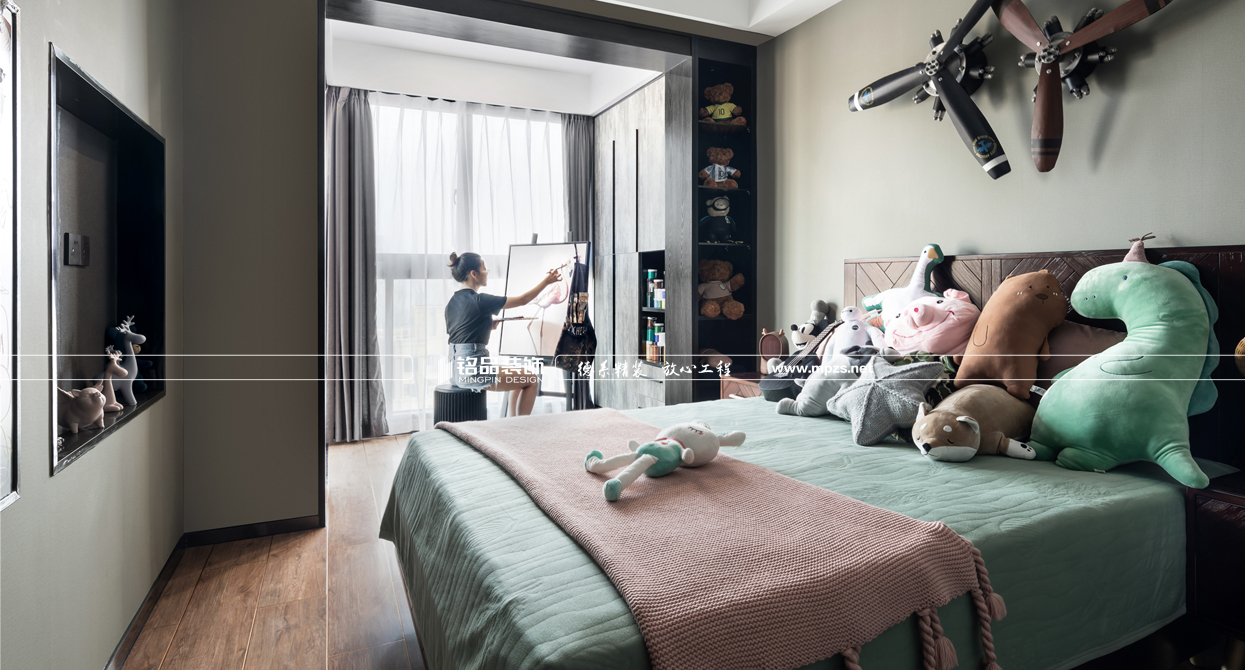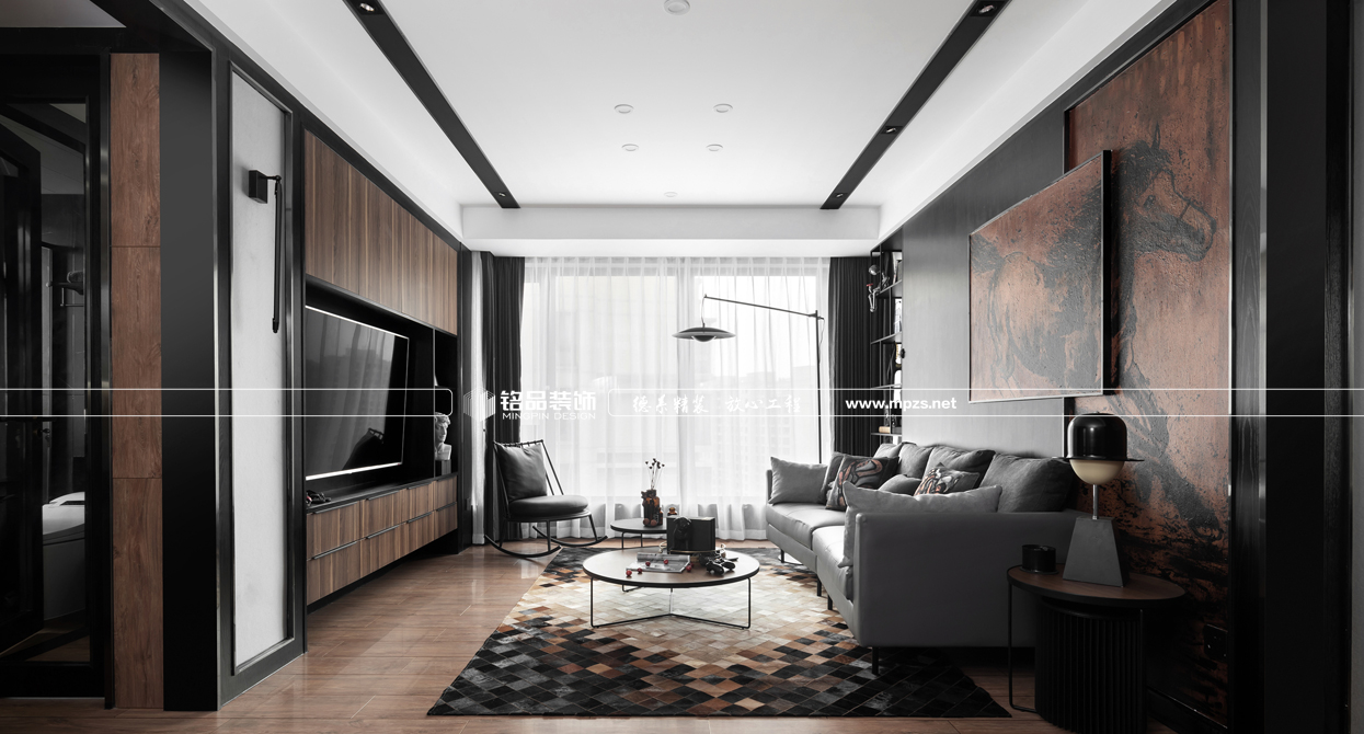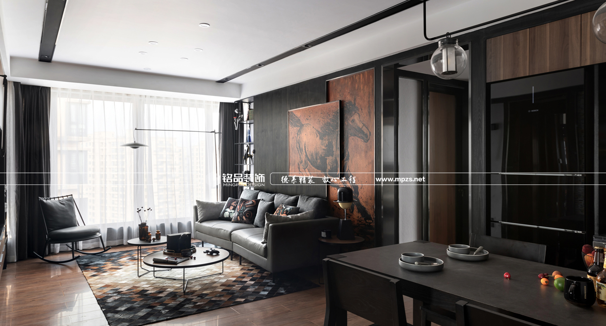 黑色的露紋面板+胡桃木的門板+黑色不銹鋼,廚房門邊的郵票墻是設(shè)計(jì)師花了7個(gè)小時(shí)一張張貼上去的,客廳沙發(fā)背后的墻繪也是設(shè)計(jì)師畫了一個(gè)多月的創(chuàng)作,