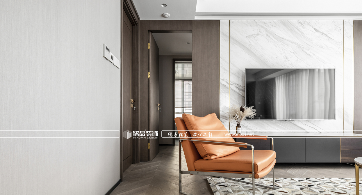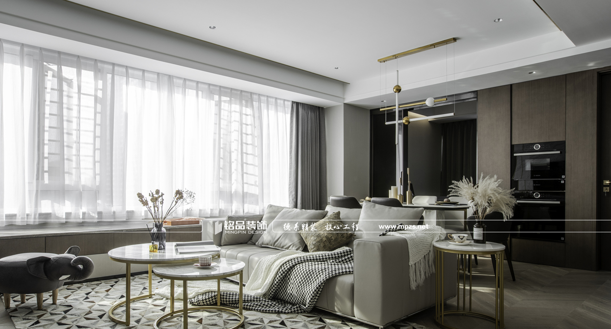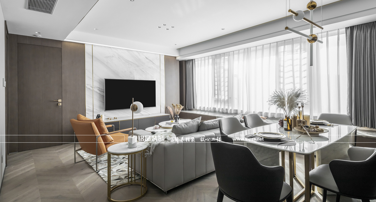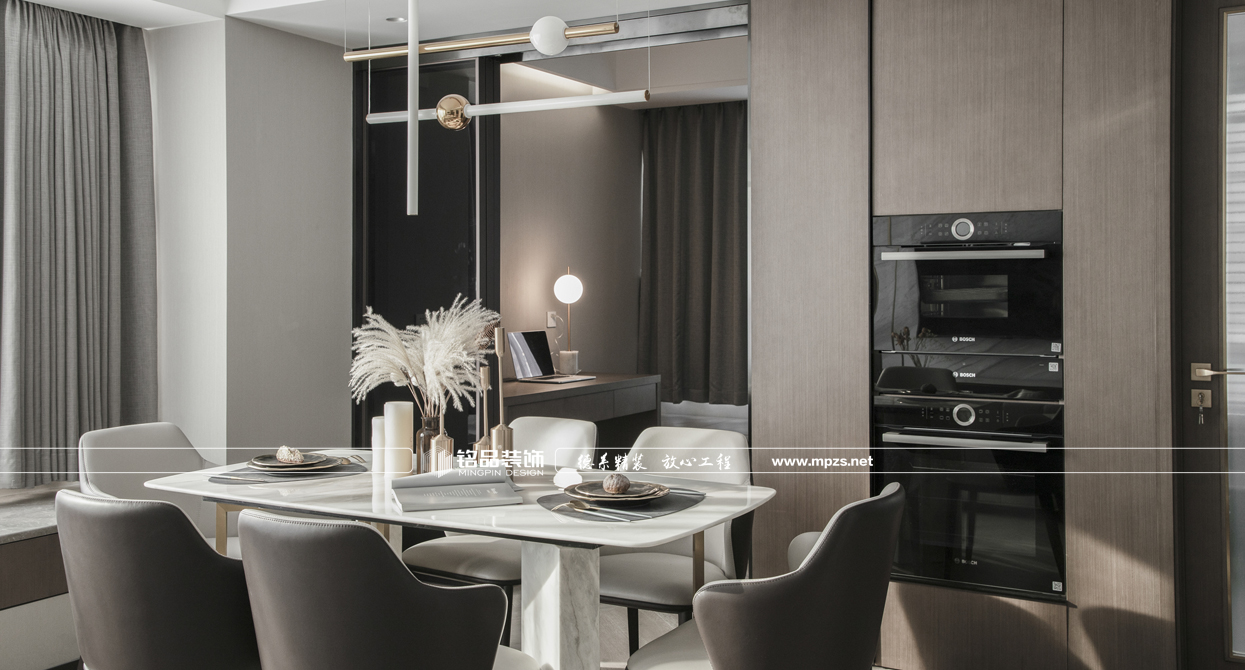輕奢裝修作為當(dāng)下比較精致的一種裝修方式,也體現(xiàn)了對(duì)生活的一種態(tài)度。本套杭州裝修案例整體采用灰白為基調(diào),加入自然的木色平衡空間的冷峻感,簡單的頂面采用金屬元素線條勾勒??蛷d地面通鋪灰色石紋地磚,加鋪灰色紋路地毯,提高空間的舒適性體驗(yàn),灰色系皮質(zhì)沙發(fā)呼應(yīng)現(xiàn)代感風(fēng)格的電視柜,大理石電視背景提升空間質(zhì)感。原木色客廳沙發(fā)背景,與黑色玻璃背景結(jié)合過度玄關(guān),餐廳與客廳場域,采用金屬元素做踢腳線與背景裝飾線條。 餐廳設(shè)置在與廚房入戶相鄰的動(dòng)線空間上,整個(gè)硬裝與客廳呼應(yīng),廚房的長虹玻璃門片也成為一道美麗的背景。