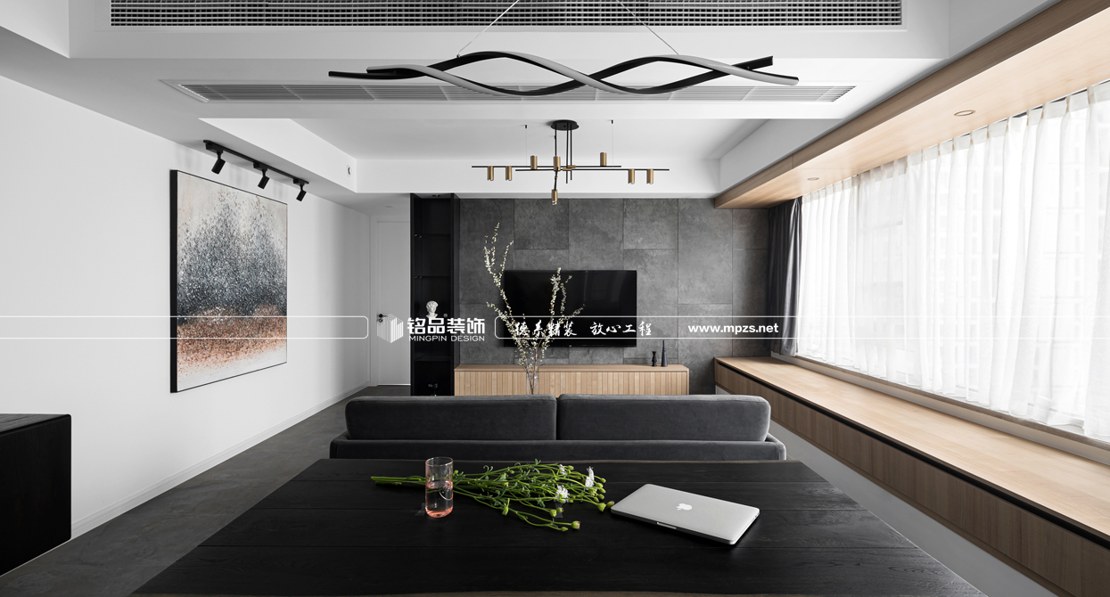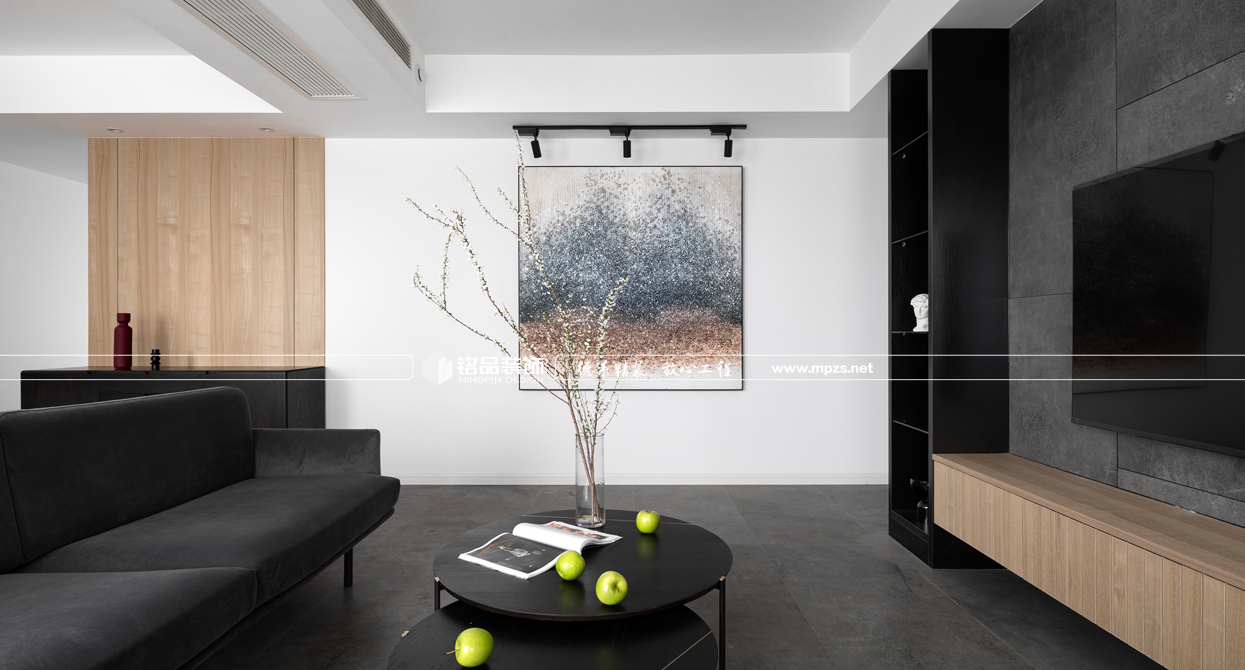 本案整體以黑白灰為主色介入,降低房子對(duì)業(yè)主生活的喧賓奪主,大面的水泥磚以及背景的延伸帶來(lái)的空間感,和適當(dāng)?shù)哪旧一卮笞匀坏谋菊嫔?,家具的選擇也降低了對(duì)顏色的追求,還原本屋的真實(shí)感。留取空間的最大給到業(yè)主去添加的生活情愫色彩。