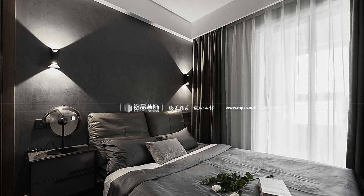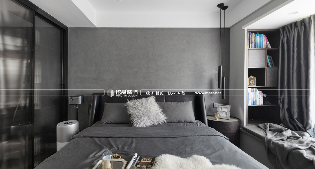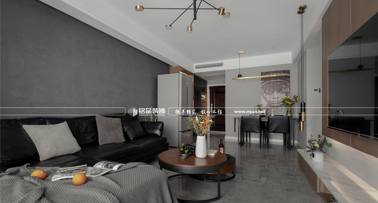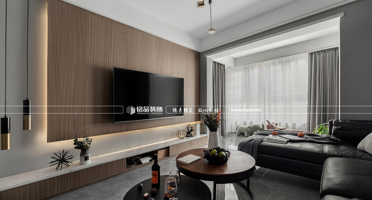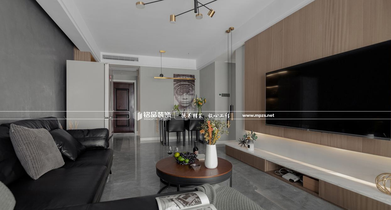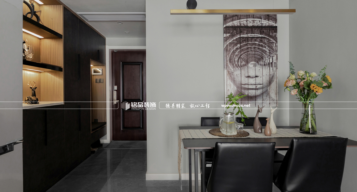 主題風(fēng)格是現(xiàn)代極簡,主色是黑白灰,材質(zhì)是木飾面,藝術(shù)漆,不銹鋼,爵士白大理石,長虹玻璃