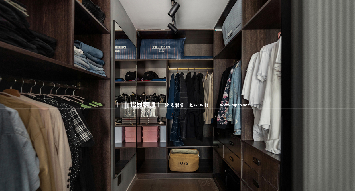 89的三房兩衛(wèi)改成三房一衛(wèi),其中主衛(wèi)變成衣帽間,衣帽間的主要光源是射燈,考慮換季更新衣服的需要,用不同角度的關(guān)系打造出衣帽間的氛圍。