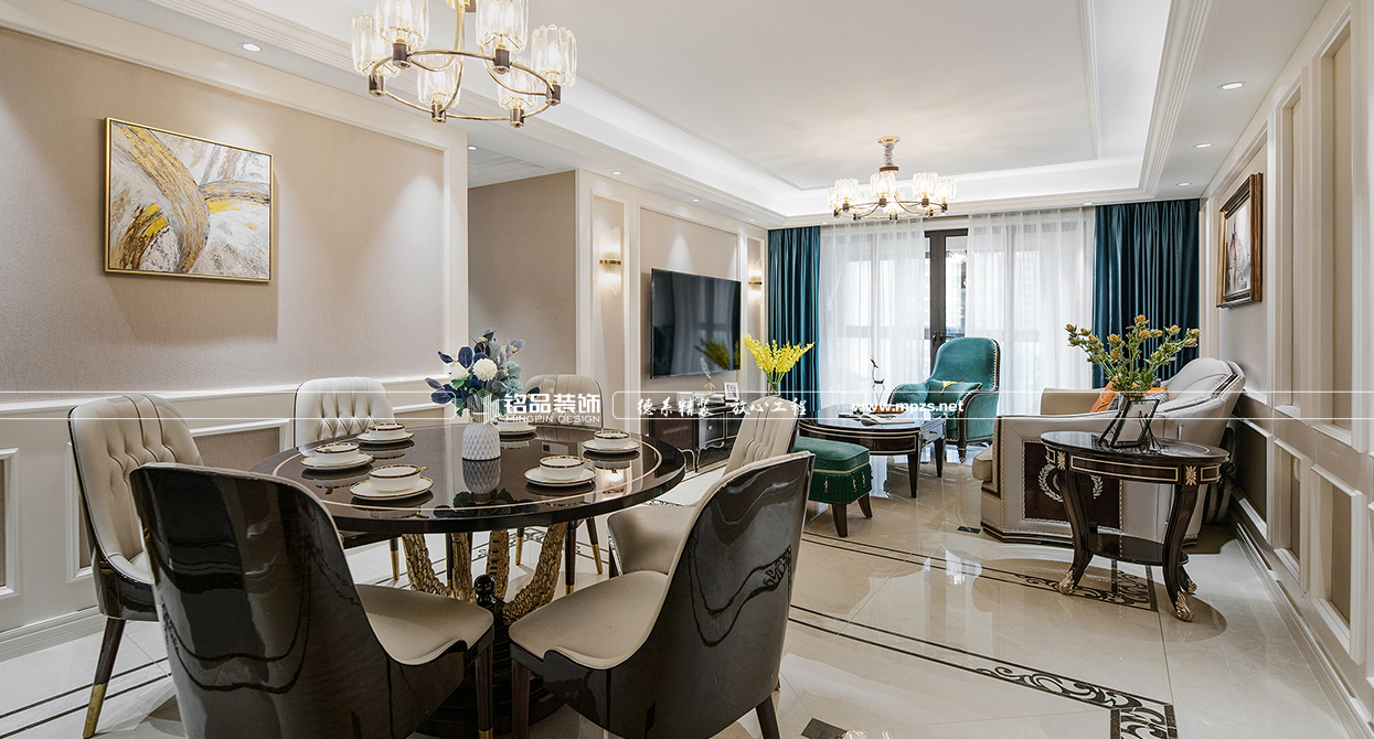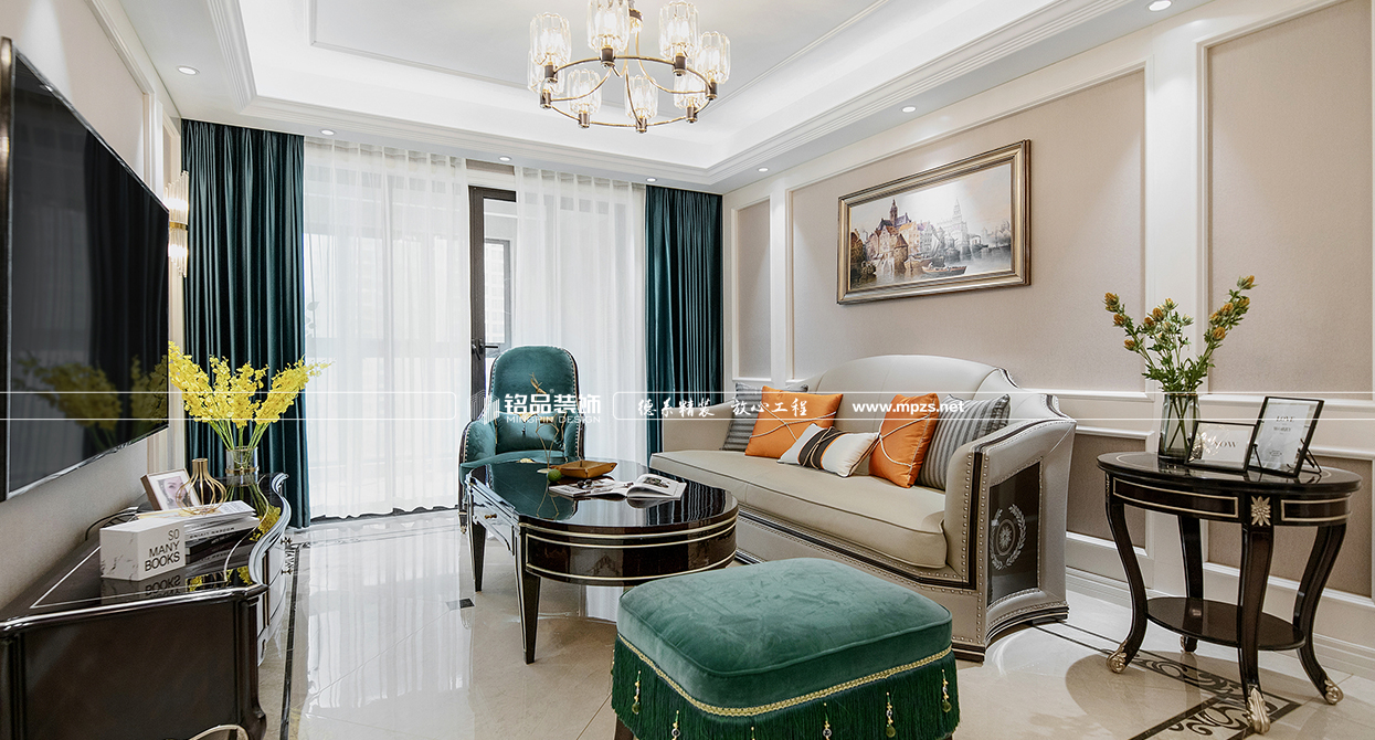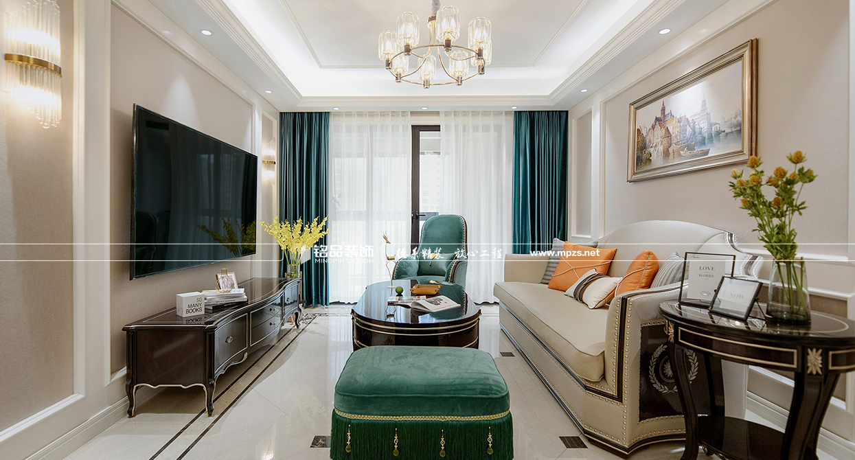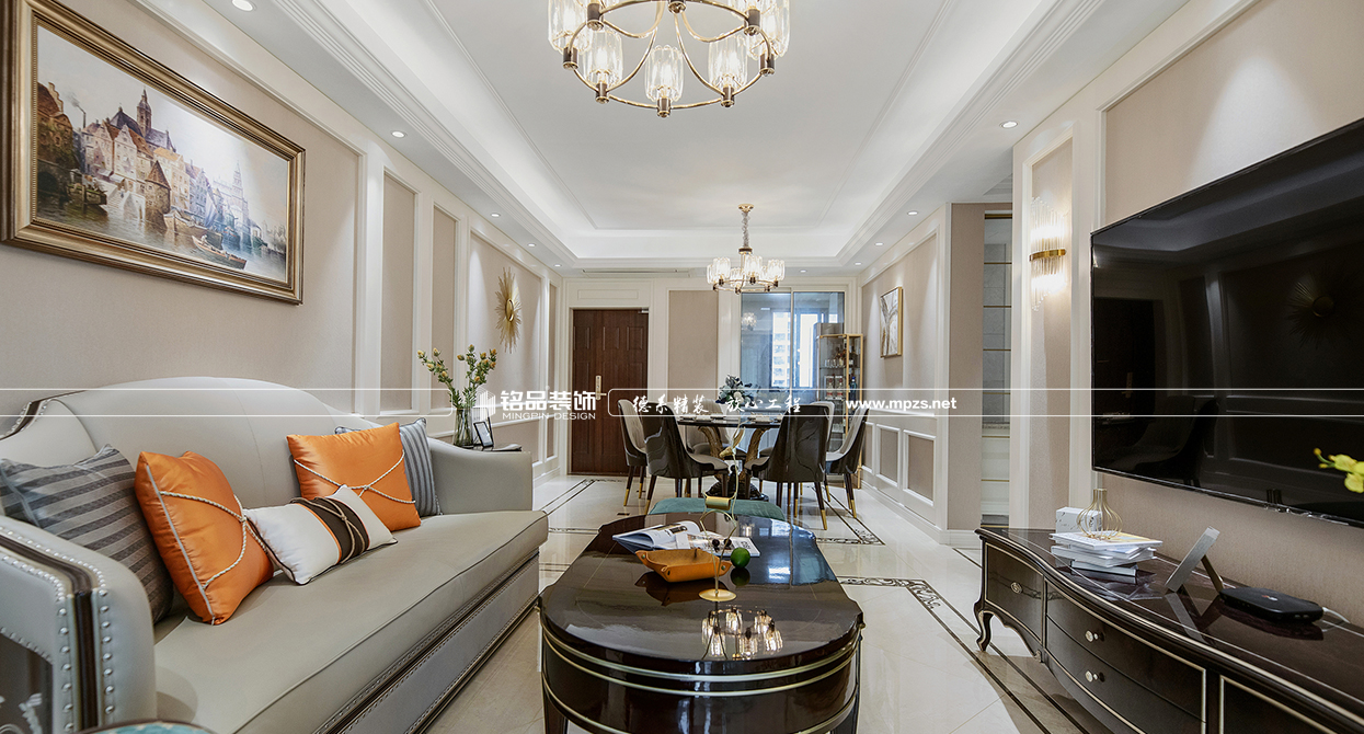 本案例房屋面積為105㎡,以美式風格裝修為主,色系以米色作為空間的主色,加以金屬色點綴,使空間整體溫馨而又不失奢華,客廳筒燈加主燈設(shè)計使空間光線最大化,提升空間通透感