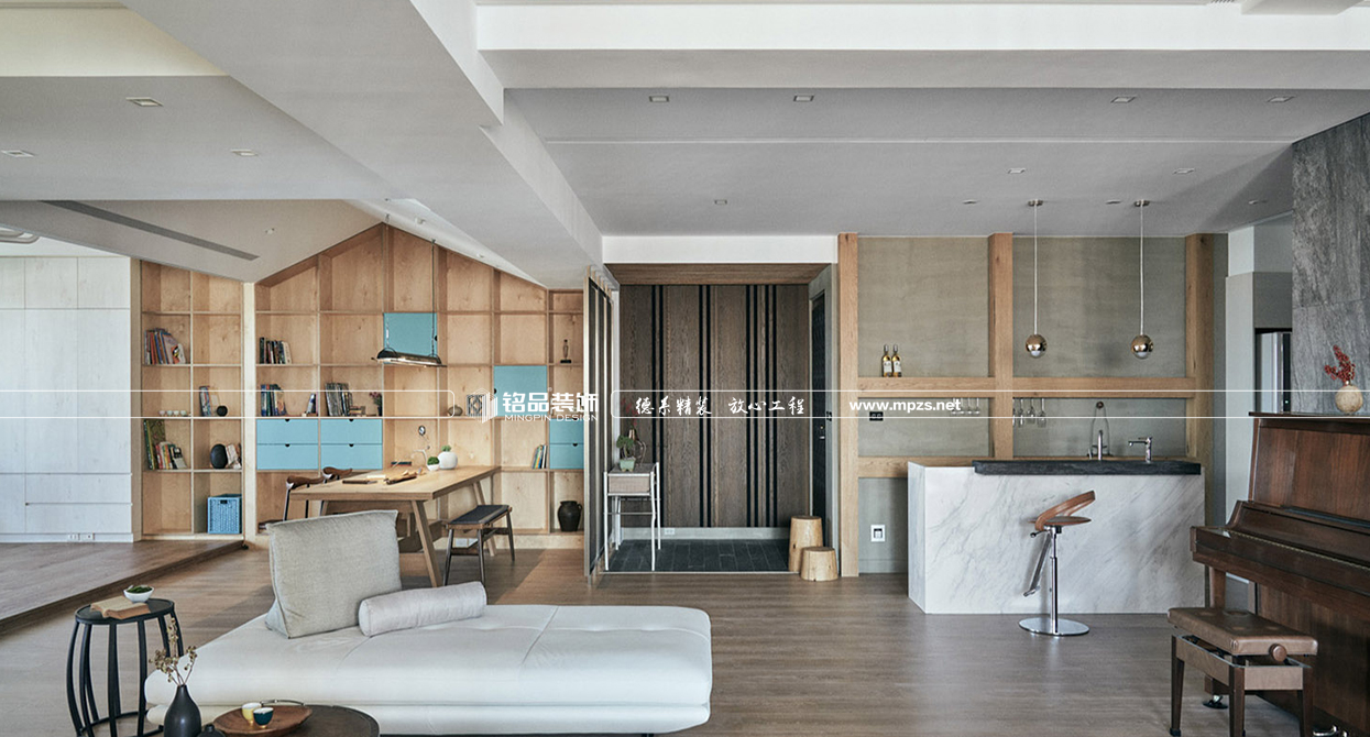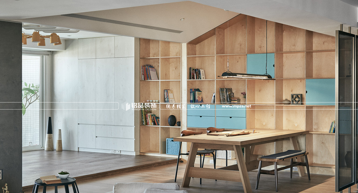 本案例房屋面積為270㎡,以北歐風(fēng)格裝修為主,大量的實(shí)木語(yǔ)匯發(fā)揮在窗格、桌板、柜體及收納架上,書房的書架墻特別規(guī)劃為山形收掉大梁的量體感,同時(shí)增添親子宅的溫馨度。