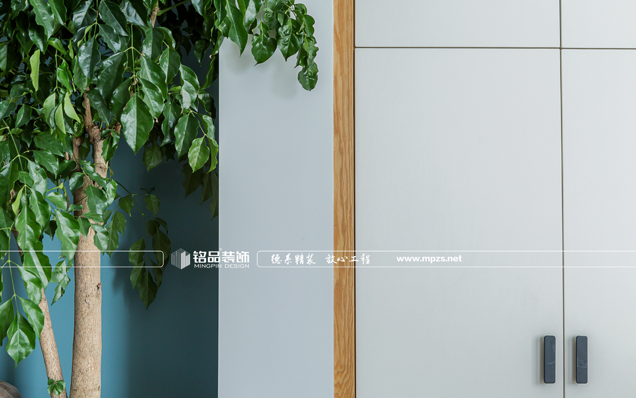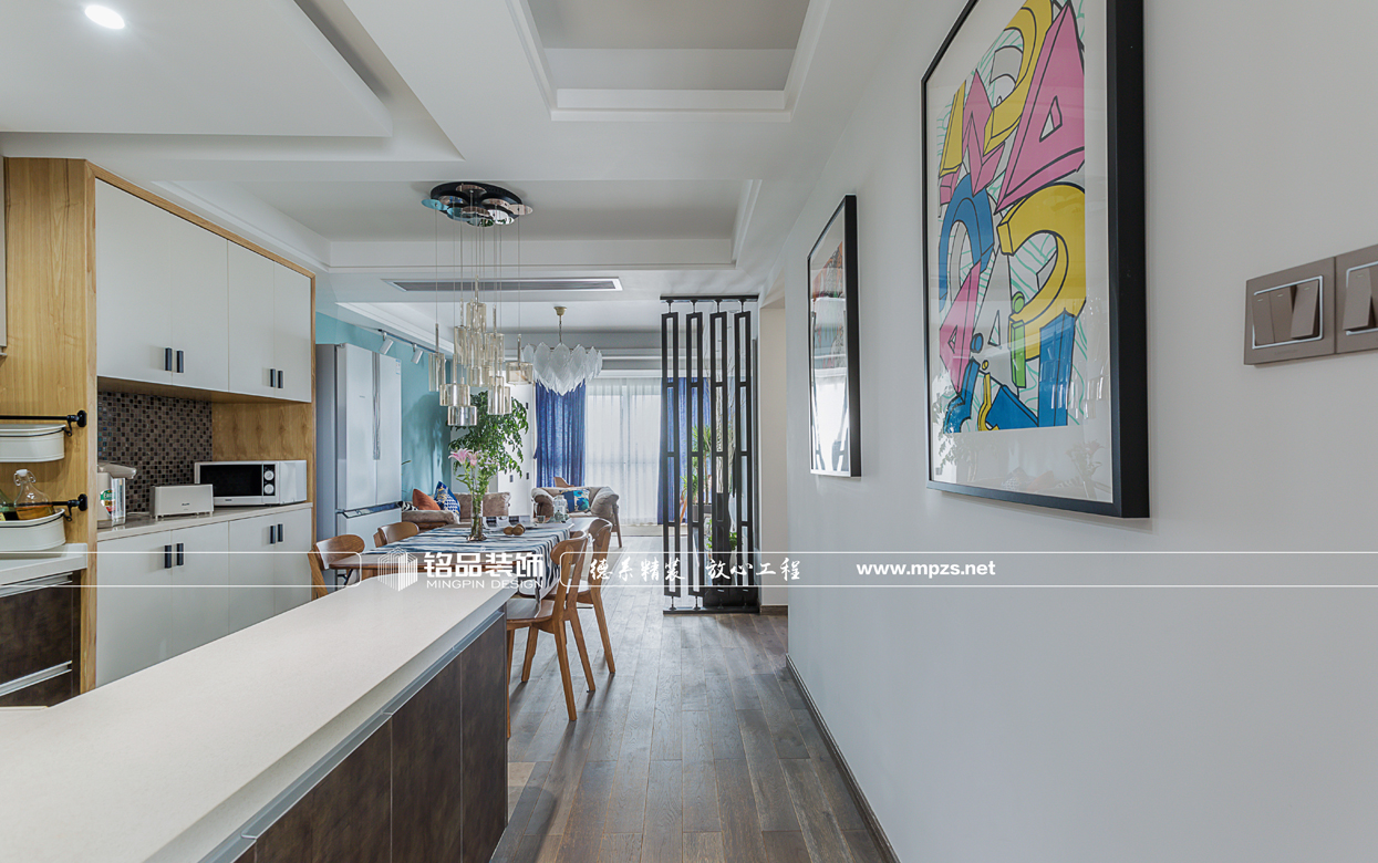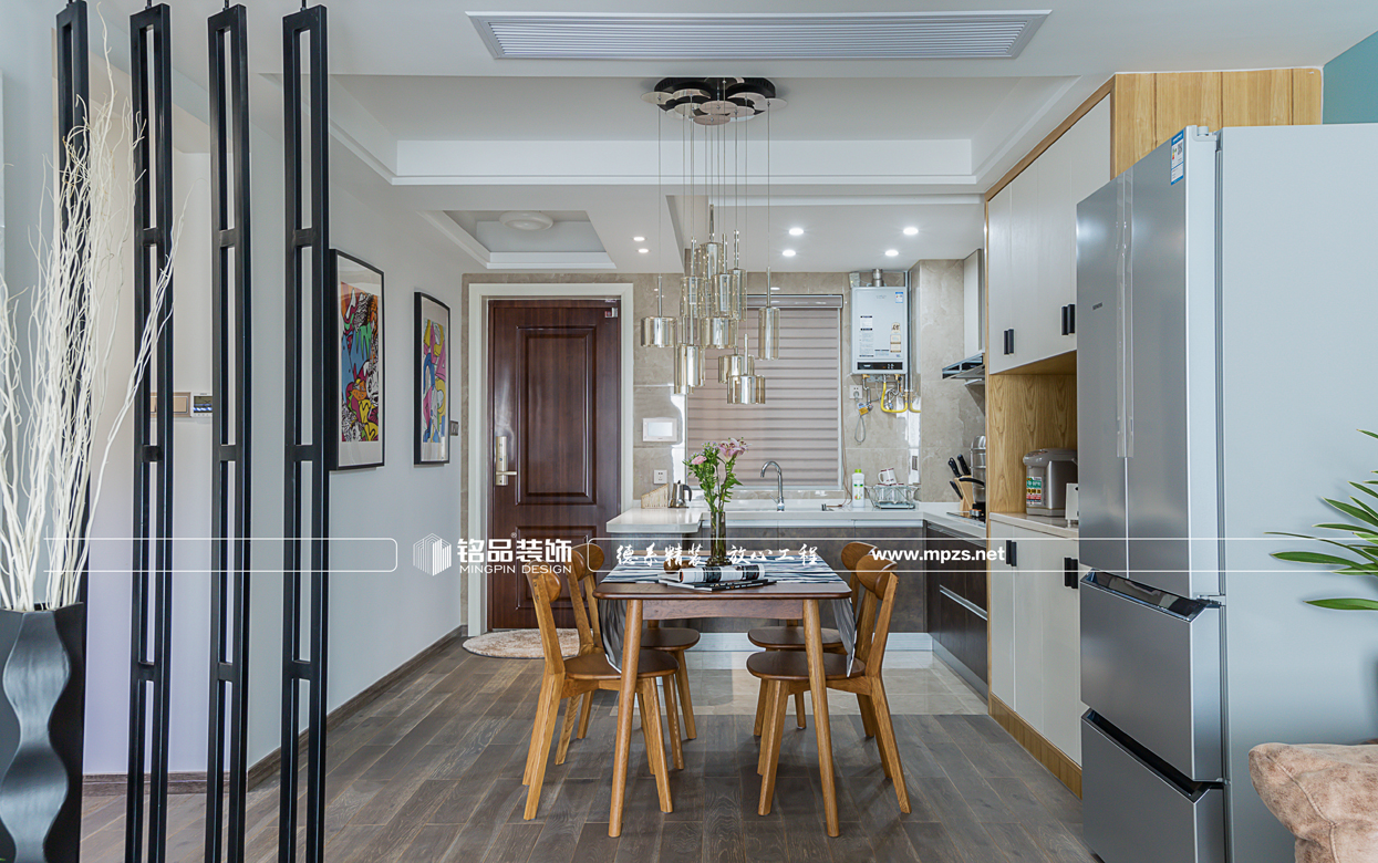 時尚,年輕有朝氣,但又兼顧了實用(儲物,空間感,采光,通風(fēng),行進路線) 此戶型業(yè)主年齡在20來歲,比較年輕有朝氣,而且戶型是90方戶型三房兩衛(wèi),多了一個衛(wèi)生間固然實用,但是收納空間也相應(yīng)的減少,所以前期需要設(shè)計盡可能多的空間,而且本身戶型餐廳較小,廚房又較暗,又考慮到小年輕平時燒飯也不多,所以就將廚房設(shè)計成了靠方式廚房,陽臺可外擴,所以又將陽臺的位置利用起來包進客廳,做了一排收納柜。整體色調(diào)偏向于更時尚年輕的灰色系,并在軟裝上相應(yīng)的出彩些,符合了業(yè)主的朝氣與時尚氣質(zhì)