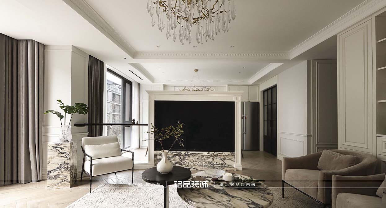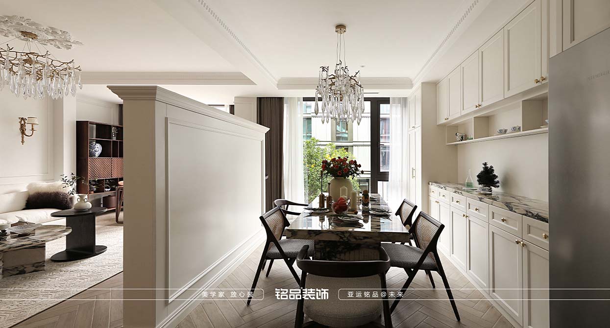 杭州璟宸府裝修空間整體為白色系,室內(nèi)裝飾和法式藝術(shù)難舍難分,在空間布局方面,裝飾并非一無是處,更多是呈現(xiàn)精致主義的獨(dú)特美。硬朗復(fù)古的石膏走線,結(jié)合大理石、木飾面,鋪陳出莊重典雅的氛圍,營造強(qiáng)烈的秩序感與儀式感。結(jié)合吊燈浮雕設(shè)計(jì),使得裝飾風(fēng)格通過各種家具彌漫在各處區(qū)域中。整體空間調(diào)性時(shí)尚、自由且充滿藝術(shù)氣質(zhì),簡潔流暢的線性語言以克制又浪漫的筆觸勾勒空間輪廓,自然與靈動(dòng)的元素在碰撞中融匯出新,在形象與意向之中,自由自在的演繹出藝術(shù)、時(shí)尚和人文精神的全新思考。