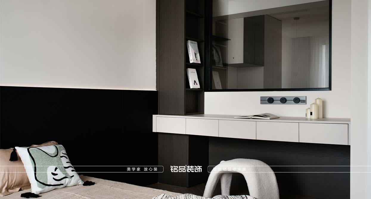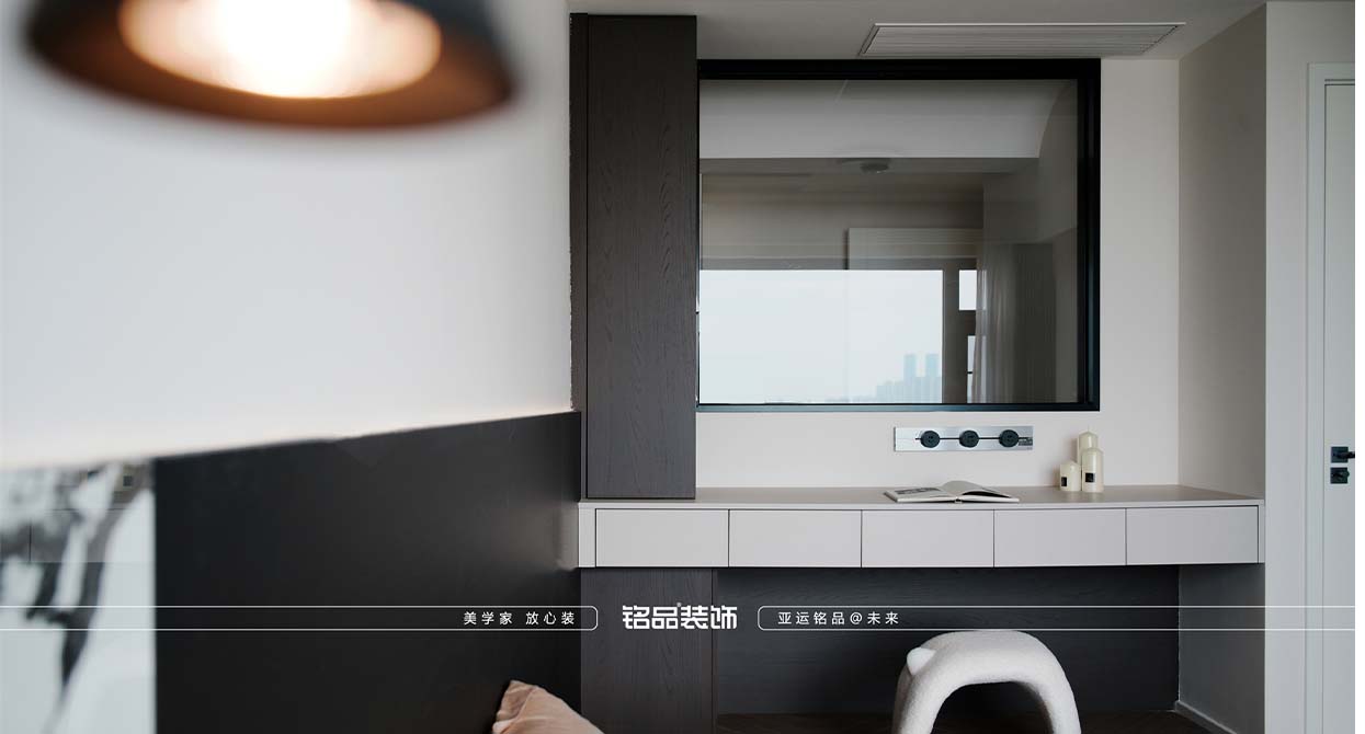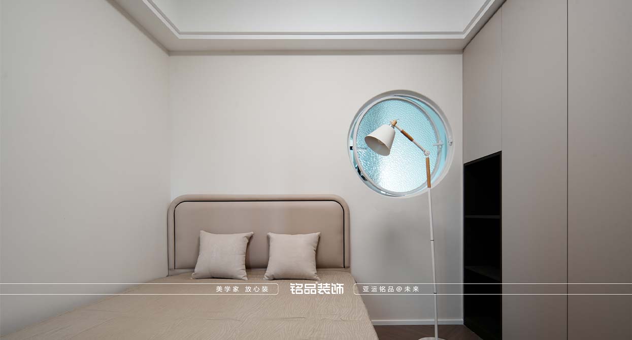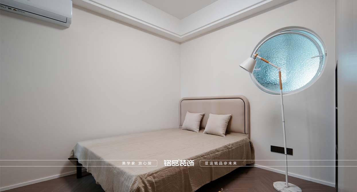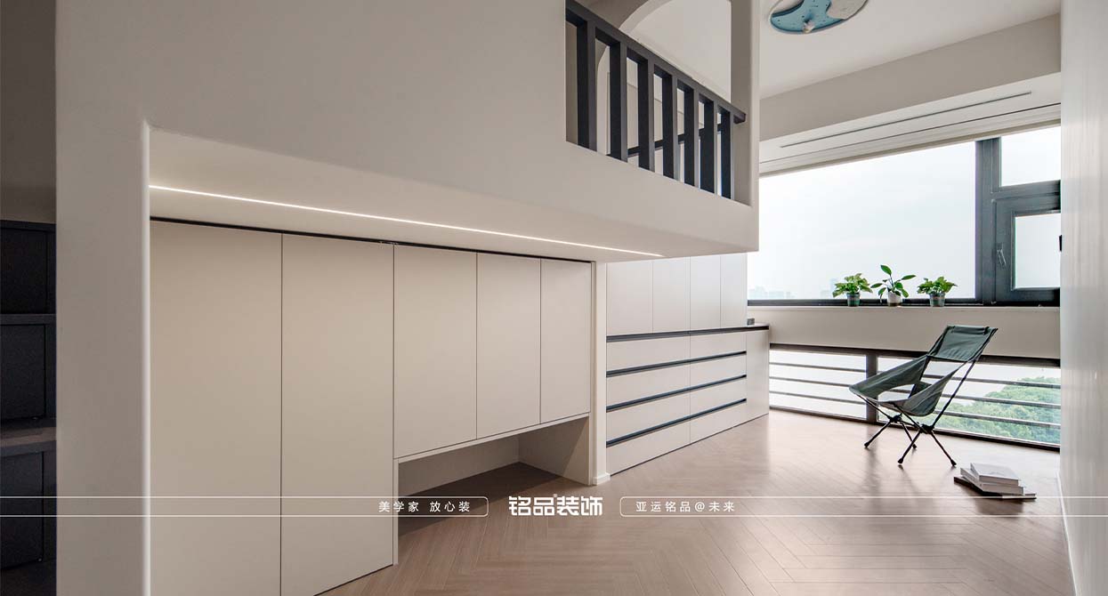 進門視野相當開闊,有開門見山的視覺效果,整體效果非常簡潔大氣,空間功能簡單但資源齊全,男孩房做了上下鋪,樓梯及下方懸空處都是柜子,收納空間充足,衛(wèi)生間地板以及一側(cè)的墻采用了顆粒感很強的水磨石來對比素雅的墻磚,客餐廳地磚采用灰色的地板磚,墻面是白色乳膠漆,柜子是黑色,在視覺上就是一個三方呼應的視覺感觀,餐廳上方做了水波紋,讓平靜的空間多了一絲靈動