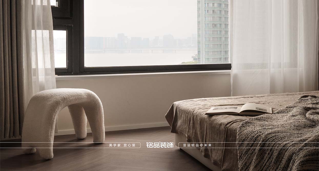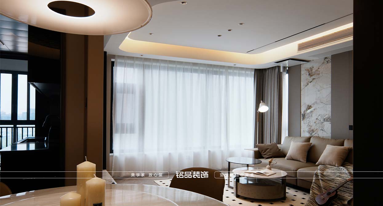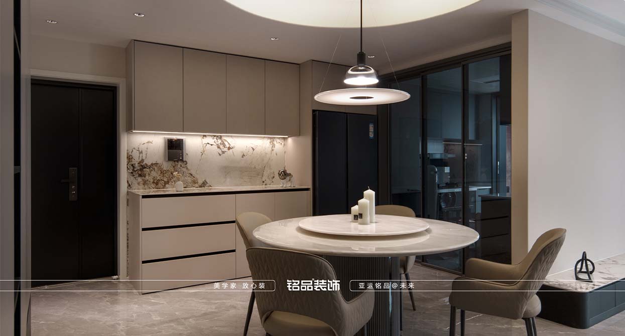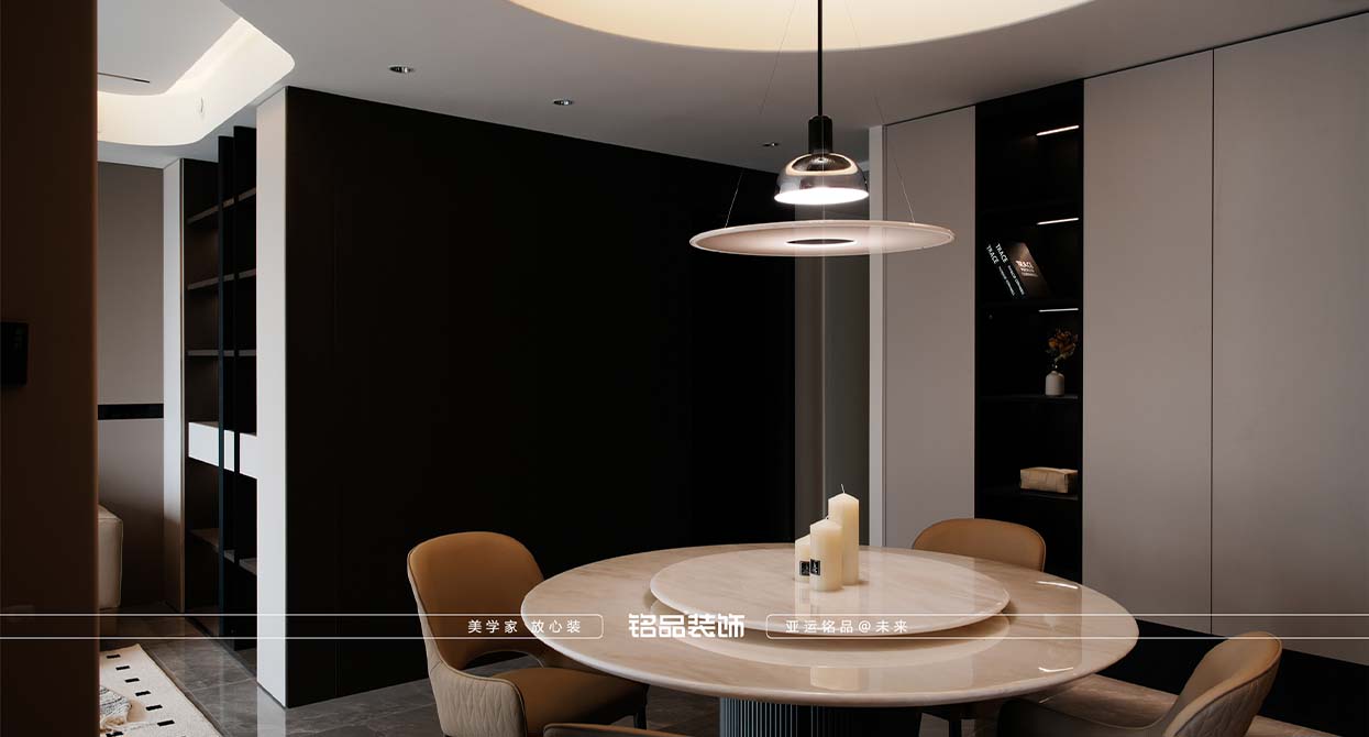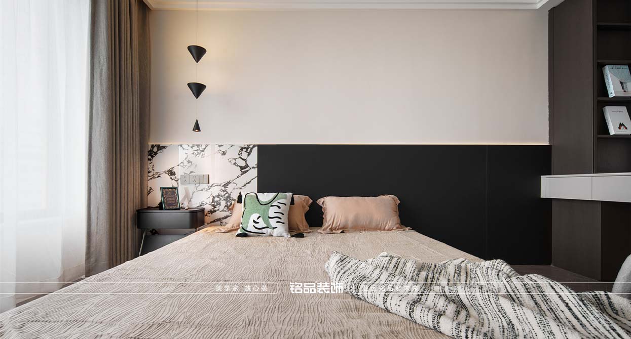 進門視野相當開闊,有開門見山的視覺效果,整體效果非常簡潔大氣,空間功能簡單但資源齊全,男孩房做了上下鋪,樓梯及下方懸空處都是柜子,收納空間充足,衛(wèi)生間地板以及一側(cè)的墻采用了顆粒感很強的水磨石來對比素雅的墻磚,客餐廳地磚采用灰色的地板磚,墻面是白色乳膠漆,柜子是黑色,在視覺上就是一個三方呼應的視覺感觀,餐廳上方做了水波紋,讓平靜的空間多了一絲靈動
