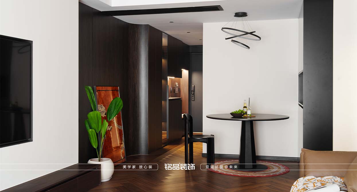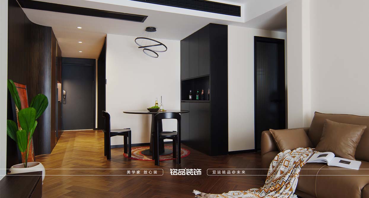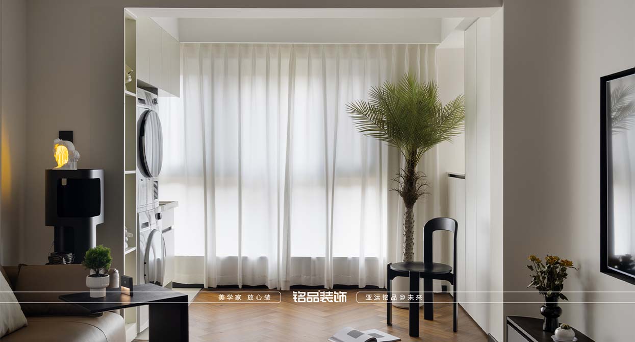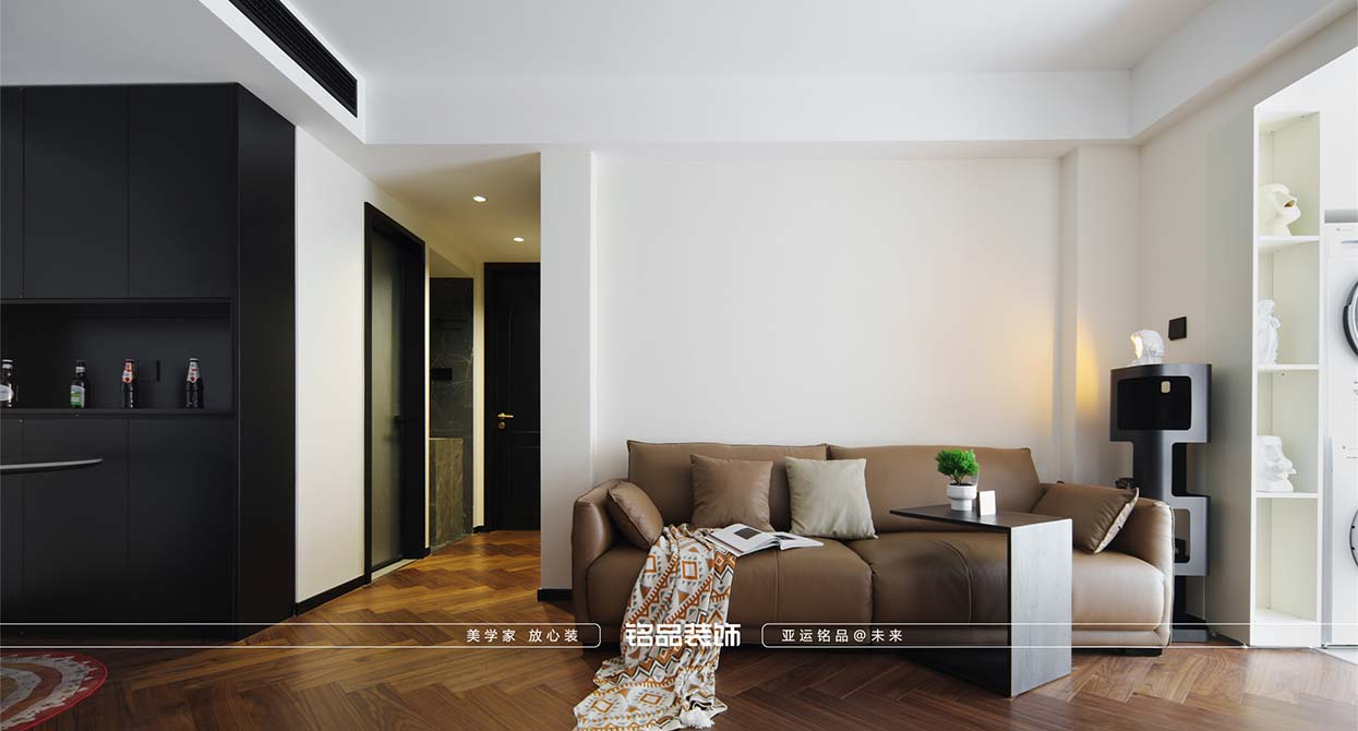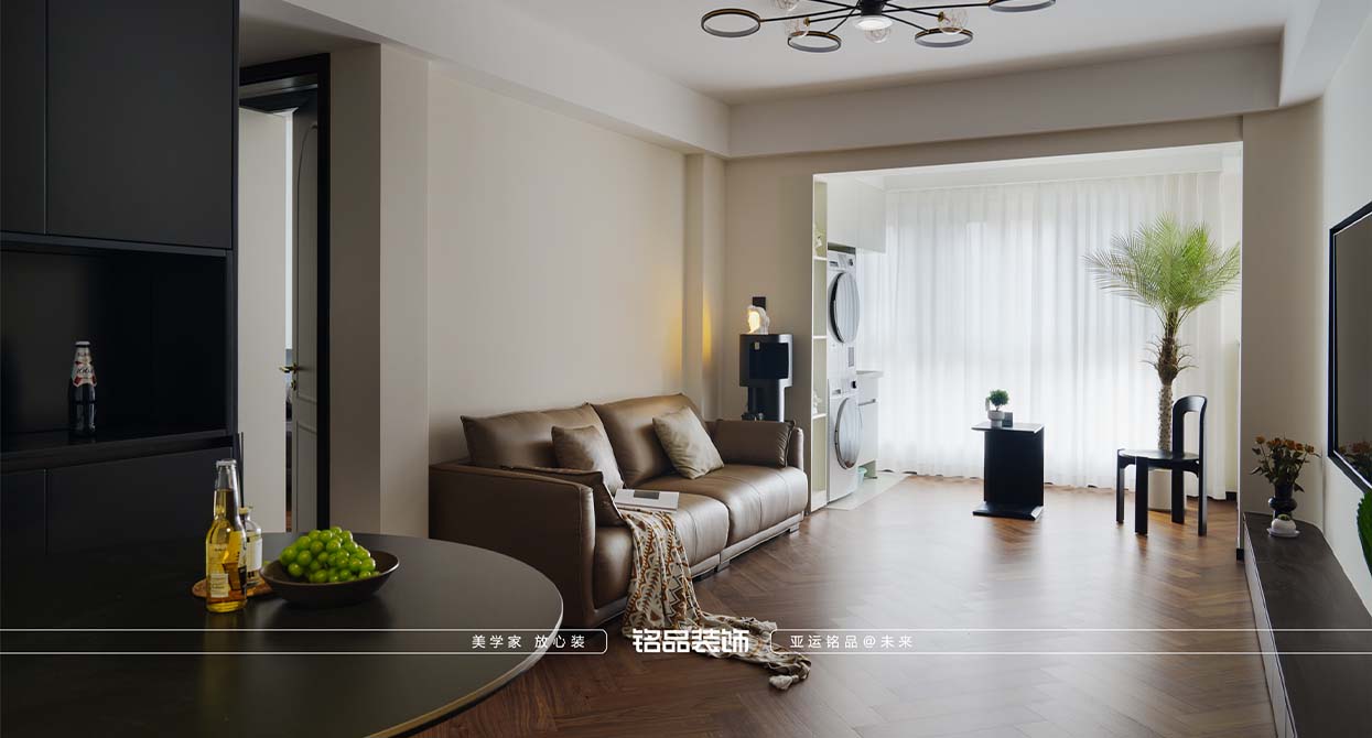 整個戶型因?yàn)槭侵虚g套,所以總體采光不是很好,廚房進(jìn)出口很小,如果做小開門或是折疊門都不合適,剛好邊上一個小書房,就把書房的移門跟廚房的做一個整體的三移門,增加透光度,減少過道的墻體面積。把廚房移門跟書房鏈接起來就起到裝飾 跟采光的效果。陽臺打開一個是為增加采光,再一個是為了拉長客廳的空間感。原戶型的客廳太方正,這樣就變成長方型效果。做為中古風(fēng)來說,全屋地板是最出彩的,但是陽臺要洗衣服所以要考慮一個水的問題。最后效果為主,就在洗衣機(jī)下面做了貼磚的效果。加上移門拆了以后的承重墻體就加了一個側(cè)面柜把陽臺洗衣機(jī)柜跟承重墻完美的收編。衛(wèi)生間是硬做了一個干區(qū),落地效果還是很好,臺盆柜是客戶網(wǎng)上定制 的。沙發(fā)后面有兩個陽角因?yàn)閴θ泻癖?,所以做圓角處理。