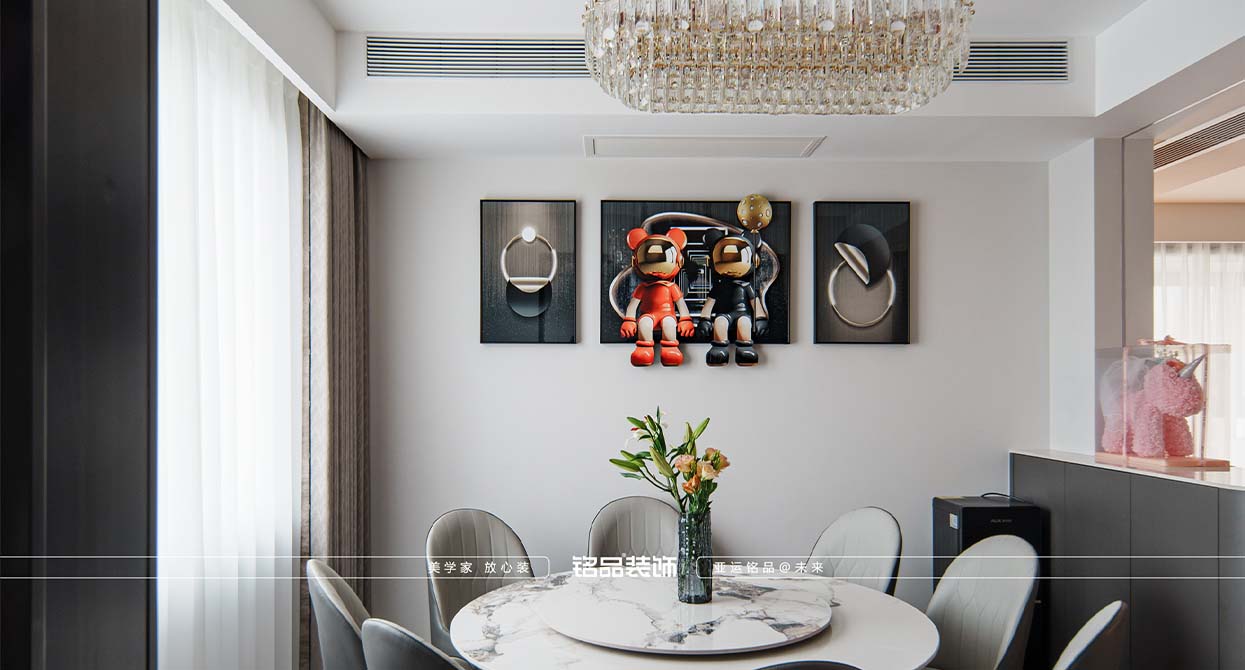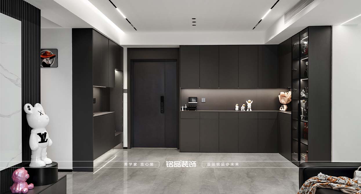 這個(gè)戶型是改動(dòng)比較多的,客戶家里有雙胞胎女兒,外面的空間希望做的大一點(diǎn),把原本進(jìn)門口的餐廳做了調(diào)整。只做了裝飾柜和書柜,可以裝飾,又實(shí)用,餐廳和客廳之間做了個(gè)吧臺(tái)聯(lián)動(dòng),他們平時(shí)在家也可以喝點(diǎn)紅酒,看看電視。很是享受生活。另外還有個(gè)衣帽間可以給到他們?nèi)ビ?,有足夠的?chǔ)物量。