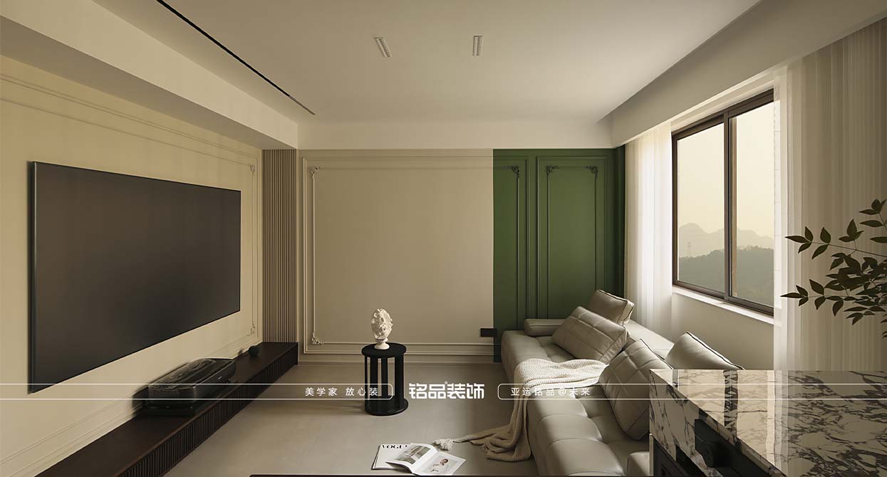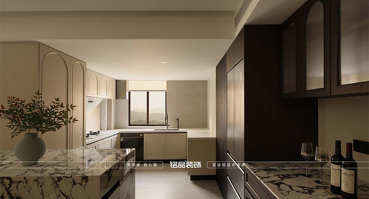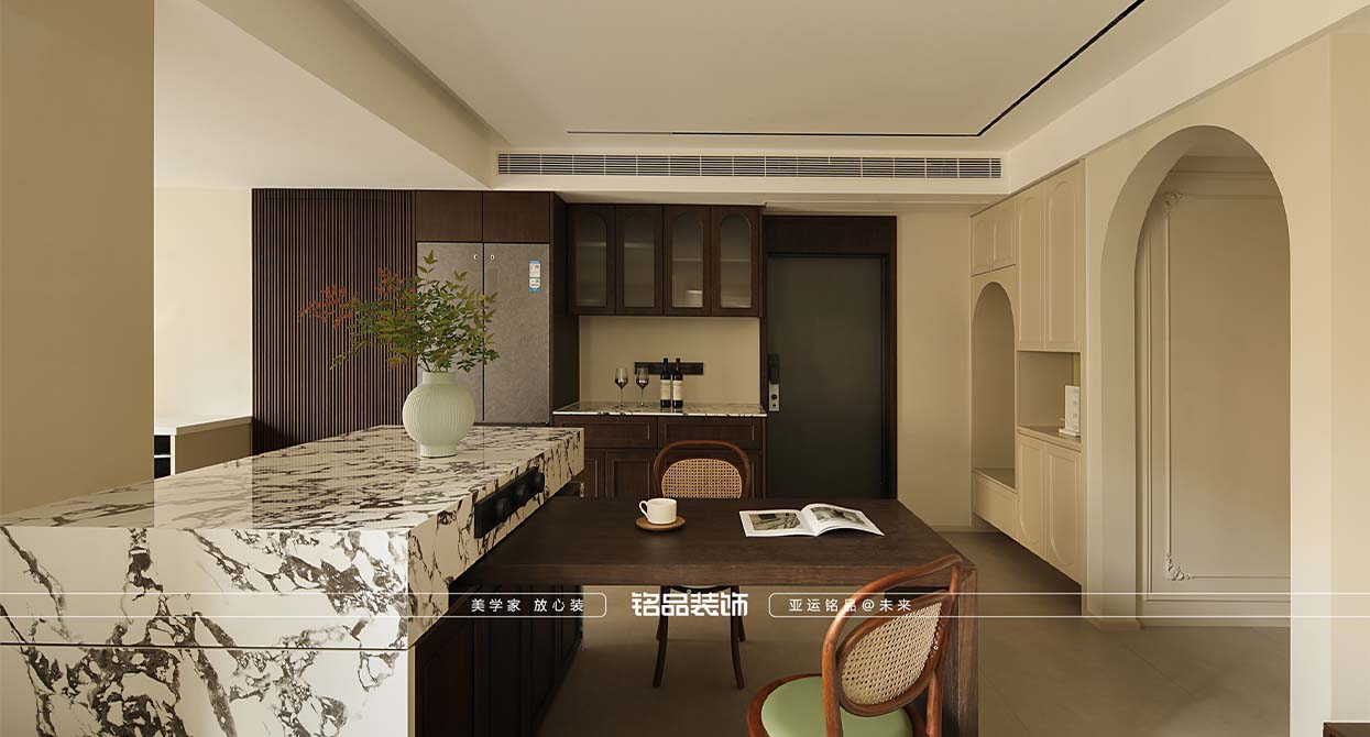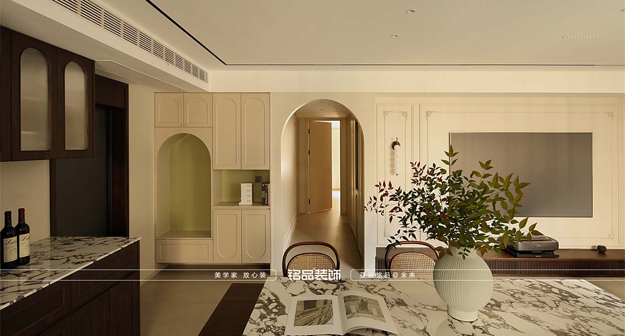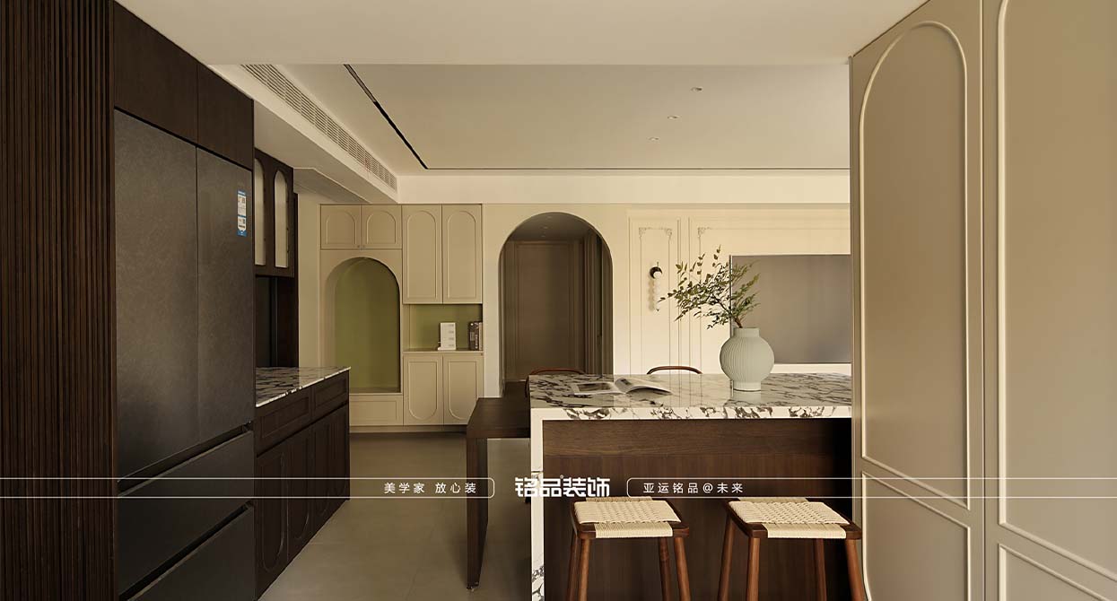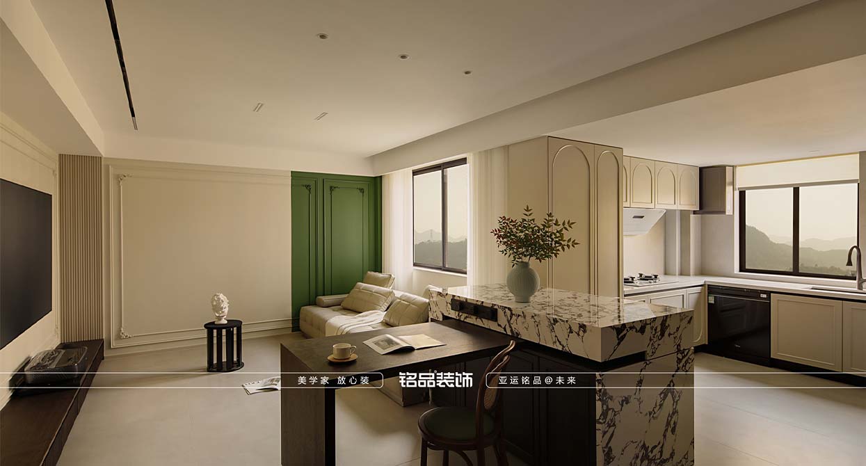 本案設計在經(jīng)過設計改造之后,進入屋內,一種歸家的寧靜和安逸撲面而來,因客餐廳是朝北的布局,所以選擇開放式的廚房設計,將空間的抽線貫通,開闊是的布局令空間通透而明亮??臻g上以現(xiàn)代風格+法式元素為設計手法,暖灰色調為主,注重加入一些胡桃木色和綠色,使空間結構明確,整體呈現(xiàn)寧靜雅宅的舒適氛圍。