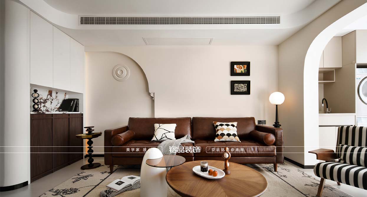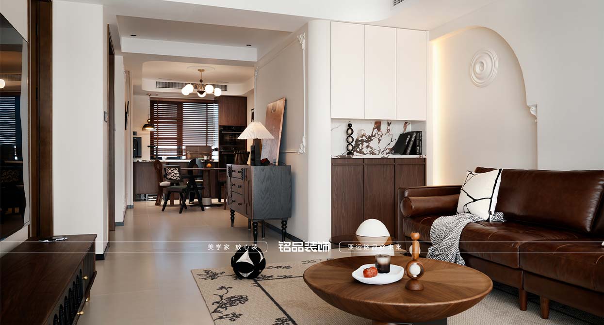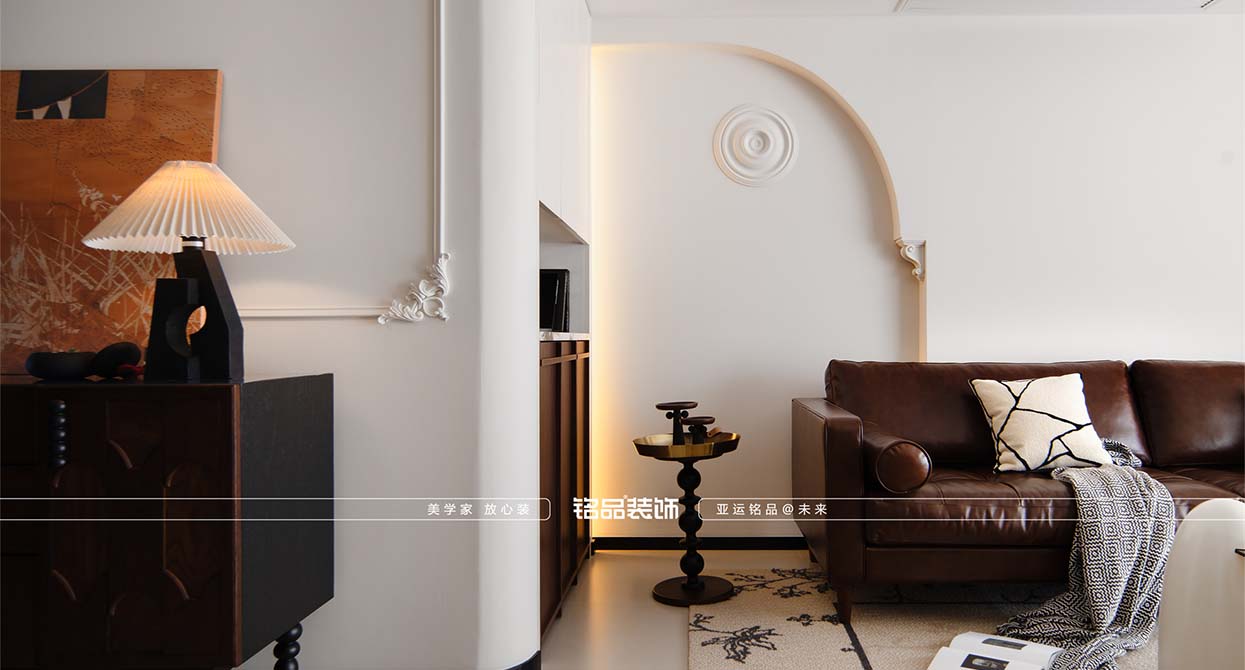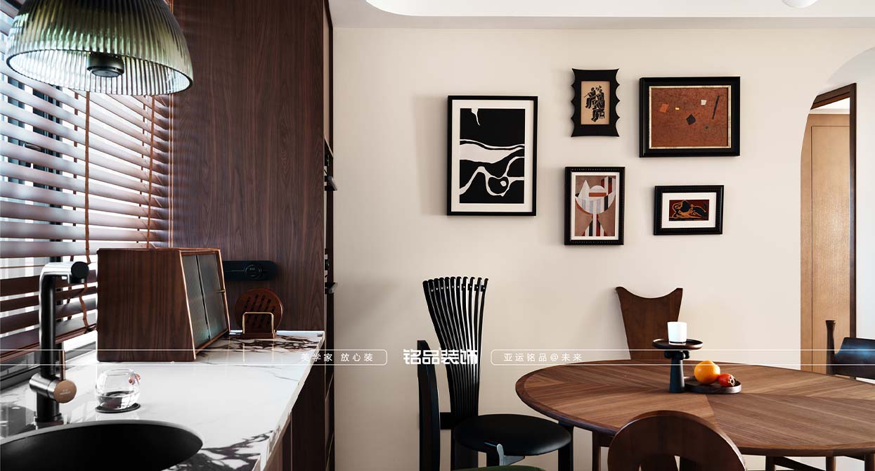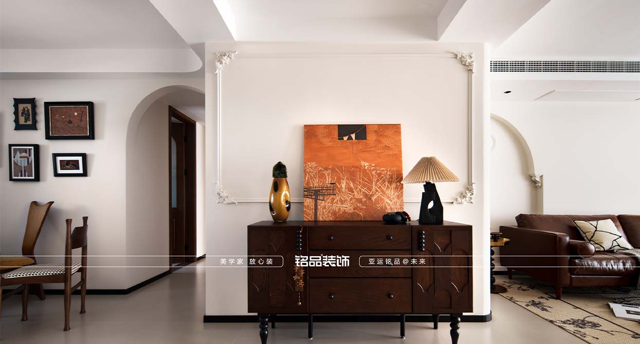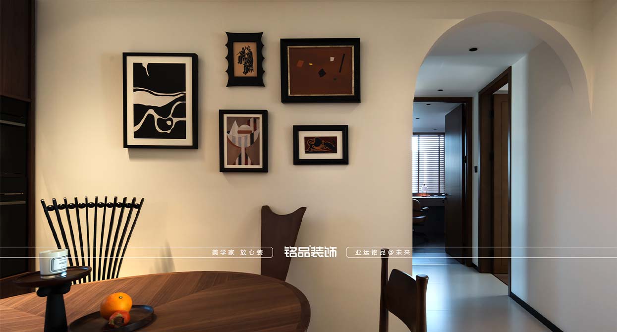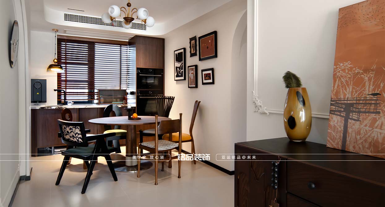 為了營造中古風(fēng)靜謐古樸的韻味,地面選用米色柔光磚通鋪,墻面選用奶白色乳膠漆,把硬裝部分做成基底,同時吊頂及墻面少量圓弧拱形元素強化中古特性,再少量運用PU線條和燈盤用小成本做出精致感,也穿插融入一定的小法元素。在硬裝簡單的基底上面,軟裝有更多的發(fā)揮空間,胡桃木+黑色的家具組合增加空間的深淺層次,不同款式顏色的餐椅提升空間的設(shè)計感和色彩關(guān)系,復(fù)古的裝飾畫及小配飾把中古風(fēng)格的空間搭配得更豐富立體。