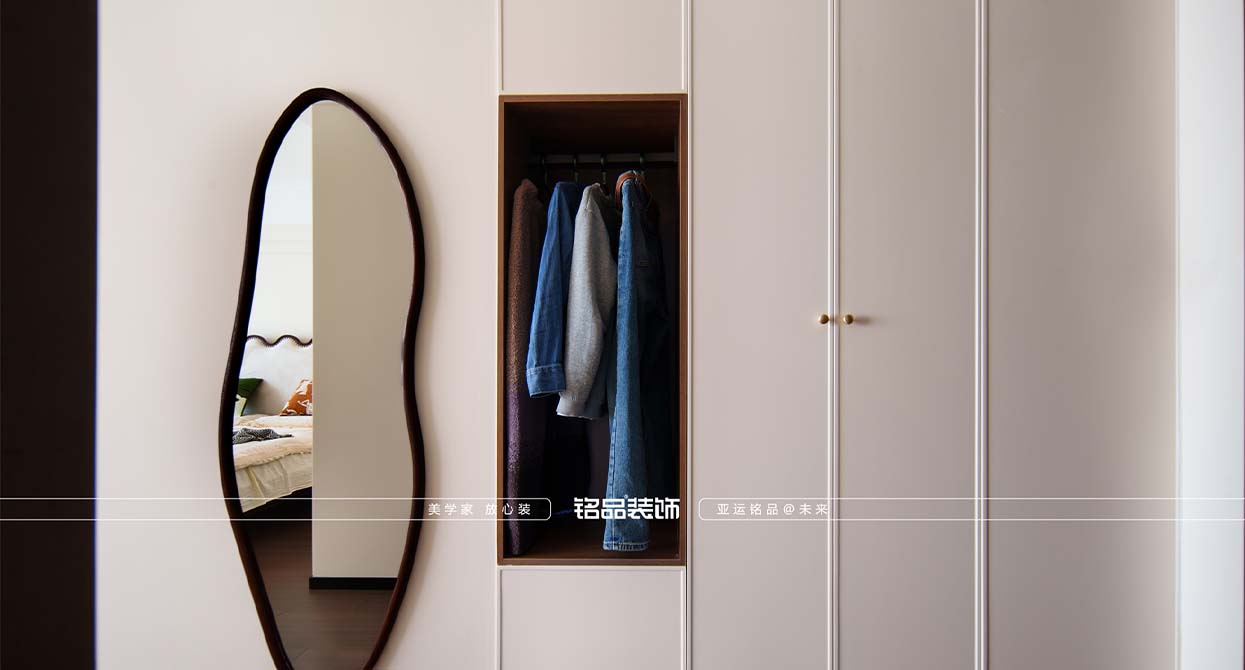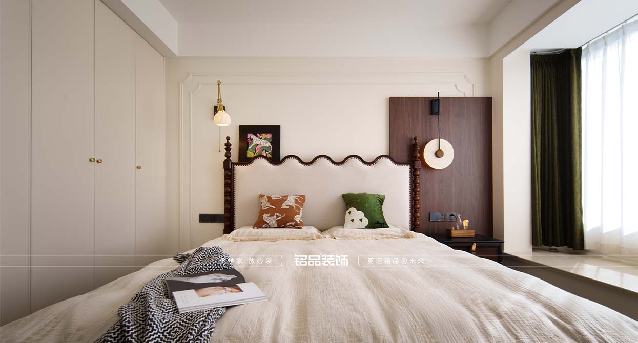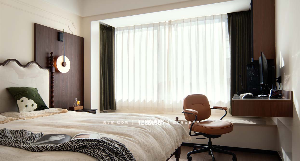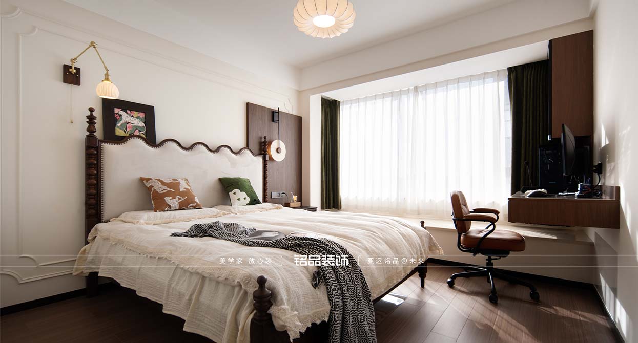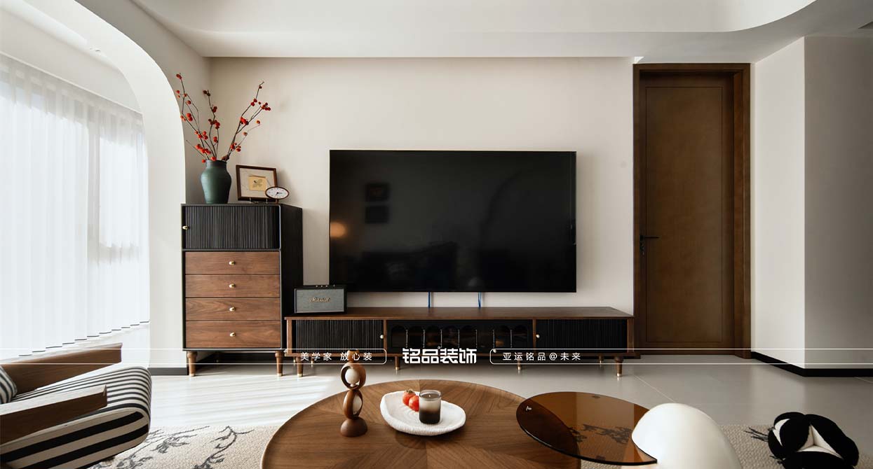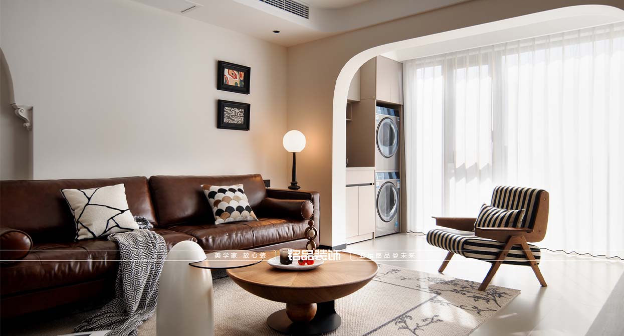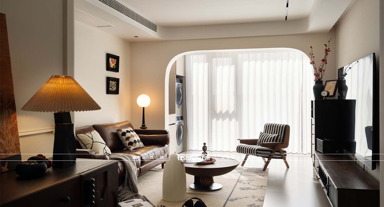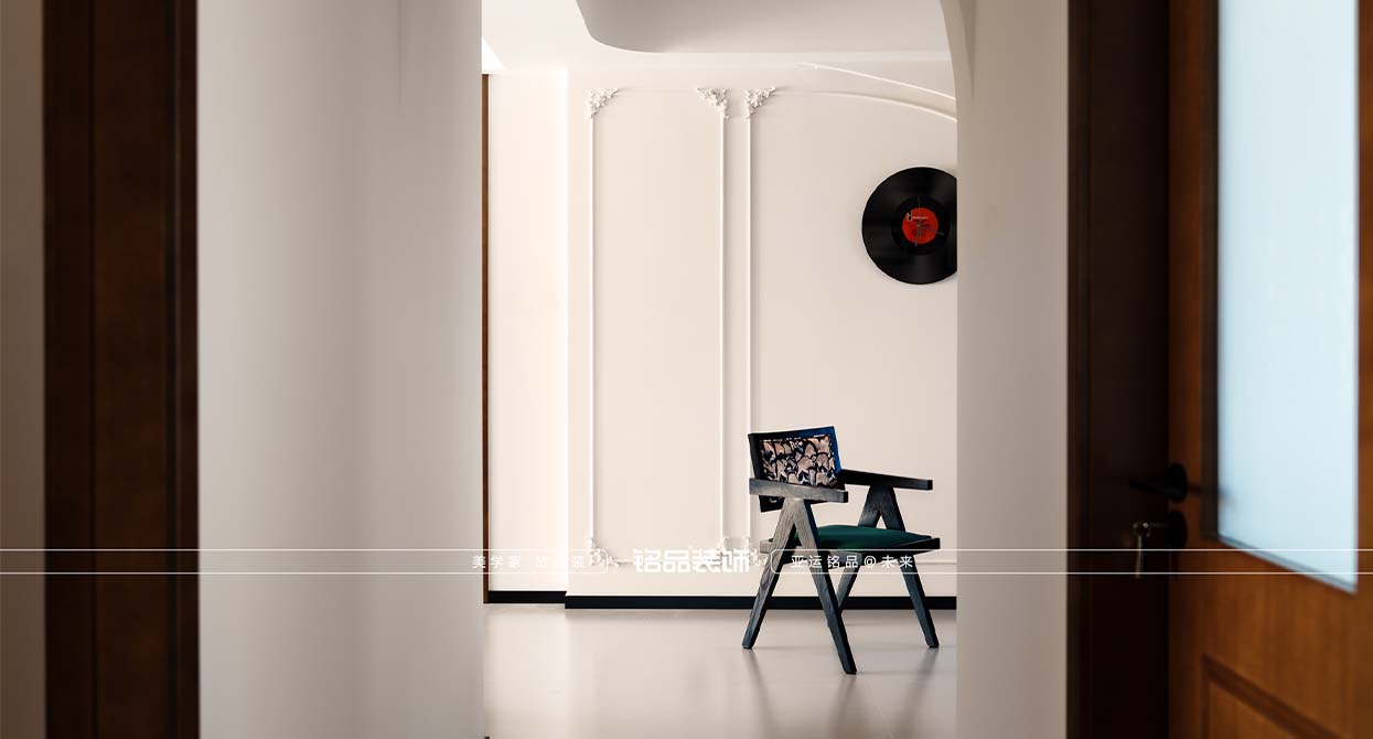 為了營造中古風(fēng)靜謐古樸的韻味,地面選用米色柔光磚通鋪,墻面選用奶白色乳膠漆,把硬裝部分做成基底,同時吊頂及墻面少量圓弧拱形元素強化中古特性,再少量運用PU線條和燈盤用小成本做出精致感,也穿插融入一定的小法元素。在硬裝簡單的基底上面,軟裝有更多的發(fā)揮空間,胡桃木+黑色的家具組合增加空間的深淺層次,不同款式顏色的餐椅提升空間的設(shè)計感和色彩關(guān)系,復(fù)古的裝飾畫及小配飾把中古風(fēng)格的空間搭配得更豐富立體。