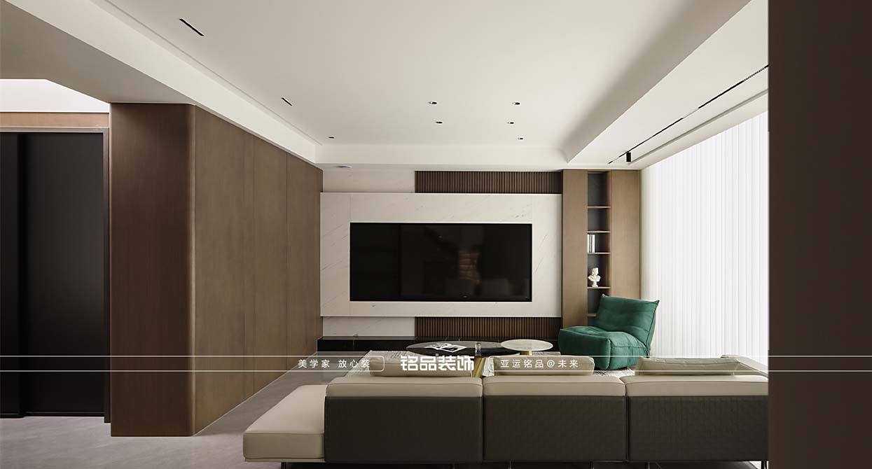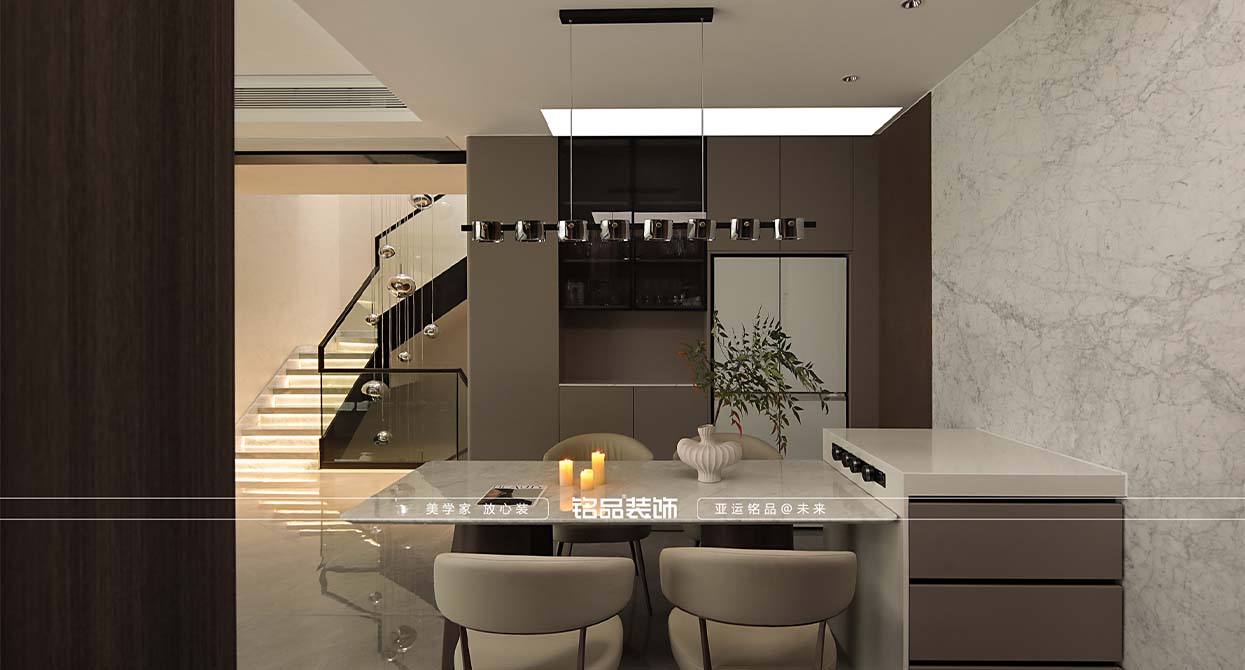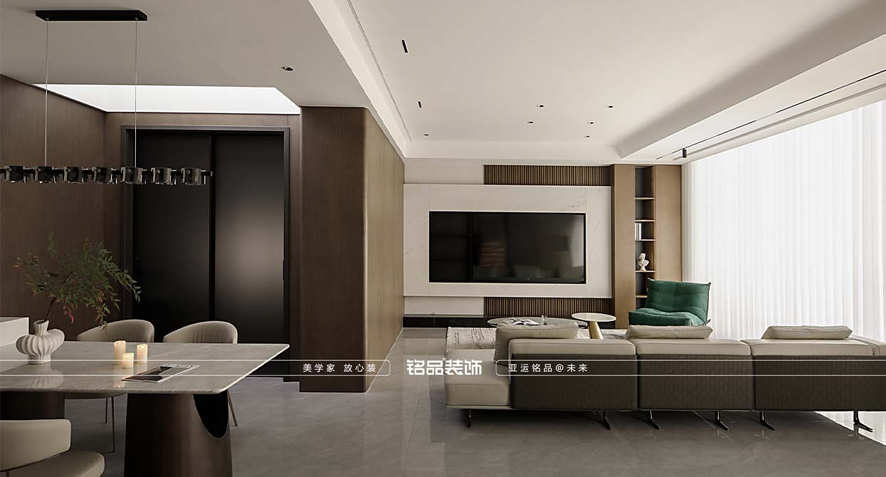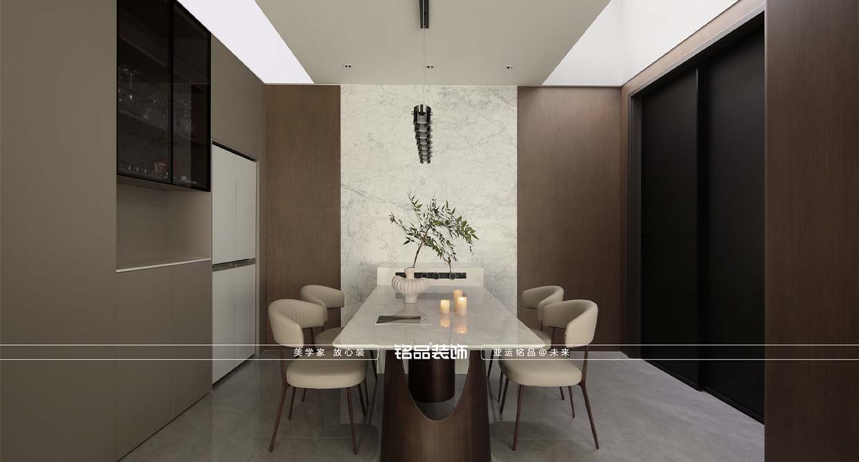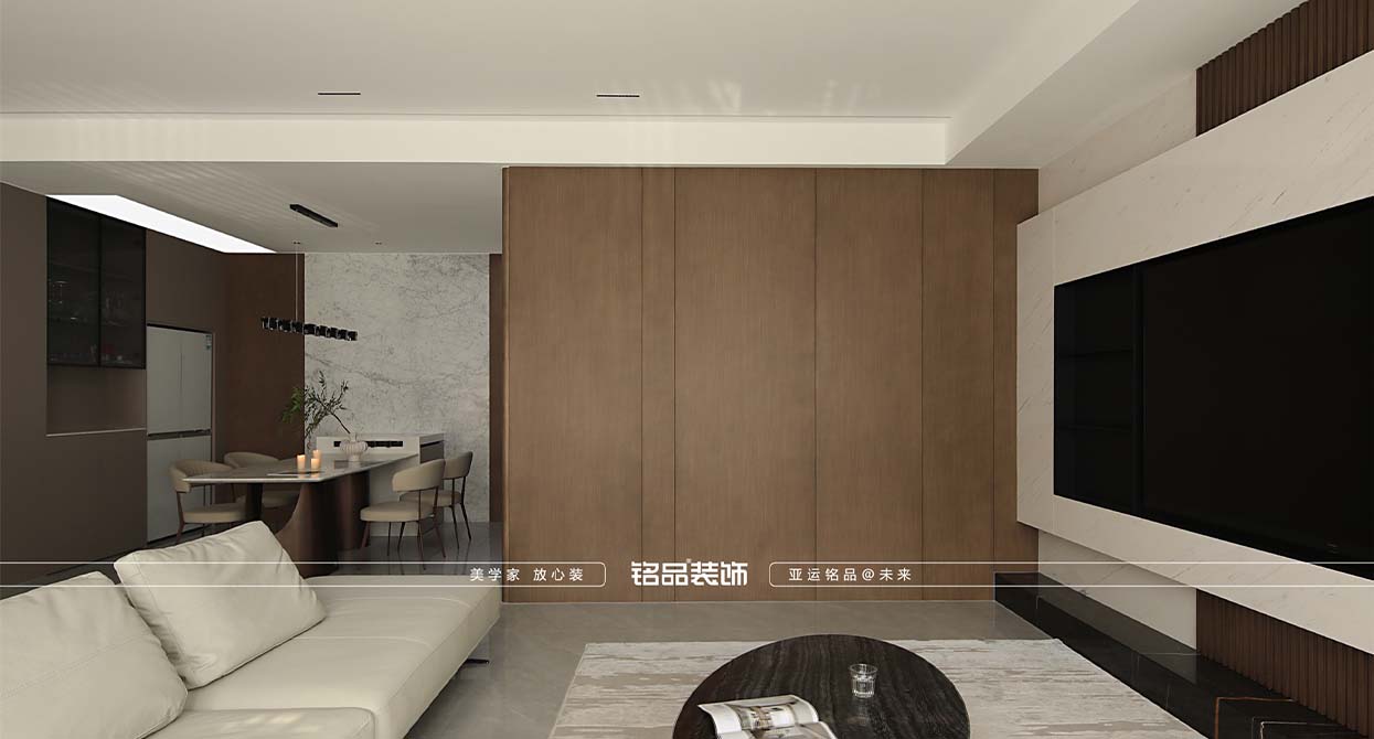 裝修風(fēng)格現(xiàn)代意式,簡(jiǎn)潔及時(shí)尚大氣的特點(diǎn),搭配深色木飾面,石紋地磚,黑金金屬米色藝術(shù)漆等材質(zhì),營造出時(shí)尚大氣的空間。