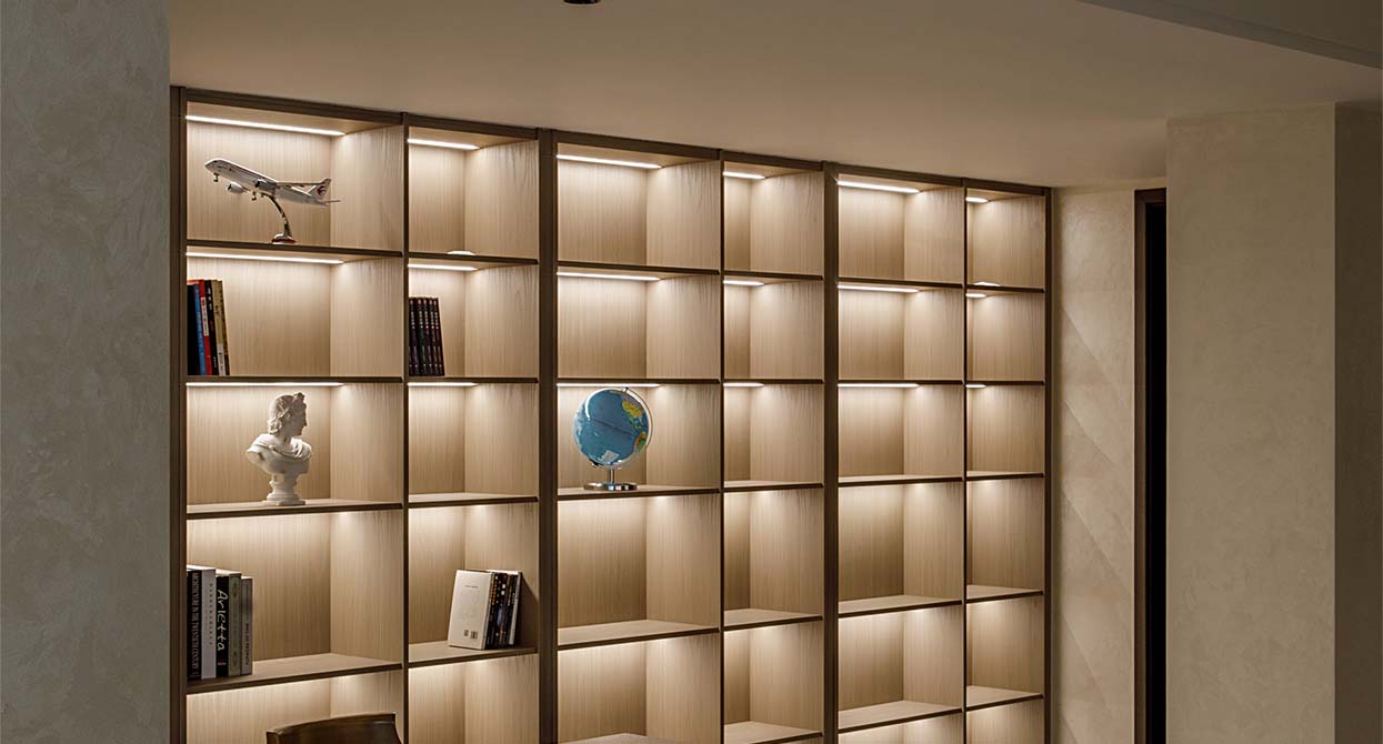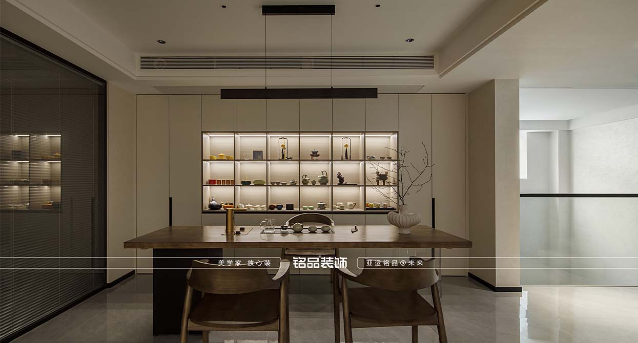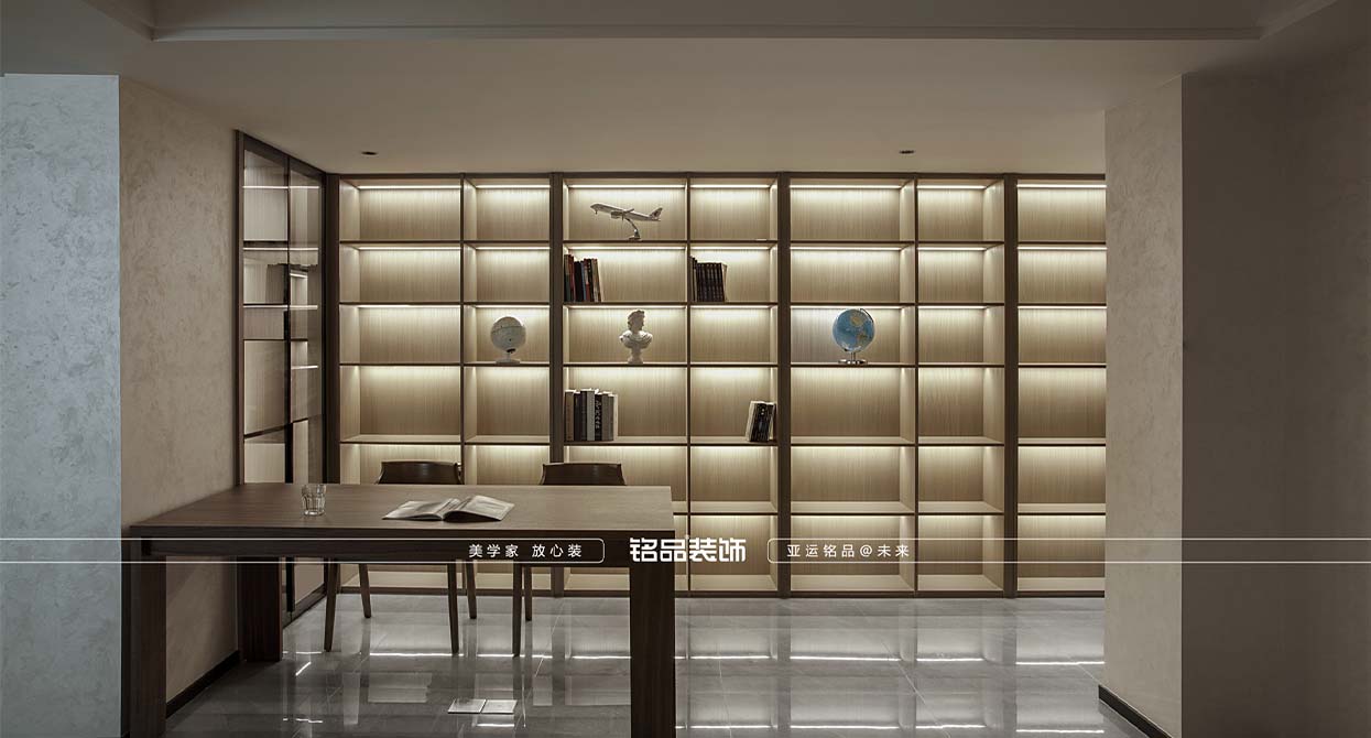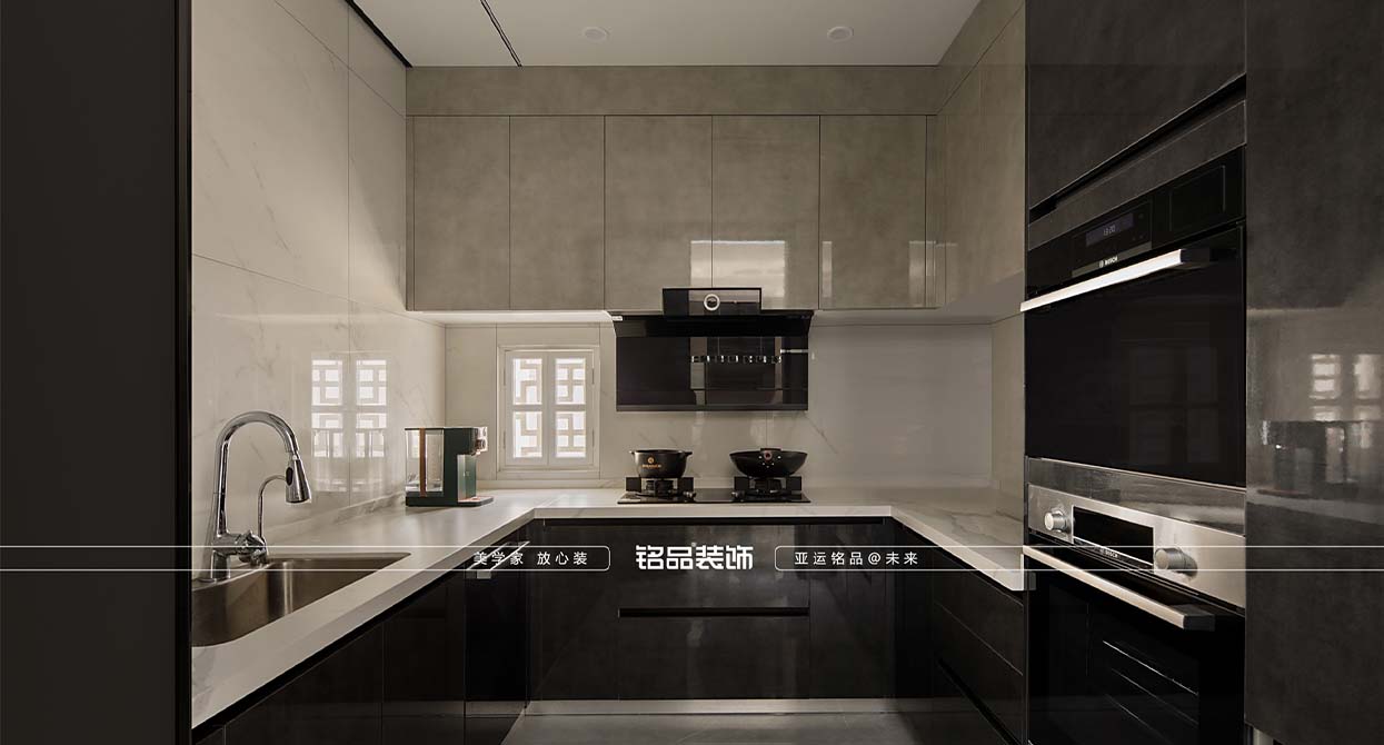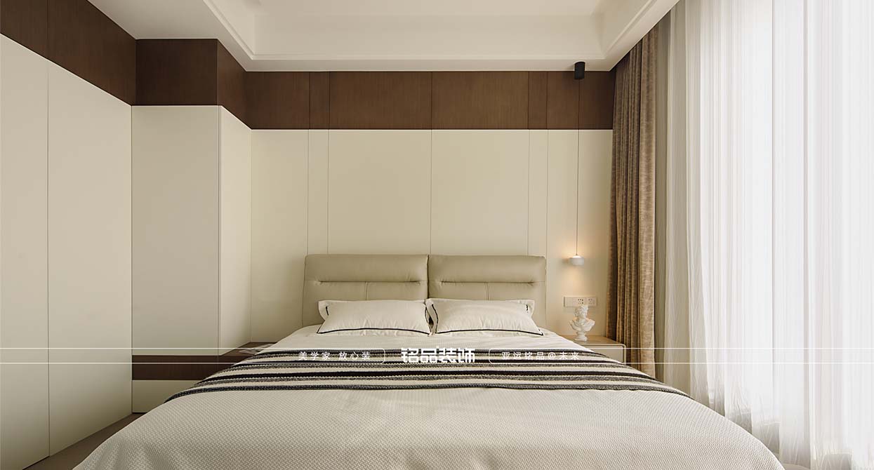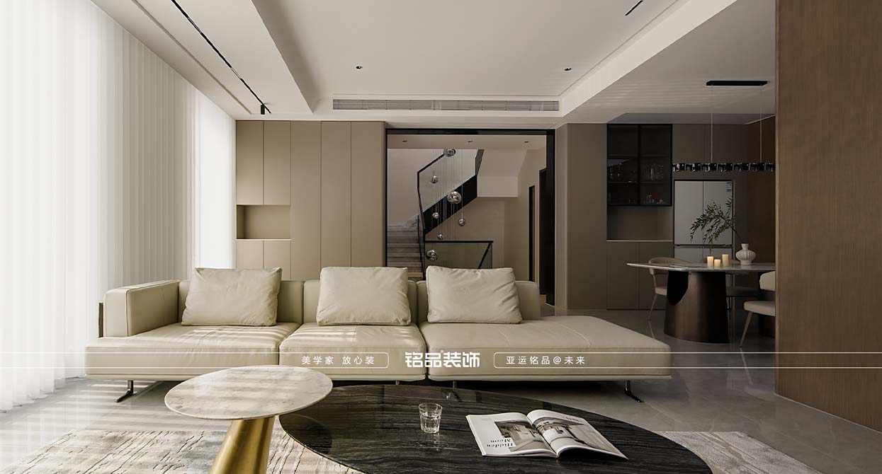裝修風(fēng)格現(xiàn)代意式,簡(jiǎn)潔及時(shí)尚大氣的特點(diǎn),搭配深色木飾面,石紋地磚,黑金金屬米色藝術(shù)漆等材質(zhì),營造出時(shí)尚大氣的空間。