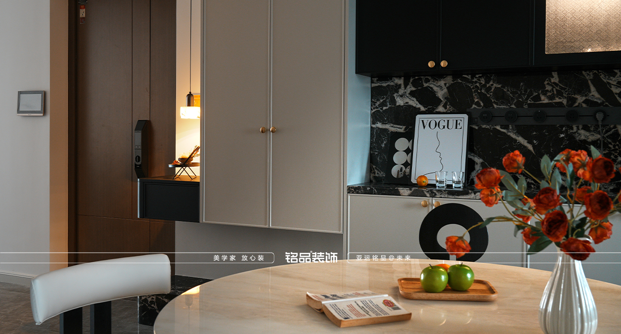 在平面布局上,原布局的餐廳狹長,客廳空間不夠大,如果按照傳統(tǒng)布局做玄關(guān)柜則又顯得局促,通過局改敲掉了玄關(guān)墻垛和客廳移門,并且拓寬了餐廳面積,從而讓整個客餐廳及玄關(guān)的通透感大大增強,原來狹長的餐廳如果做餐邊柜會更加擁擠,改造之后不僅可以放下圓桌,還可以做個強收納功能的餐邊柜