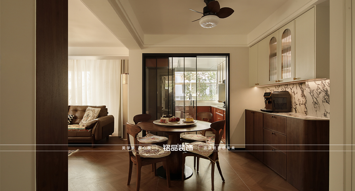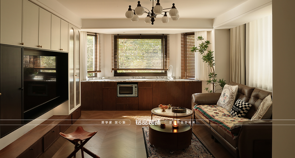 清怡花苑裝修中古復(fù)古風(fēng)格,有品有內(nèi)核,石材用了寶格麗2.0厚度做單層巖板,客廳用了胡桃木地板磚,定制柜用黑胡桃木與淺色柜板,加部分的圓弧木飾面,層高無(wú)優(yōu)勢(shì)所以都是保留原頂做了造型燈具烘托中古風(fēng)格。做了大面積的收納空間符合業(yè)主的收納需求,顏色素雅重色,體現(xiàn)平層空間的面積延伸
