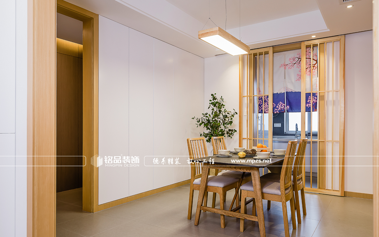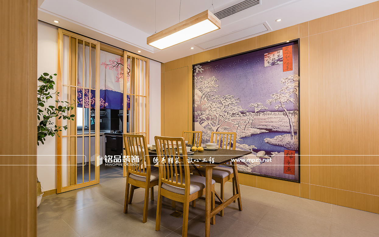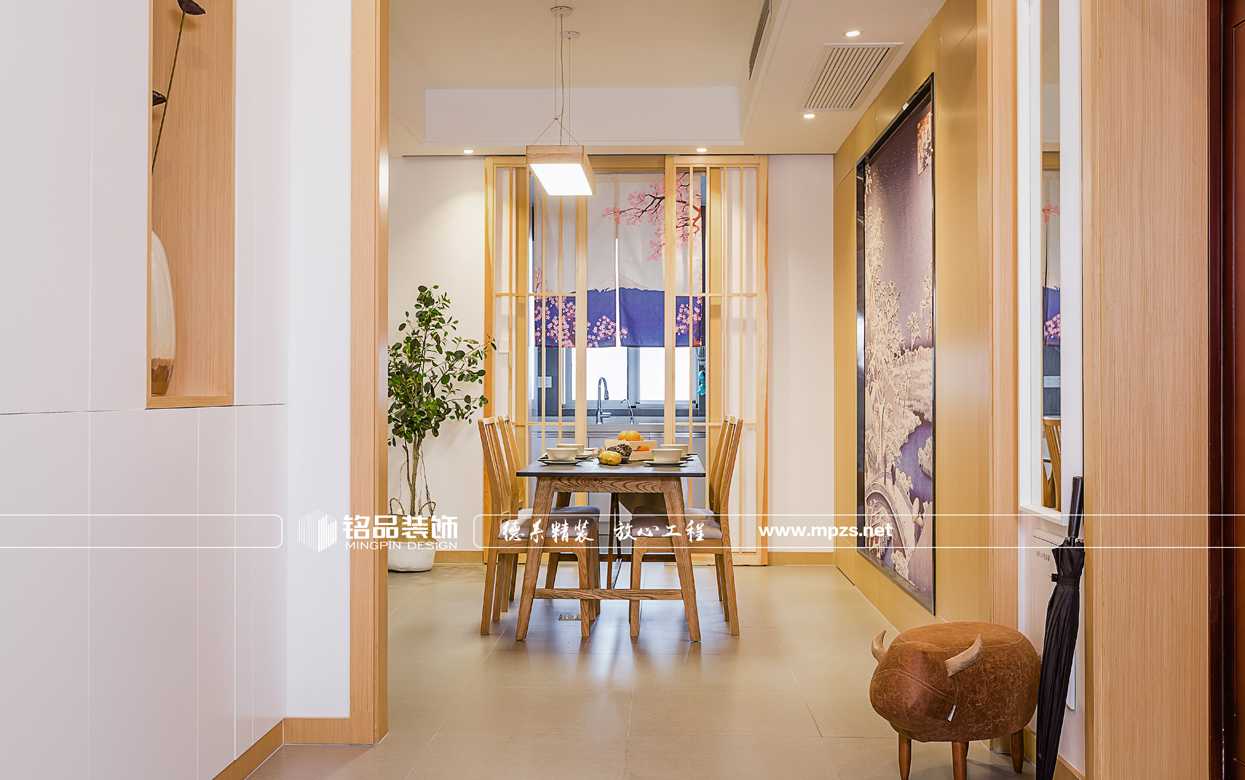 門廳玄關(guān)鞋柜加深的設(shè)計大大提高了儲納收藏的空間,因?yàn)椴蛷d空間有衛(wèi)生間、廚房、和兩個通道,比較破碎,故此在餐廳空間的設(shè)計時 把衛(wèi)生間的的門與墻面做了隱形門的設(shè)計,壁畫也突出了日式的風(fēng)格。書房兼顧儲物收納、休閑娛樂以及睡眠的功能