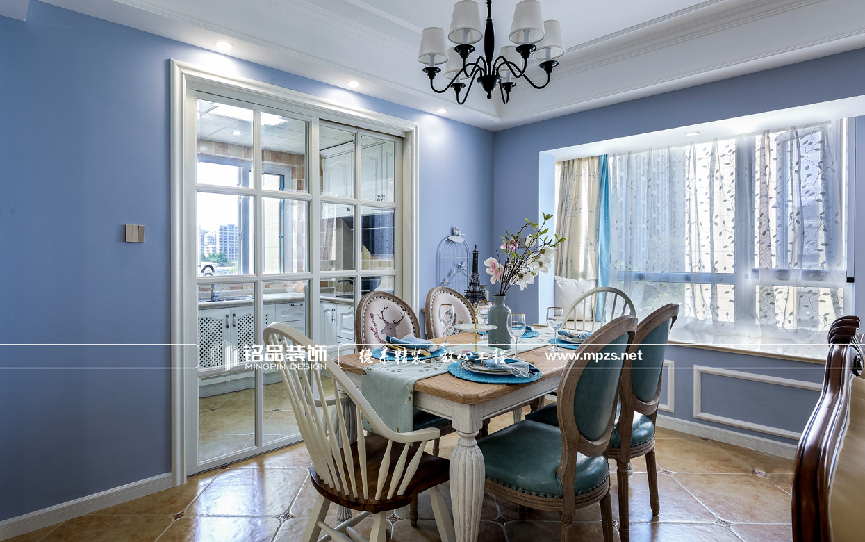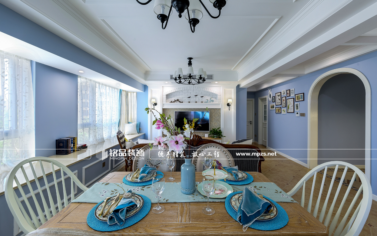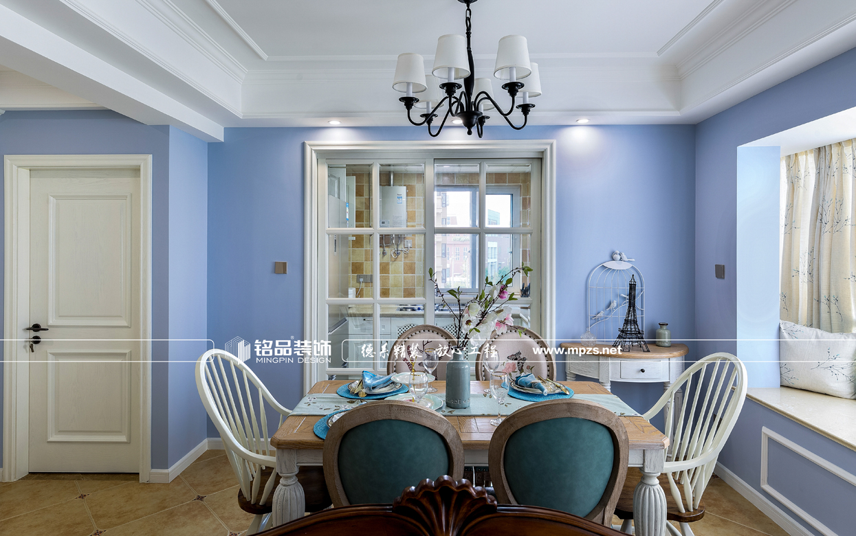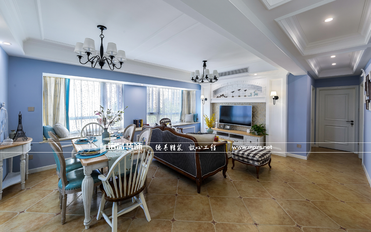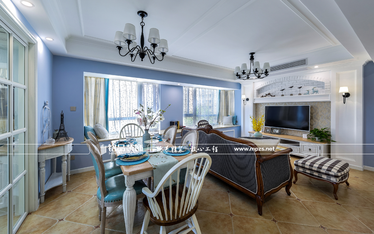 大面積使用了灰藍(lán)色的墻面,隔合了地中海的浪漫色彩,體現(xiàn)出了業(yè)主活躍的性格。原先通透的廳通過門洞的處理,既隔出了玄關(guān)又增加了亮點(diǎn),電視背景的處理,有了地中海的浪漫情結(jié),大飄窗的設(shè)計(jì)增加了客廳的視野空間。