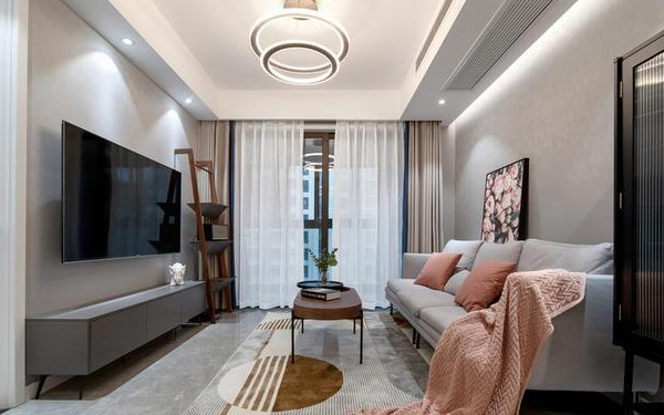 客廳灰調(diào)的空間里,用粉色做點綴色,在簡約的基礎(chǔ)突出甜美溫馨的氣息。吊燈以圓弧造型設(shè)計,加以筒燈相協(xié)調(diào),空間氛圍感十足,時尚而又不失質(zhì)感??妥酪阅鞠禐橹鳎右跃G植相搭,使空間清新自然,舒適感滿分~
