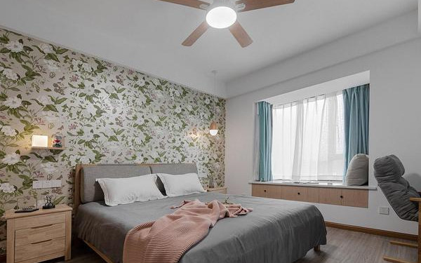 主臥背景墻采用大面積的花束元素,與簡單吊燈裝飾、木系家具相搭配,營造出清新自然,溫馨治愈的居住環(huán)境。床品、靠椅以灰色為主,平衡空間色彩,清新自然中有了一份休閑感~窗臺設(shè)計,更與空間相呼應(yīng),在家也能體驗出休閑度假的感覺~