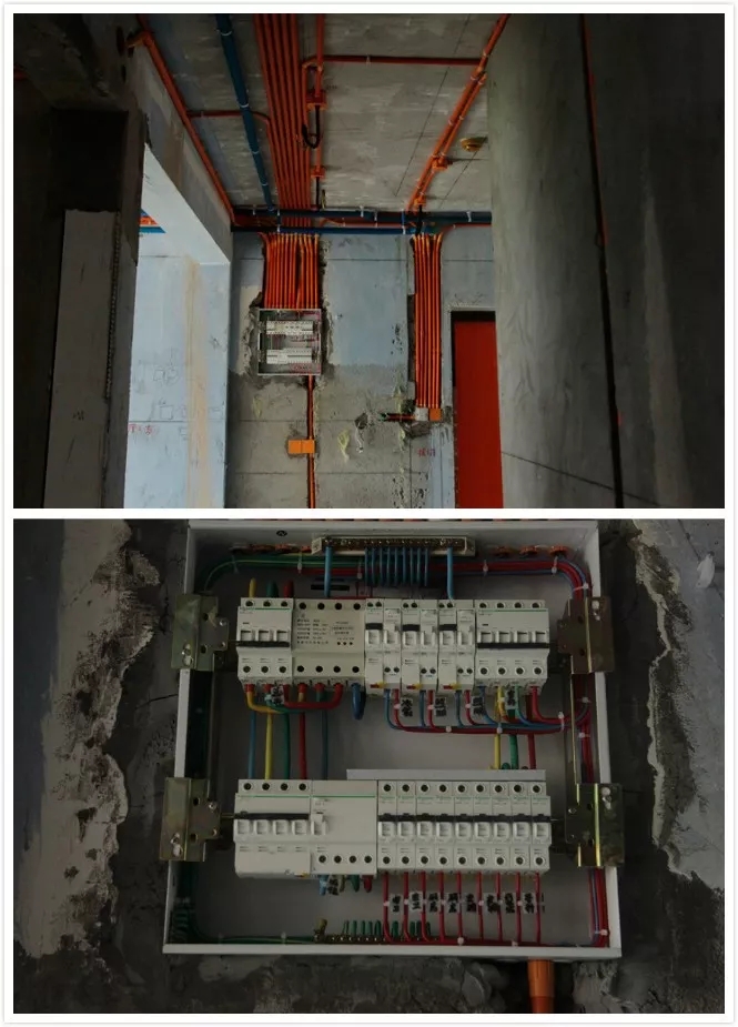 配電箱空氣開關(guān)設(shè)置應(yīng)與各用電回路的用電量來進(jìn)行計算并與線徑匹配;冰箱、衛(wèi)生間(廚房)、大功率設(shè)備設(shè)置單獨回路并帶漏電保護(hù)器;空氣開關(guān)采用銅排連接;箱體有安全重復(fù)接地;導(dǎo)線分色纏繞等。