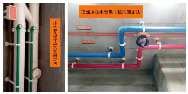 冷熱水管安裝左熱右冷,中心間距統(tǒng)一為150mm。頂面明管吊裝,不使用墻卡、墻鉤貼頂、貼墻固定,轉(zhuǎn)角150-200mm設(shè)只吊卡,其他吊卡間距≦600mm。給水管不得固定(捆扎)在排水管(件)上,嚴(yán)禁給水管與線管捆扎在一起。