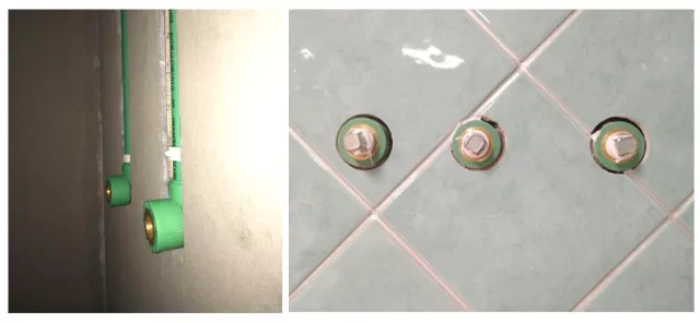 墻面給水管在預(yù)埋時(shí),應(yīng)考慮出水端口與墻磚面成品后相對(duì)持平狀態(tài),淋浴龍頭的端口宜低于墻磚2-3mm。在水管施工時(shí),應(yīng)將彎頭斷面調(diào)高于原墻面18-20mm左右,能基本滿足上述要求。此工藝主要是防止萬一絲口爆裂時(shí)能及時(shí)發(fā)現(xiàn)而不蒙受巨大損失。