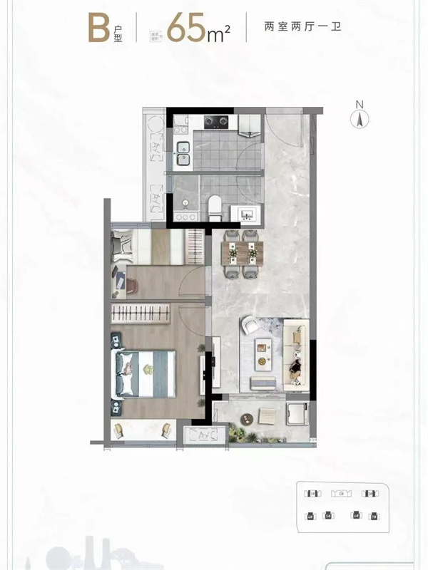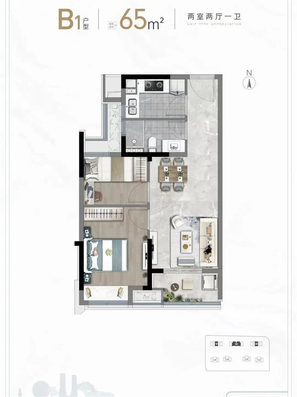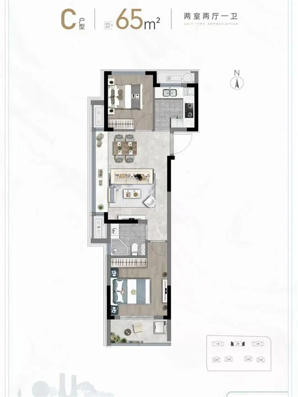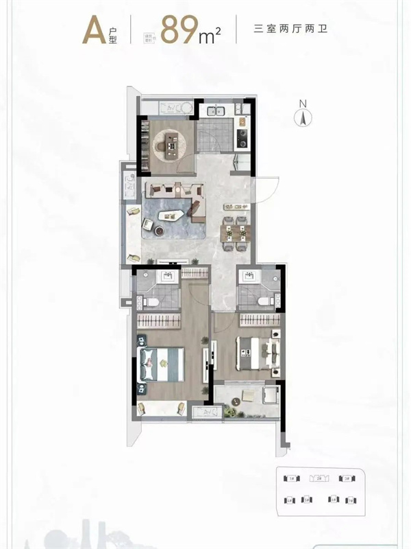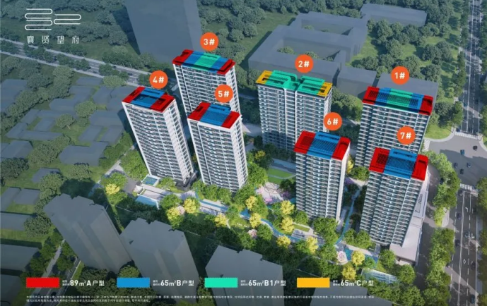 項目總用地面積約22824㎡,地上建筑面積約50212.8㎡,容積率2.2,總共632戶,預計交付時間為2025年6月。整個小區(qū)由7幢18-19層的純住宅組成,住宅層高3米,架空層4.2米,主體建筑采用真石漆,層間線條鋁板為主,首層大部分采用石材+鋁板,玻璃面采用LOW-E新型窗系統(tǒng),立面簡潔現(xiàn)代,更適合年輕人居住。戶型分為建筑面積約65㎡、89㎡兩個產(chǎn)品面積段。其中建面約65m2戶型420套,建面約89m2戶型212套;