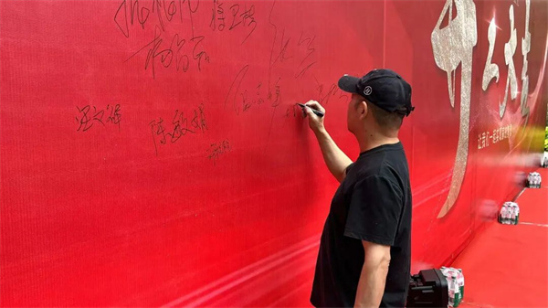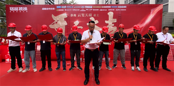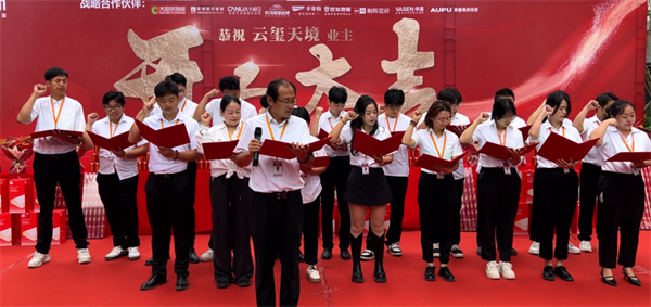 緊接著,品牌合作商、工程團(tuán)隊(duì)、設(shè)計(jì)師、銷(xiāo)售集體宣誓,他們整齊排列,神情莊重,右手握拳高舉,齊聲宣誓: