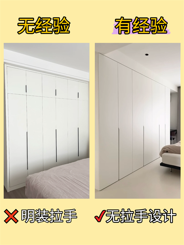 設(shè)計(jì)建議:追求整體感和易打理,首選隱形設(shè)計(jì)。若選擇明裝拉手,建議挑選圓潤、線條簡潔的款式。