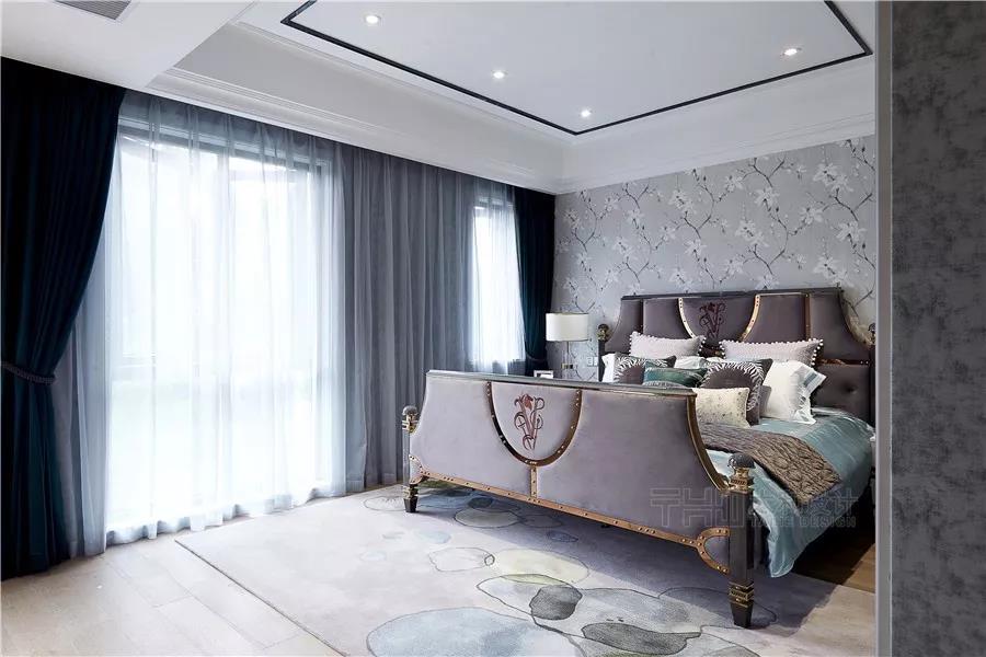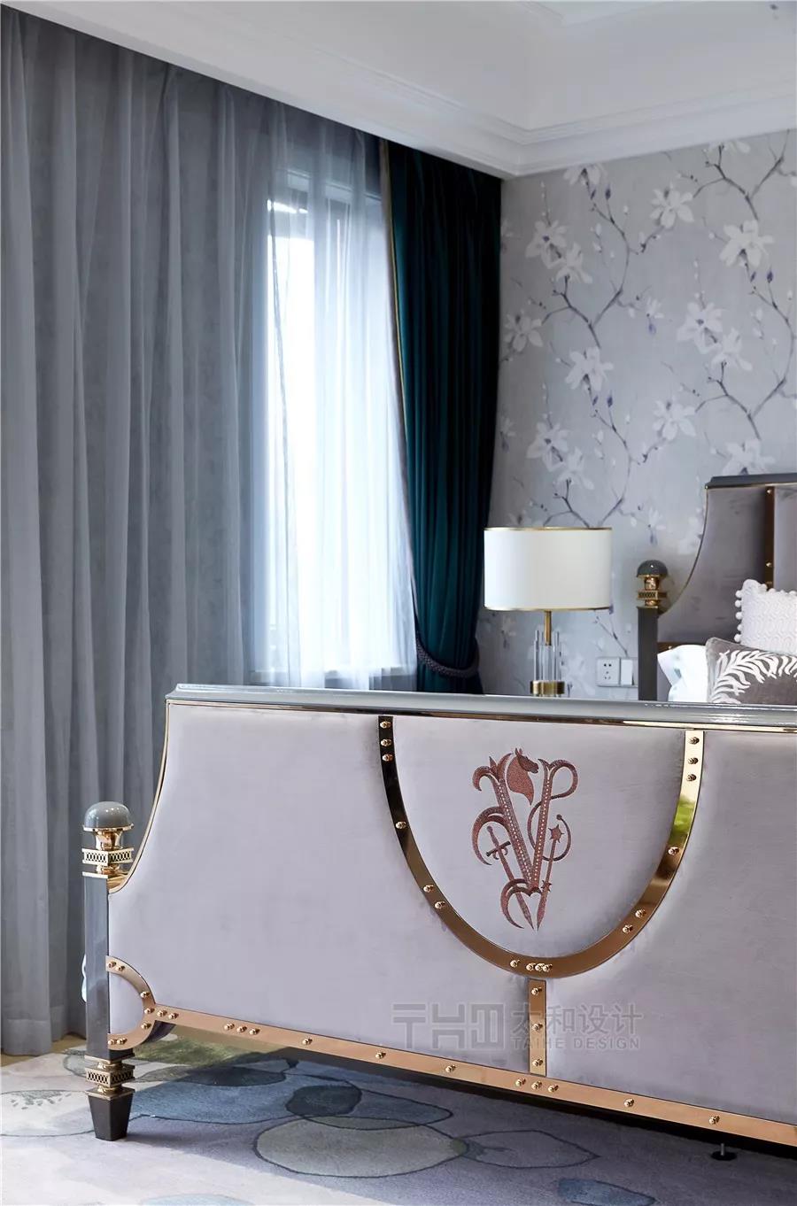 父母房使用了相對(duì)端莊沉穩(wěn)的灰色,帶花朵圖案的壁紙素凈高雅。