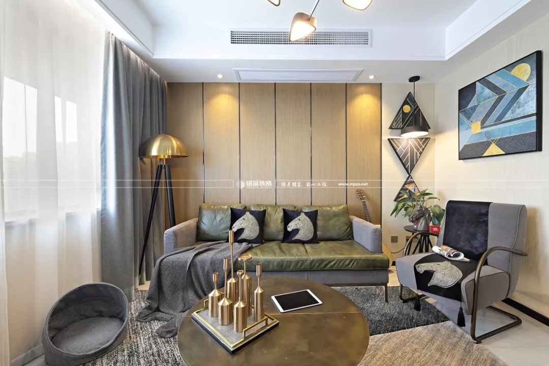 空間內(nèi)基本以素色墻紙為主裝飾,沙發(fā)背后用木飾面加以融合,既呼應(yīng)了廚房的柜門又顯得空間柔美。