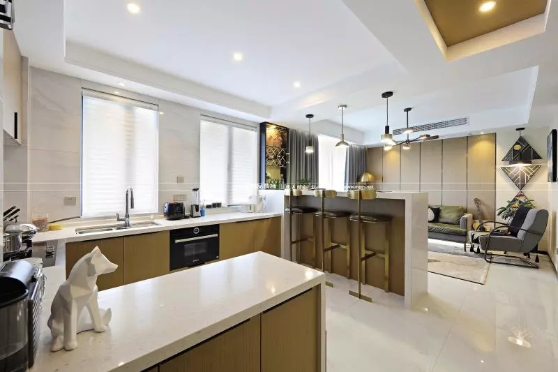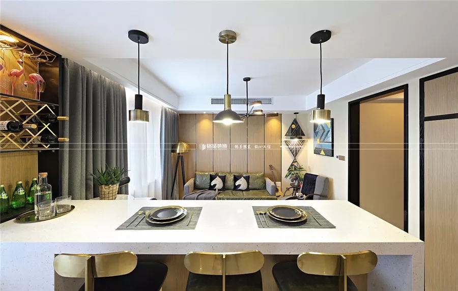 原客餐廳空間比較狹小,所以設(shè)計上把廚房餐廳客廳三者融為一體,既能滿足年輕人生活所需,又顯得空間寬敞。