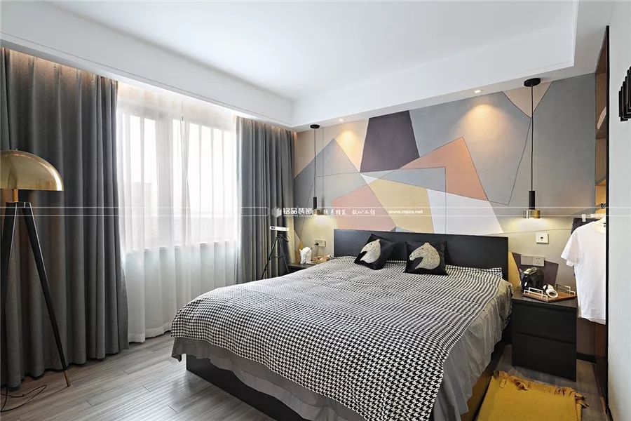 簡約風(fēng)格的臥室不像歐式風(fēng)格,首先不能沒有亮點,也不像歐式一樣琳瑯滿目的墻面造型,所以床后背采用定制彩色墻紙。