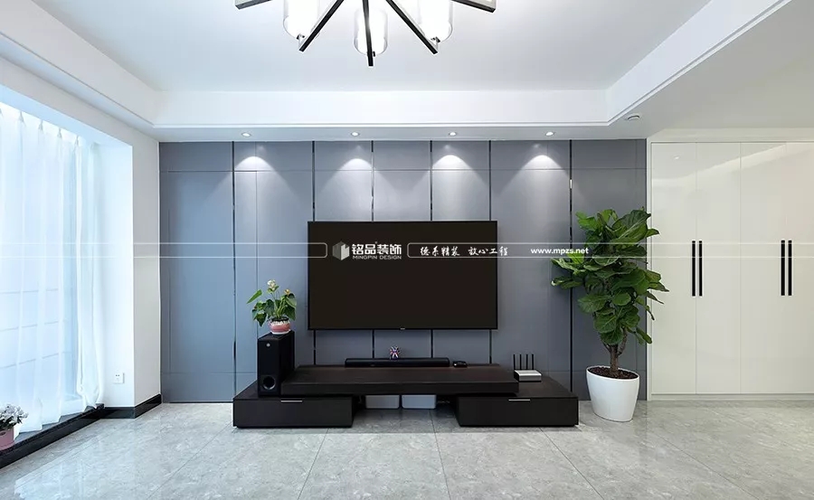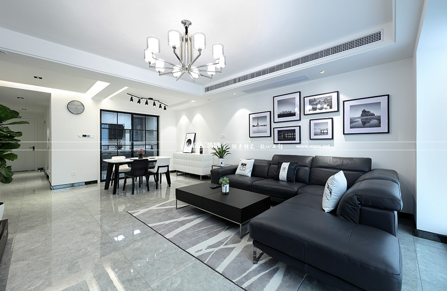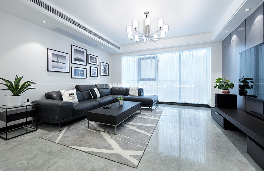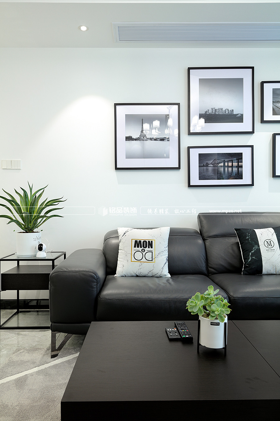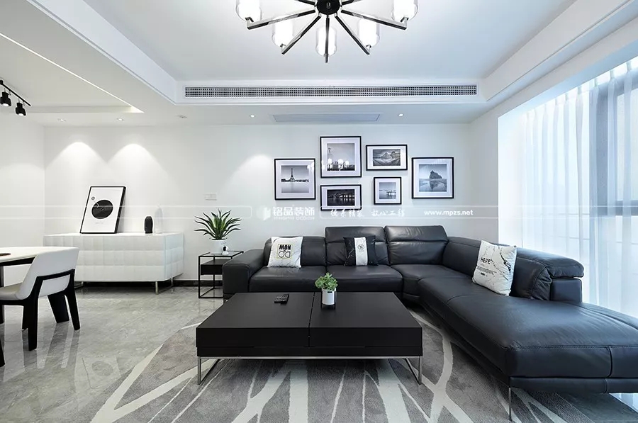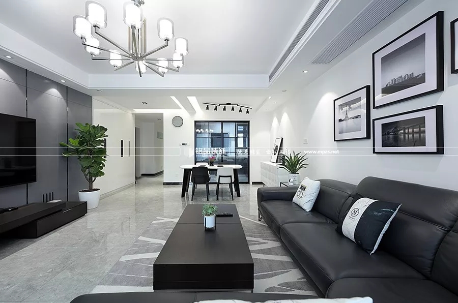 大白墻、組合掛畫、精妙的電視柜,黑色真皮沙發(fā)、深色茶幾,