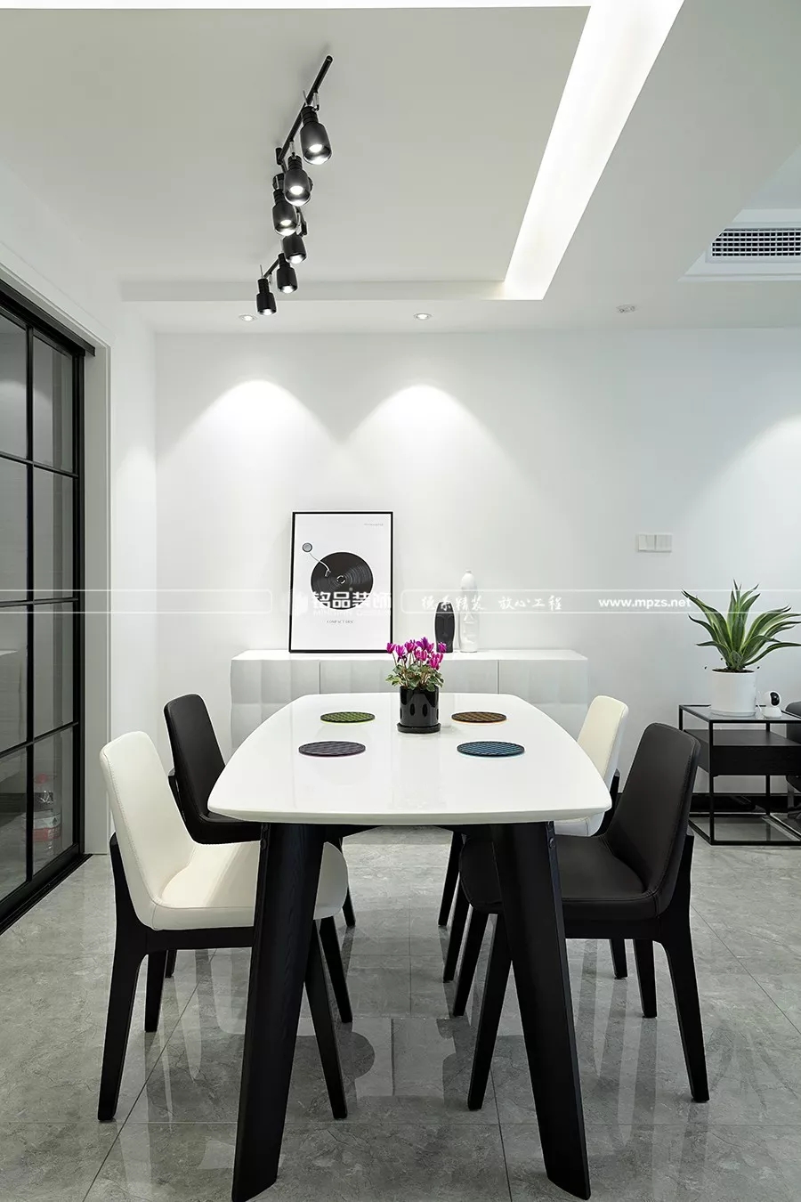 客廳的另一頭便是餐廳,黑白色餐椅交錯(cuò)擺放,