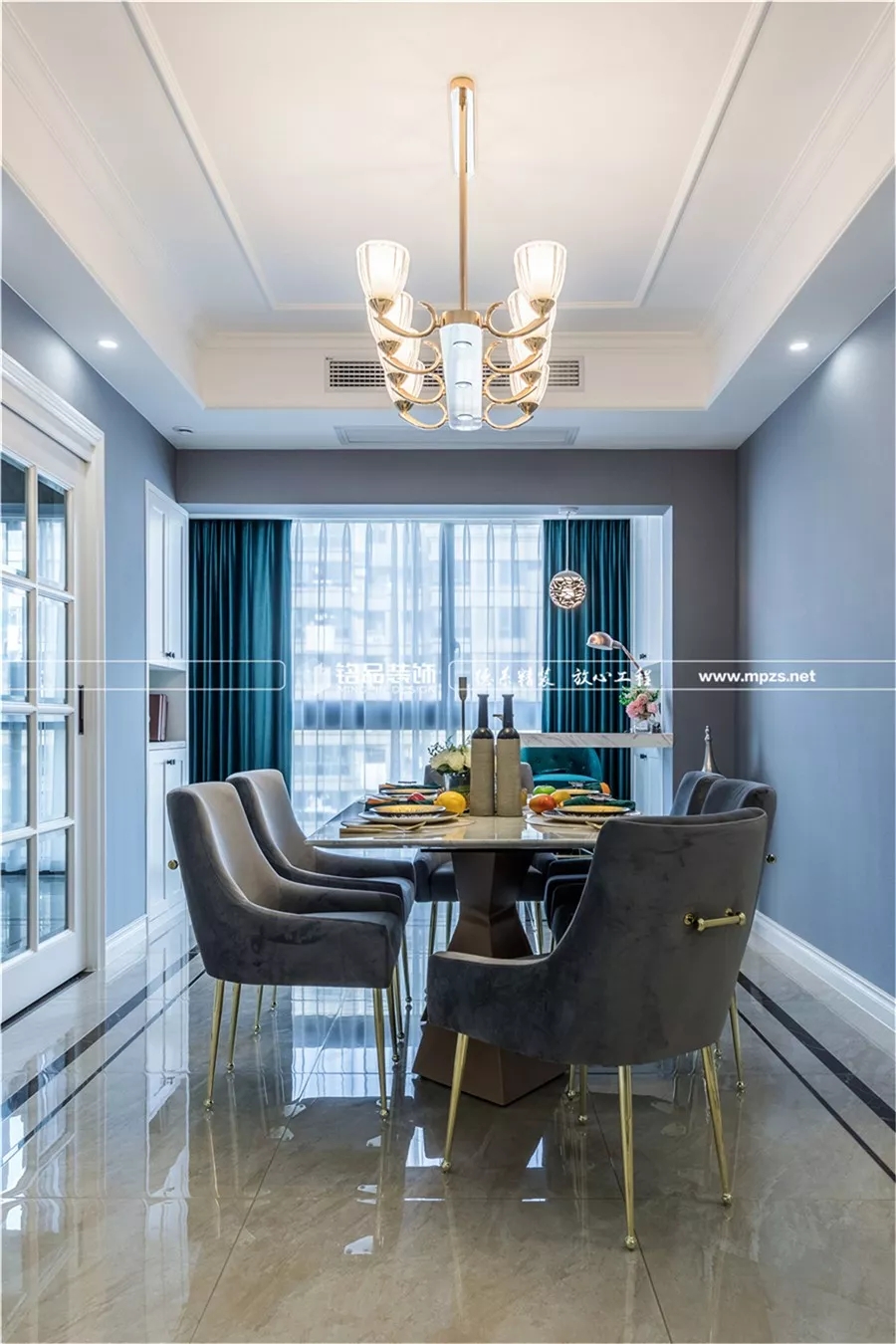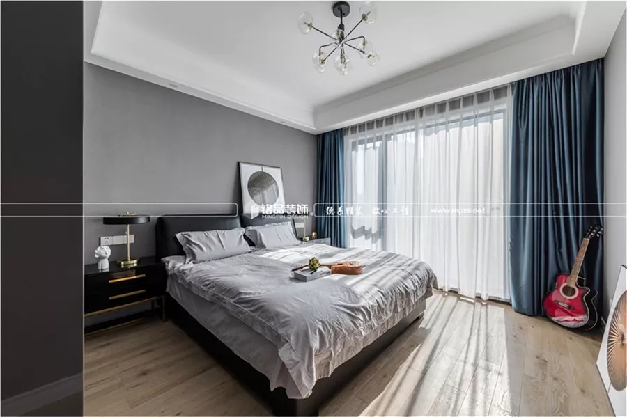 淺灰藍(lán)的墻面,搭配木飾面線條,干凈利落,光線透過(guò)落地窗輕巧地照在室內(nèi),顯得空間愈發(fā)敞亮。