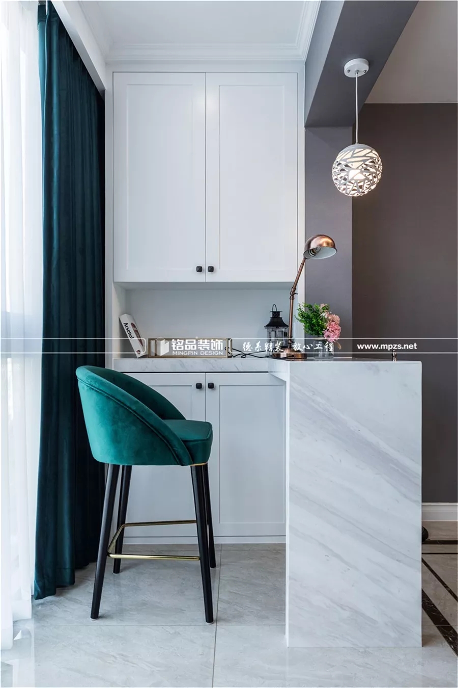 一個(gè)精巧的吧臺(tái),又可以作為工作臺(tái)使用,燈光的設(shè)計(jì)足夠晚上安靜的閱讀一本書。
