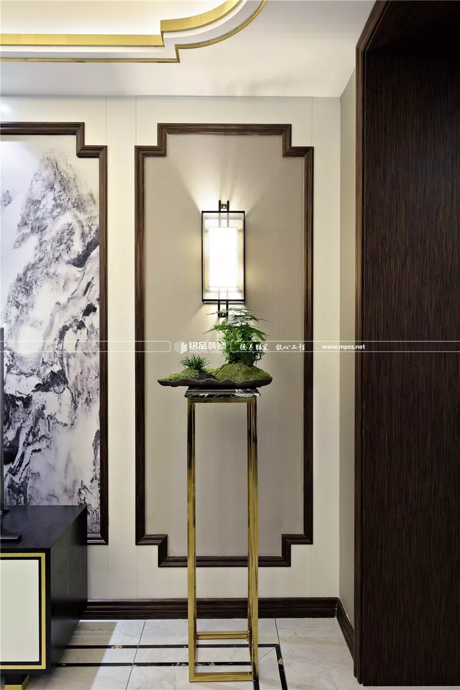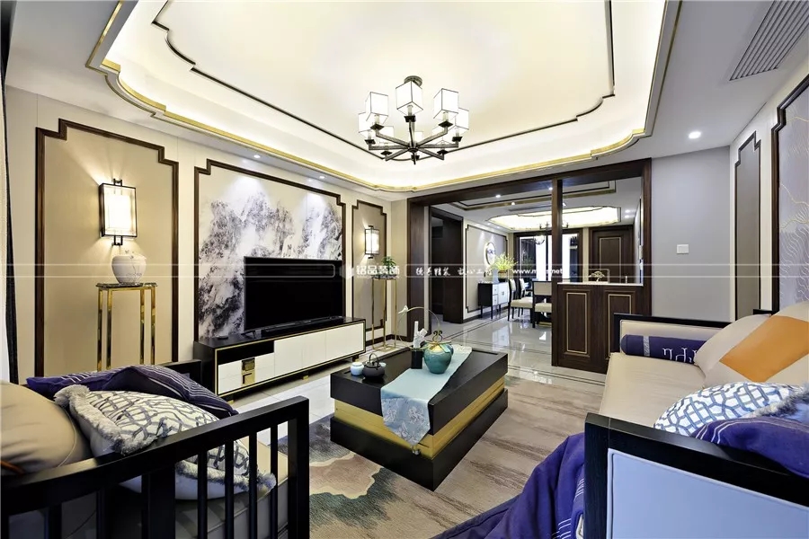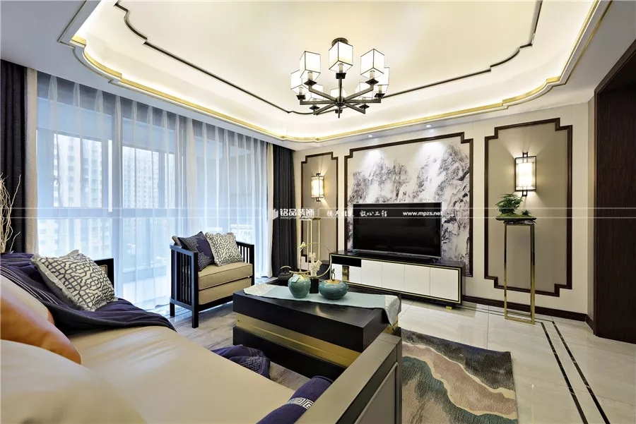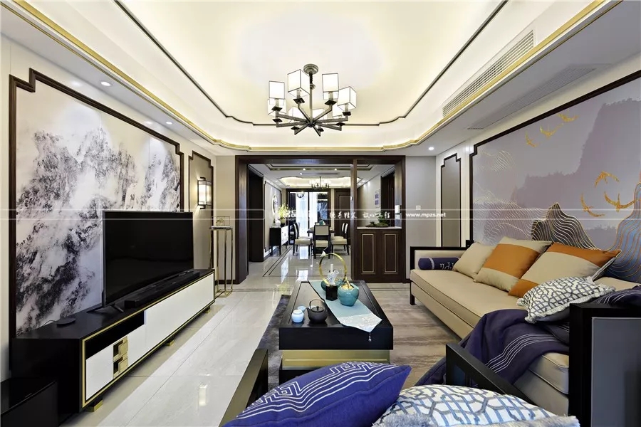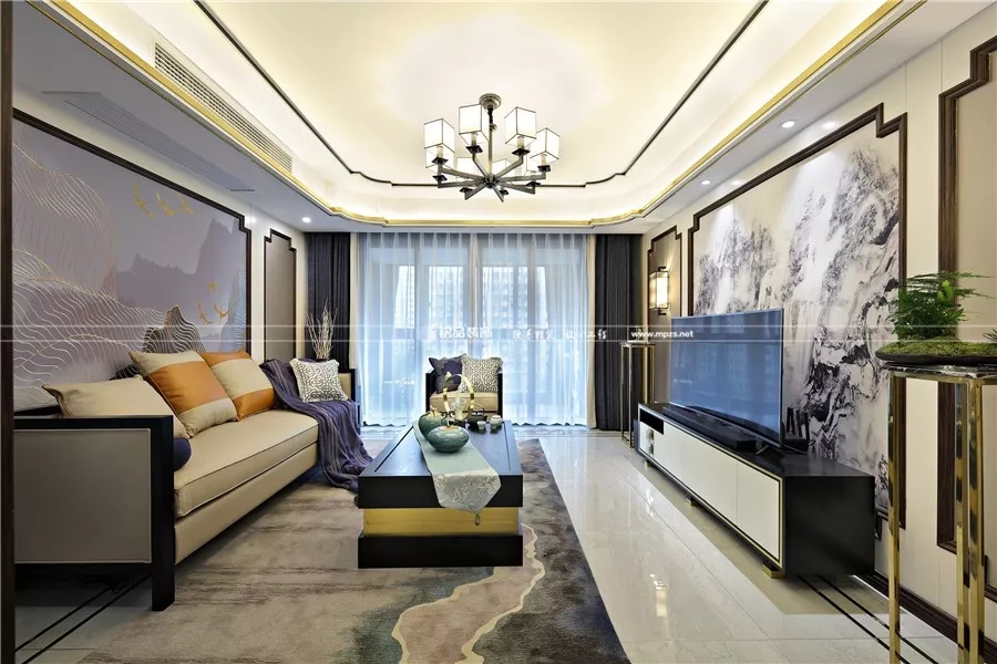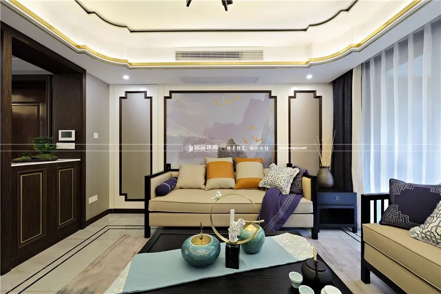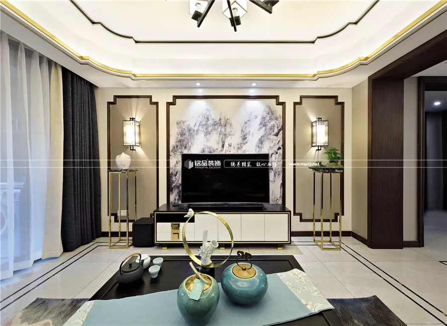 客廳的背景墻,用帶著中式韻味的線條造型作為支撐,中間是精心挑選的水墨畫墻布,素雅大方。只見你笑魘如花,淺淺的梨渦蕩漾著歡喜。