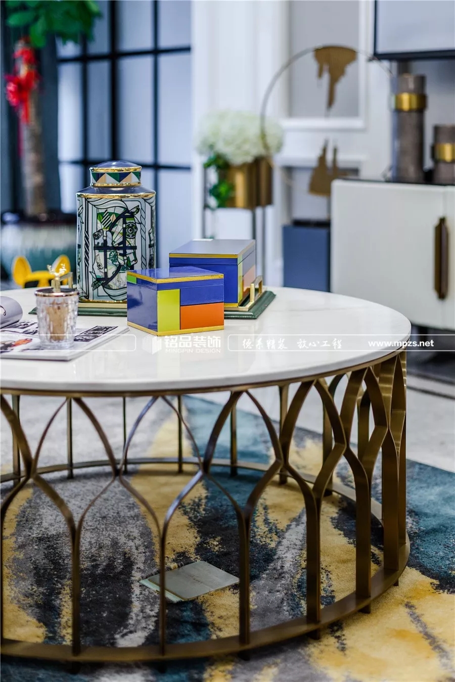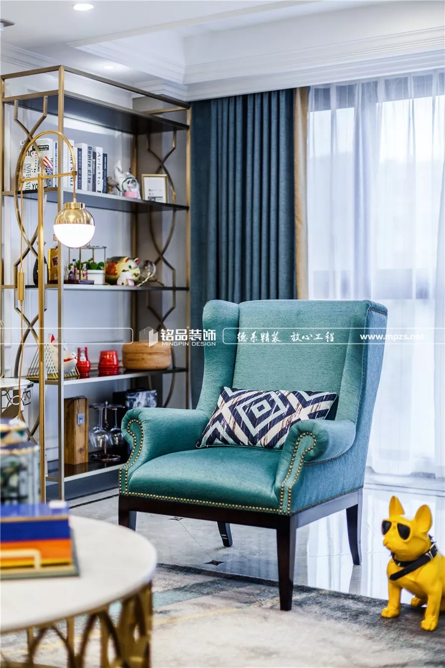 現(xiàn)代造型的落地燈、極富設計感的黃銅茶幾、沙發(fā)上的鉚釘,都透著設計師和主人不俗的品味。