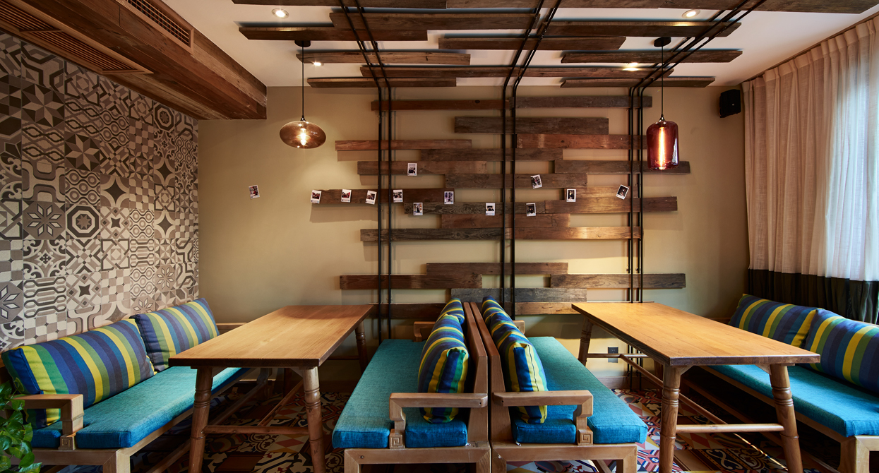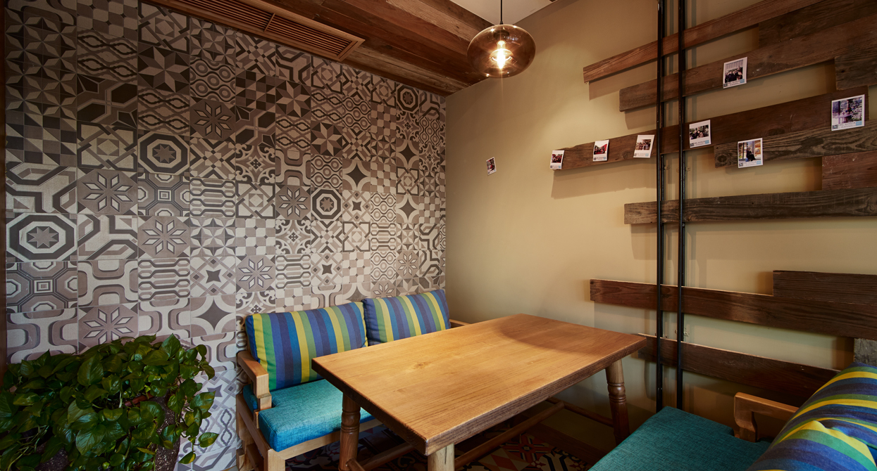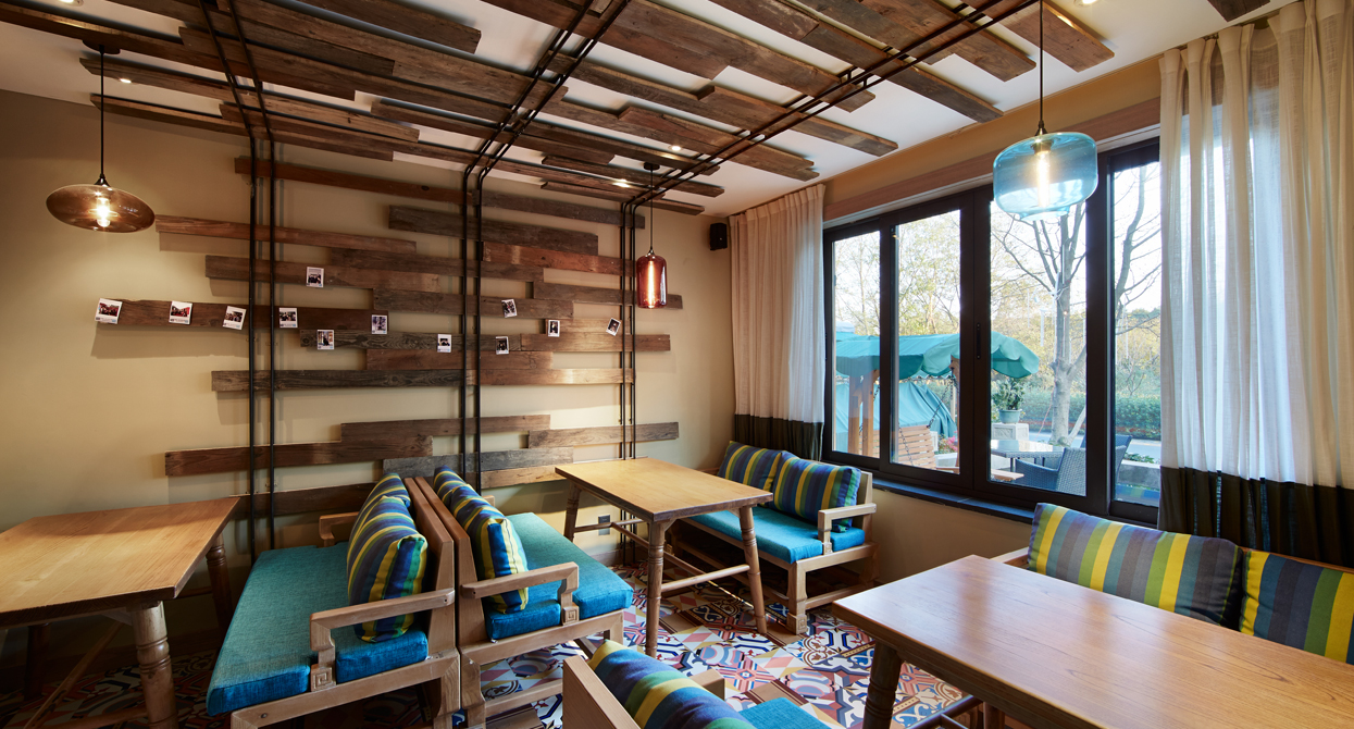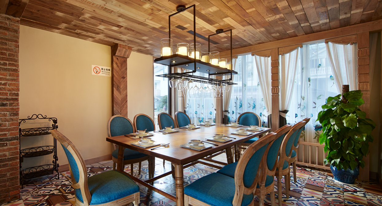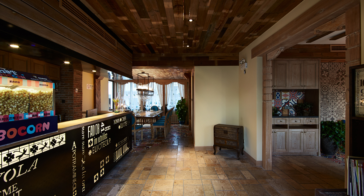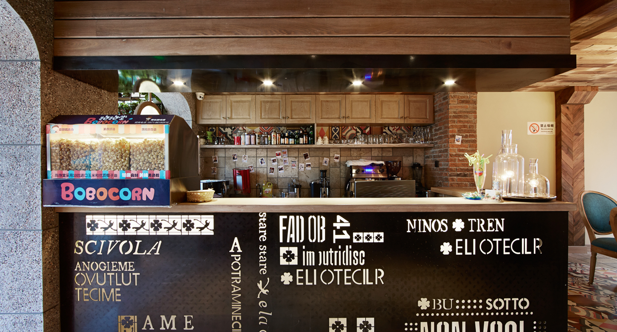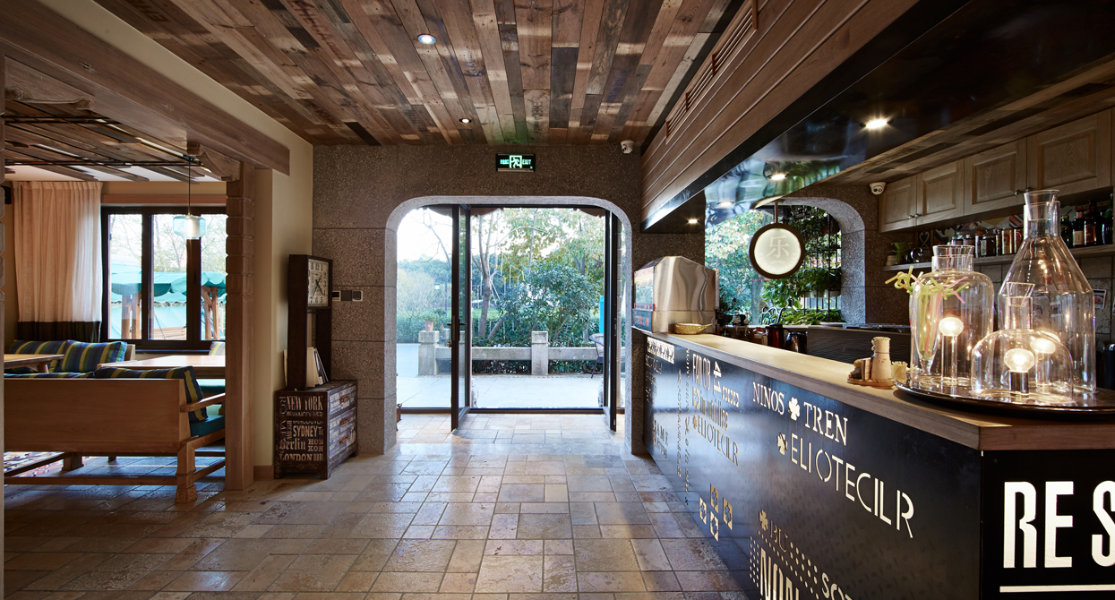 一樓散客用餐區(qū):入門處水洗石的拱形造型吸人眼球,吧臺處刻字的鏤空的鐵片配上原色的老木頭造型體現(xiàn)了設(shè)計(jì)的獨(dú)具匠心。地面上的花磚的造型起到了很好的引導(dǎo)作用。我想路過的游客會帶著對靈隱寺的虔誠之心,帶著些許疲憊來此處喝杯咖啡,沐浴著陽光,遠(yuǎn)離工作的壓力,慵懶的坐上一會。
