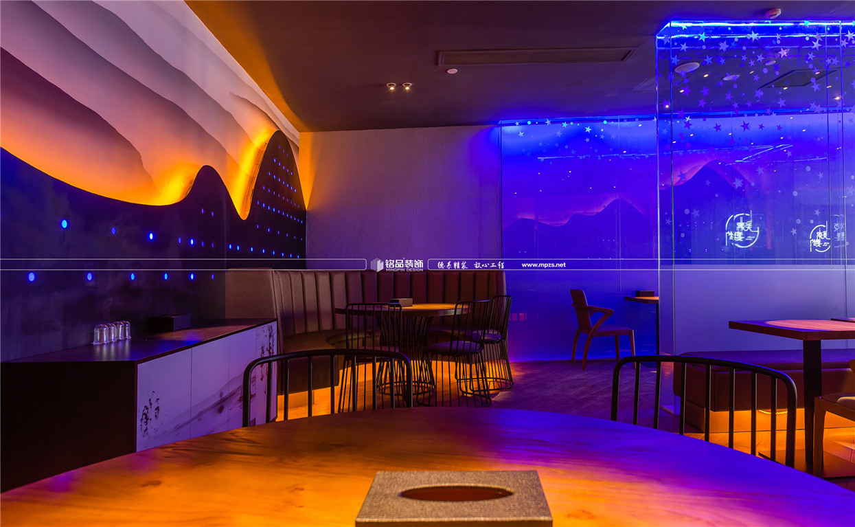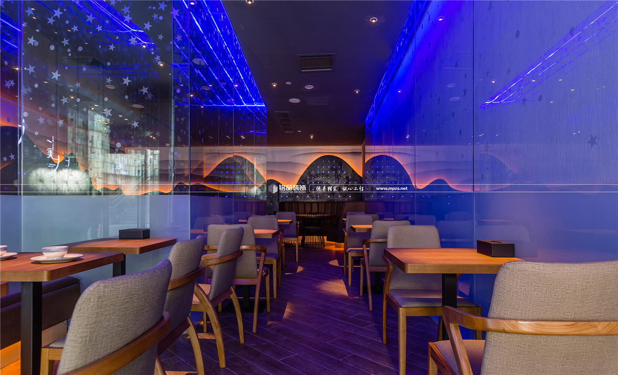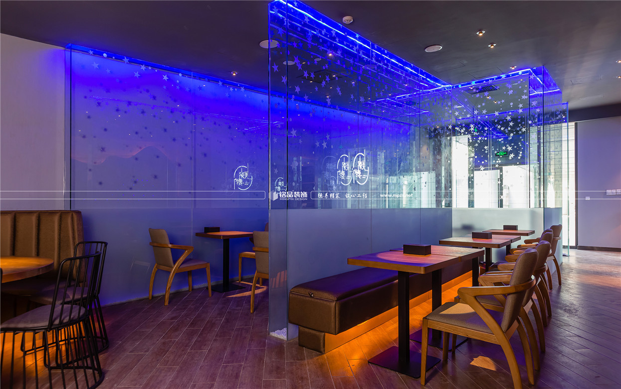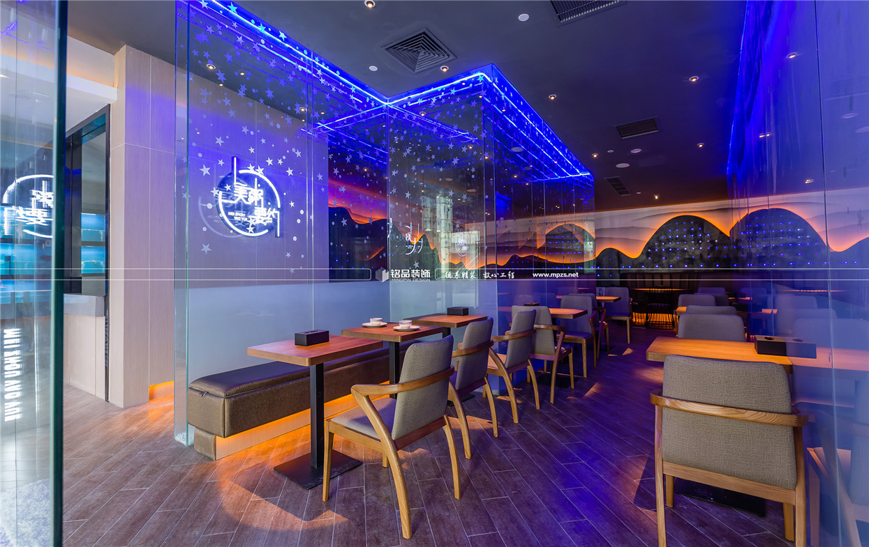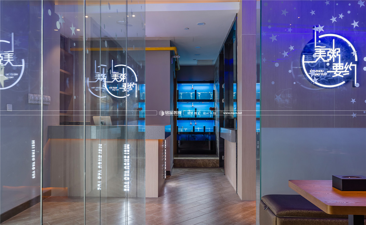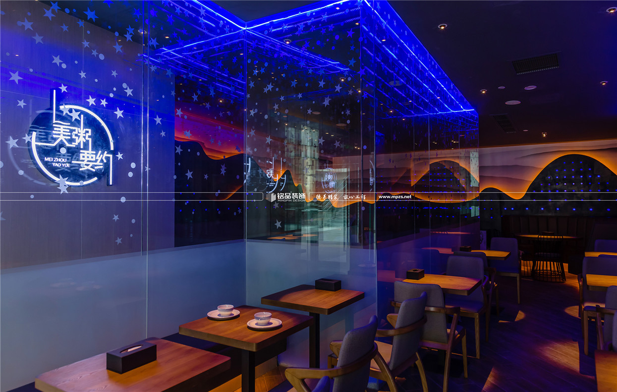 杭州大廈武林廣場商美粥要約餐飲連鎖店的老板是一個80后,在餐廳裝修上追求創(chuàng)新,很有情懷的希望客人到店可以留下獨特的記憶,也可以合照留影,設(shè)計師考慮到主推的是海鮮粥,所以在設(shè)計上把店鋪整體氛圍營造出海洋世界的味道,用了大量玻璃和藍(lán)色燈帶,讓空間有晶瑩剔透的感覺,墻面上的鐵板做成了山峰的造型,配上絲絹打印的山水,給人寧靜致遠(yuǎn)的感覺,在主題藍(lán)色燈帶的烘托下,配上黃色暖光的小燈,讓色彩冷暖平衡
