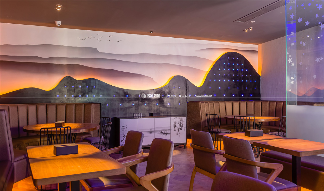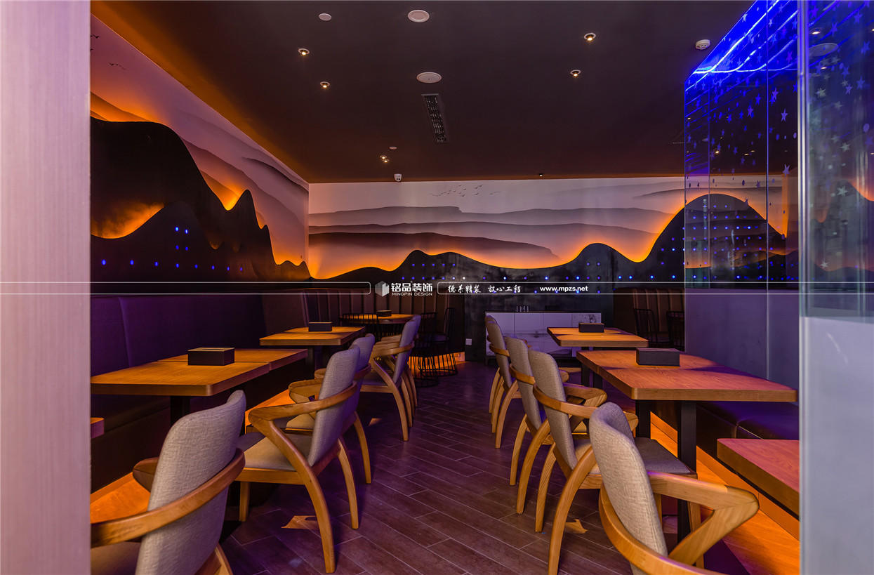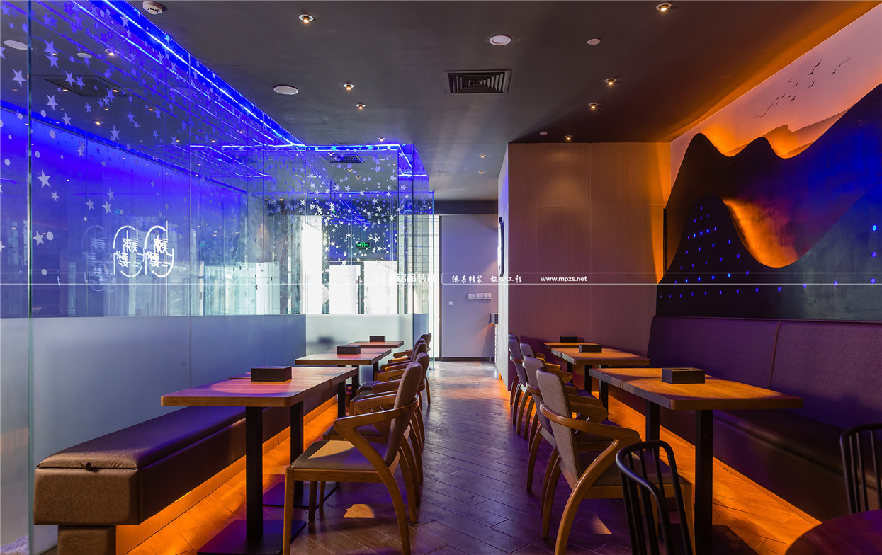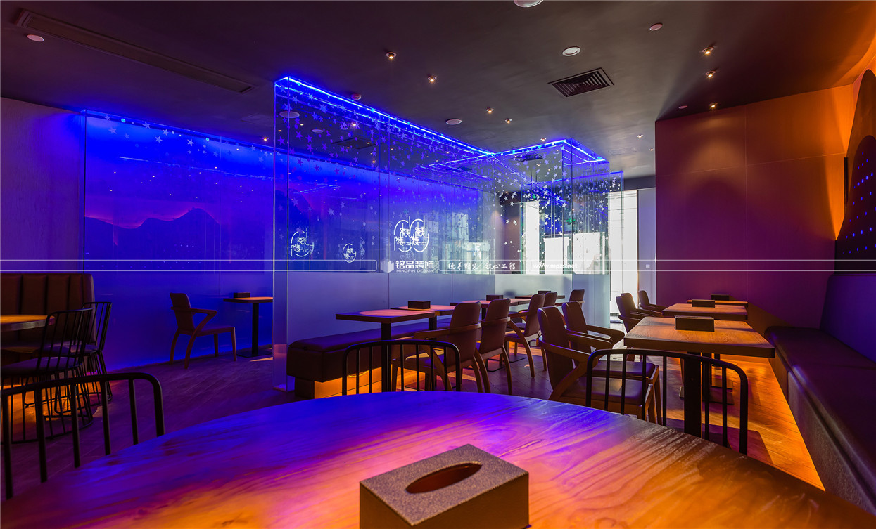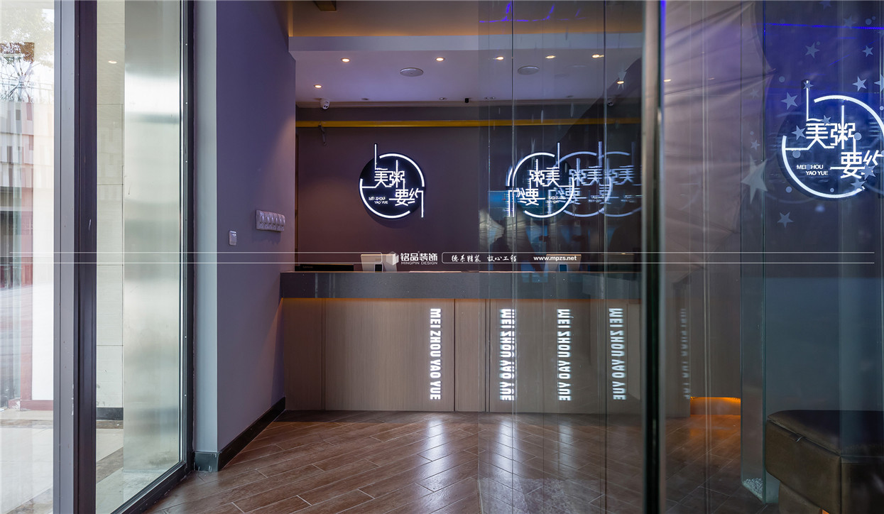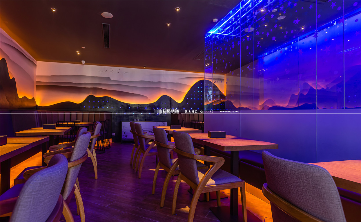 杭州大廈武林廣場商美粥要約餐飲連鎖店的老板是一個80后,在餐廳裝修上追求創(chuàng)新,很有情懷的希望客人到店可以留下獨特的記憶,也可以合照留影,設(shè)計師考慮到主推的是海鮮粥,所以在設(shè)計上把店鋪整體氛圍營造出海洋世界的味道,用了大量玻璃和藍(lán)色燈帶,讓空間有晶瑩剔透的感覺,墻面上的鐵板做成了山峰的造型,配上絲絹打印的山水,給人寧靜致遠(yuǎn)的感覺,在主題藍(lán)色燈帶的烘托下,配上黃色暖光的小燈,讓色彩冷暖平衡