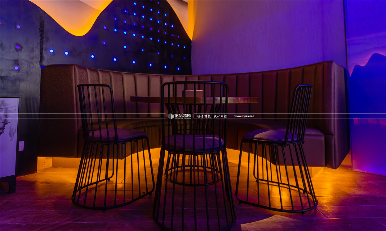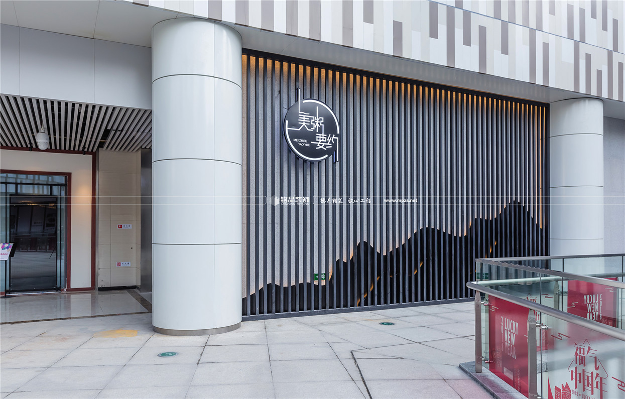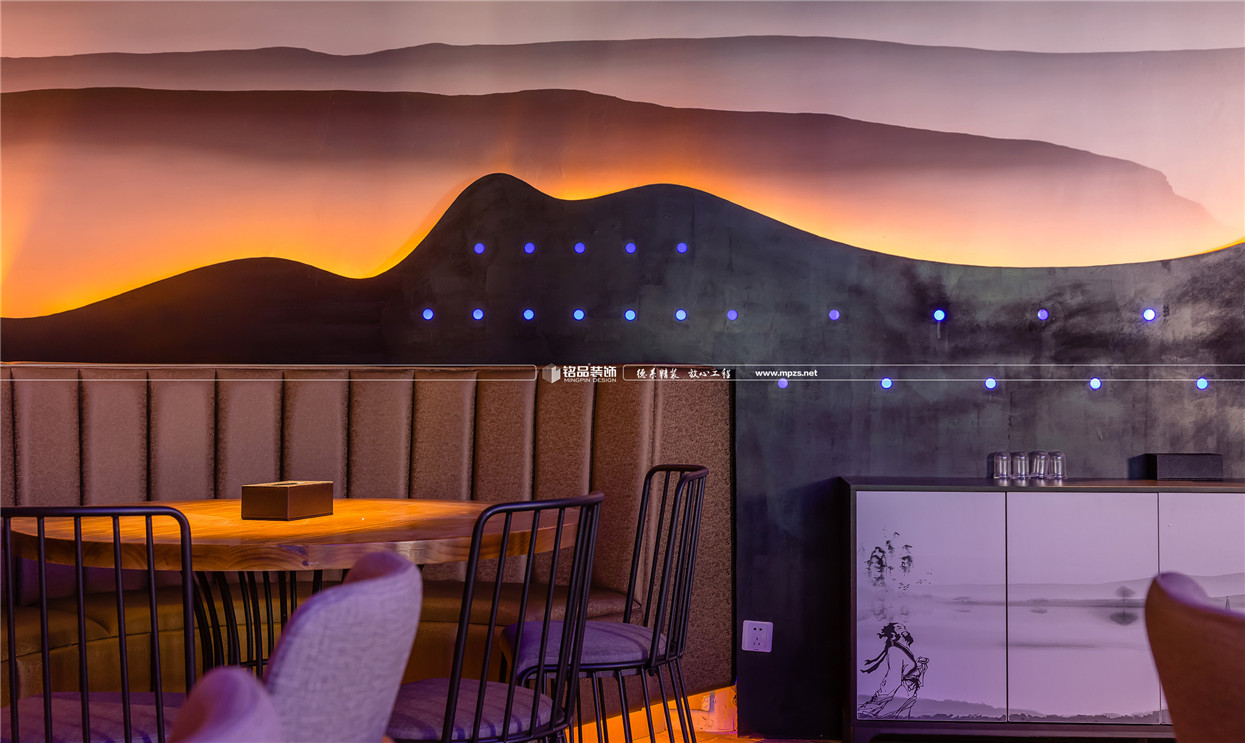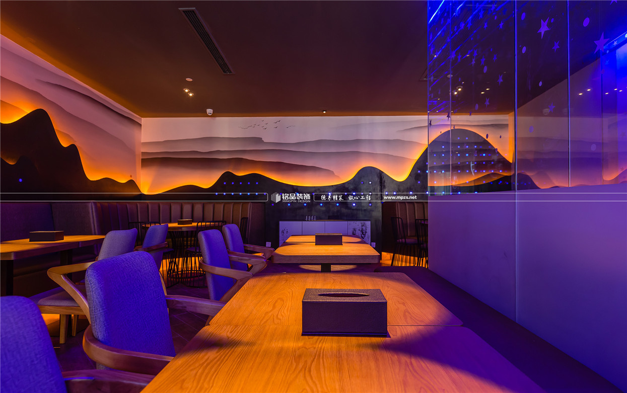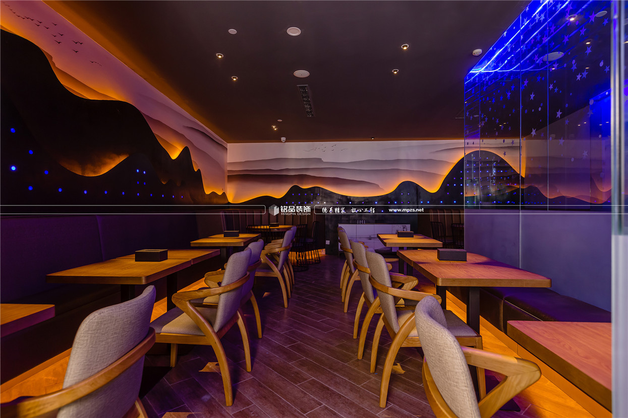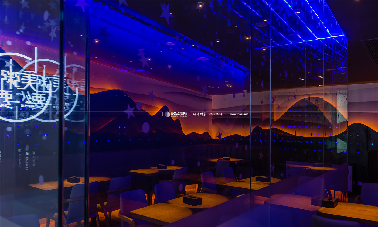 杭州大廈武林廣場商美粥要約餐飲連鎖店的老板是一個80后,在餐廳裝修上追求創(chuàng)新,很有情懷的希望客人到店可以留下獨特的記憶,也可以合照留影,設(shè)計師考慮到主推的是海鮮粥,所以在設(shè)計上把店鋪整體氛圍營造出海洋世界的味道,用了大量玻璃和藍(lán)色燈帶,讓空間有晶瑩剔透的感覺,墻面上的鐵板做成了山峰的造型,配上絲絹打印的山水,給人寧靜致遠(yuǎn)的感覺,在主題藍(lán)色燈帶的烘托下,配上黃色暖光的小燈,讓色彩冷暖平衡